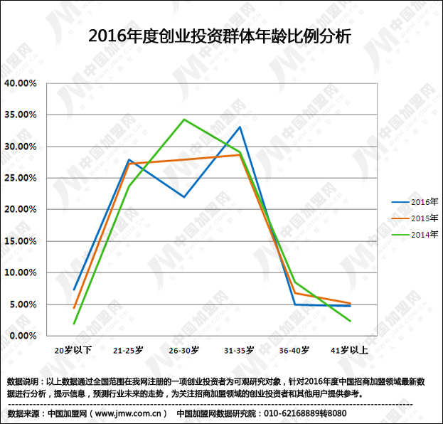 根据中国加盟网数据研究院数据显示,2016年创业人数增长迅速,创业投资群体呈年轻化趋势。2016年创业投资群体平均年龄为28.9岁,而在2010年,这一数字为38.2岁。26岁~35岁的创业投资群体占比超过六成,为创业人数最多的群体,而在2014年之前,35岁~40岁创业投资群体为创业人数最多的群体。