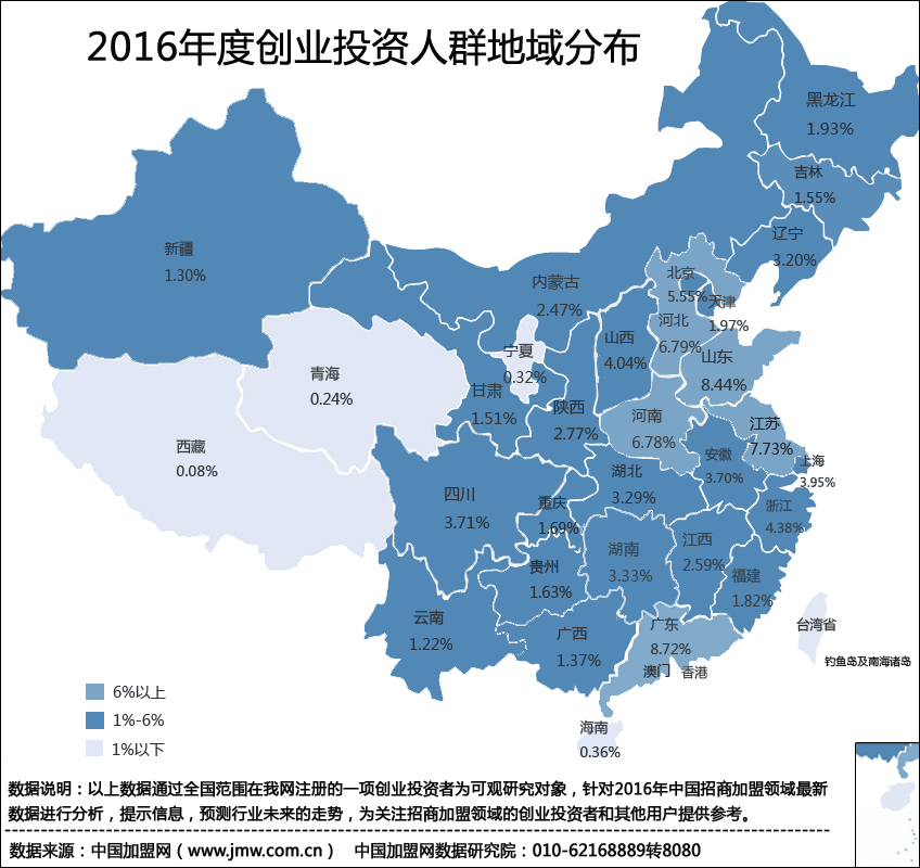 根据中国加盟网数据研究院的数据显示,2016年创业投资群体全国分布大致可分为三大创业集团,东部沿海省区是大众创业的第一集团,大部分中部地区及北部地区为第二集团,西部地区为第三集团。