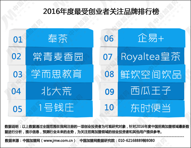 根据中国加盟网数据研究院的数据调研显示,2016年度中国加盟网最受创业者关注的十大加盟品牌分别为奉茶、常青麦香园、学而思教育、北大荒绿色食品、1号钱庄、企易+、Royaltea皇茶、鲜饮空间饮品、西瓜王子童装、东时便当。从以上的十大上榜加盟品牌我们不难看出,餐饮行业占据半壁江山,而饮品项目占据三席,足以见得餐饮行业项目受创业者的欢迎程度。唯一服装行业的上榜品牌来自童装品牌西瓜王子,其以投资成本小等优势脱颖而出。上榜品牌零售行业代表北大荒绿色食品,以地方产品为特色,能够满足中高端市场消费需求,同时,北大荒品牌拥有多种加盟模式,标准店、旗舰店、渠道商、社区店等经营模式可供创业者灵活选择。