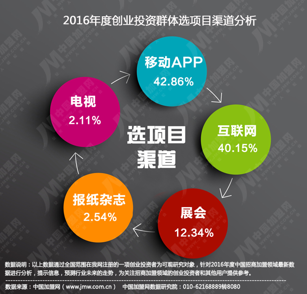 根据中国加盟网数据研究院的调研结果显示,移动互联网正逐渐成为创业者投资选项目的主要渠道。在上半年的数据统计中,移动互联网赶超PC网络的趋势就已逐步呈现开来,而在下半年中,通过移动互联网方式寻找创业项目已成为最受创业欢迎的渠道选择方式,手机找项目简单便捷。而展会渠道作为线下找项目的最佳渠道之一,同样深受创业者喜爱,展会渠道唯一的优势是创业者与品牌见可以面对面来直击品牌的投资价值。