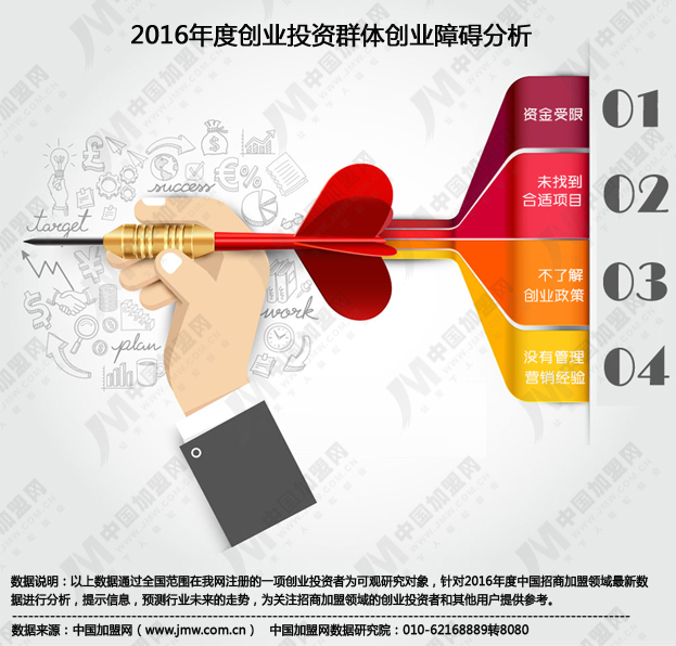 据中国加盟网数据研究院的调查显示, 55.53%的人正在寻找加盟项目想创业,但不知该从何入手,31.87%的人选择先咨询观望,积累经验再创业, 12.6%的人已经加盟过某品牌,想二次创业加盟。在对于创业最大障碍的调查中,资金受限成为创业者创业的第一障碍因素,其他困扰因素依次排序为:没有合适的创业项目、不了解创业方面的政策、没有管理、营销等方面的专业知识、面对风险心理承受能力不足、没有好的团队等等。