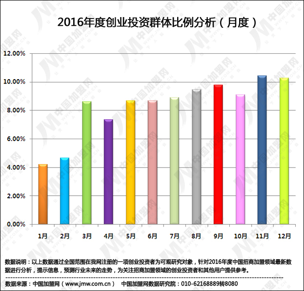 根据中国加盟网数据研究院2016年的年度数据显示,全年度创业投资群体呈逐月递增式,高峰值出现在11月、12月,这一现象同往年相比,实属罕见,通常每年的创业投资群体高峰值出现在5月、6月、7月,因为这一时间段是大学生毕业季,就业问题是大学生毕业后首要面对的难题,因此很多大学生放弃就业选择创业,而加盟连锁作为最便捷的创业方式成为了大学毕业创业的优选途径。所以,这一时期的创业人群的增长峰值通常会出现, 相反,今年的创业投资群体涨幅小高峰出现在年底,最主要的原因是由于很多创业者抓住了节约创业成本的黄金期。从2016年的商业店铺租赁市场看,年底商务租赁市场出现了不同程度的新老更替,而按照商业店铺经营的规律来讲,都市、城镇的成熟商圈中, 11月和12月两个月空置率达到最低时期,这样很多具有商业价值的铺面会空闲,所以这个时期也就成为了创业者计划开店选项目最为集中的时期。此外,据中国加盟网数据研究院分析师小果介绍,年底创业投资群体的突然增多的另一个原因, 以12月为例,作为年前的最后一个月,12月是客源最为集中的时期, 加上随之而来的节假日,都会刺激市场带来可观的收益。