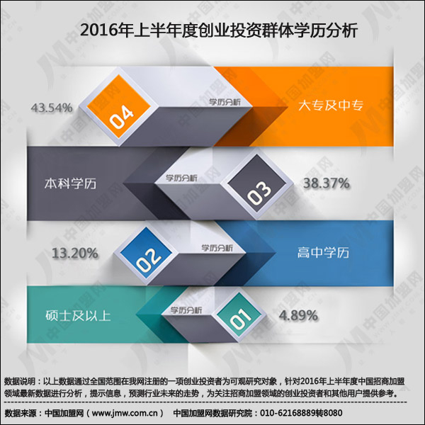 根据中国加盟网数据研究院数据显示,2016年上半年创业投资群体中,中专及大专学历所占比例43.54%,本科学历占38.37%,高中及以下学历占13.20%,硕士及以上学历占4.89%。值得一提的是,本科学历创业者人数明显增多,相比去年的同期增长接近6个百分点。在这个大众创业万众创的时代,蕴藏的机会和挑战会让人兴奋。在每个人都具有创业机会的面前,最富有激情的是本科学历的创业者,他们在对环境的分析,对创业的价值观上更加占有优势。虽然学历对于创业者的价值已经是一个老生常谈的问题了,但只能说“仁者见仁智者见智”,怎样将知识转化成能力,将能力转化成成果,这将成为winner与loser的决定因素。