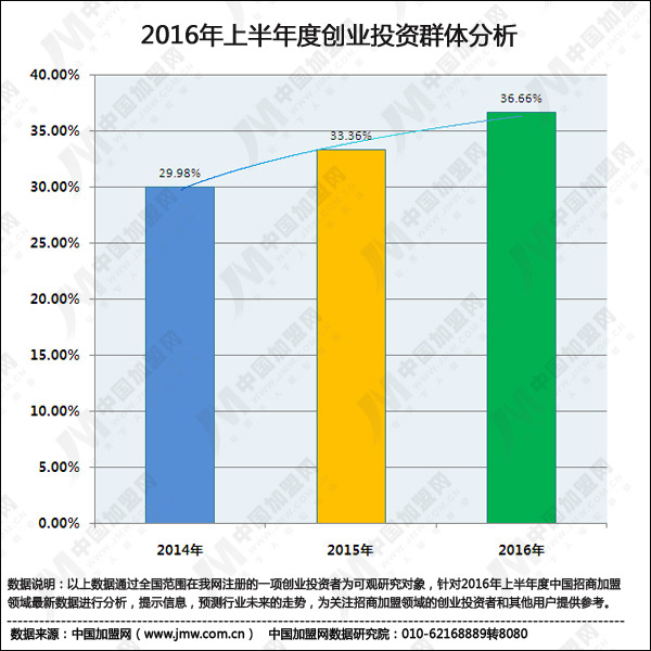 根据中国加盟网数据研究院数据显示,2016年上半年招商加盟领域稳中有序发展,犹如一潭湖水,虽有“涟漪”,但起伏不大。从对比2015年上半年及2014年上半年的数据看,创业投资群体增幅明显,同期增幅接近10个百分点。