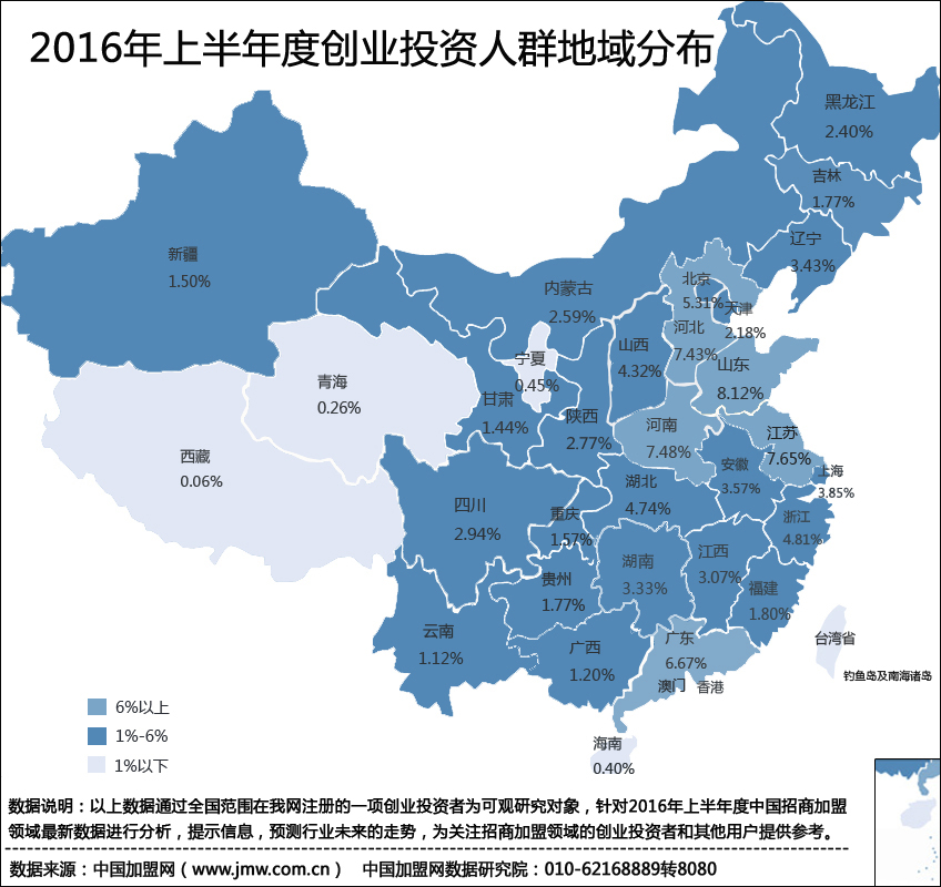 根据中国加盟网数据研究院的调查显示,2016年上半年创业投资群体地域分布所占比例最高的是山东省,比例为8.12%,排在第二的是江苏省,比例为7.65%,第三、四位分别是河南省和河北省,所占比例分别为7.48%和7.43%。值得一提的是,2016年上半年创业投资群体较去年同期无较大变化。从地域上看,沿海地区创业人群的活跃度要明显高于内陆,而第二梯队的河南省和河北省近两年创业者活跃度极速上升。究其原因,由于“大众创业万众创新”已成为国策,各地政府相应出台补贴政策,从资金到政策方面对创业予以支持,在2016年上半年,第一梯队的山东省、江苏省创业者的创业热情明显升温,这离不开当地政府对创业者的大力扶持,加上北上广深等一线城市的人口开始回流,返乡创业也成为了时下最流行的话题。