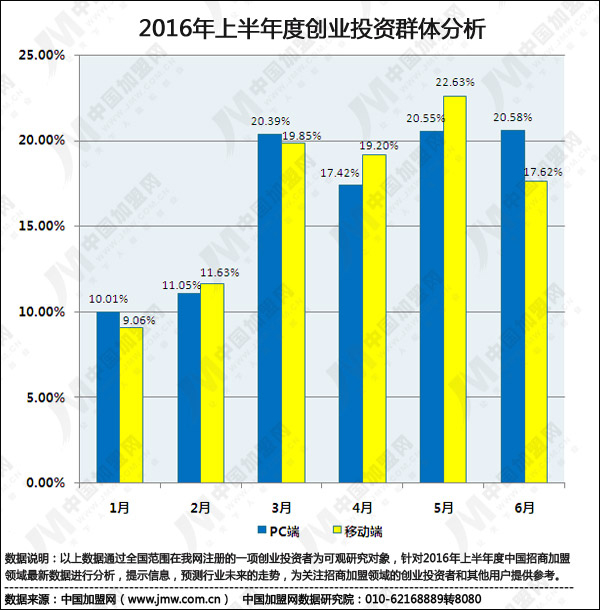 从上述图中的数据我们可以看出,2016年1-6月中,1、2月处于新年伊始创业群体基本都处于冬眠期,3月份创业投资群体增长出现了短暂的小高峰,4月有所回落,直到5、6月才逐渐上升然后趋于平稳。而从移动端的数据来看,创业投资群体的高峰期出现在5月。而在移动端的数据显示,高峰期也同样出现在3月,4月稍有变化,但起伏不大。随着招商加盟领域移动互联网的全面普及,预计下半年移动端数据将会大幅上升。