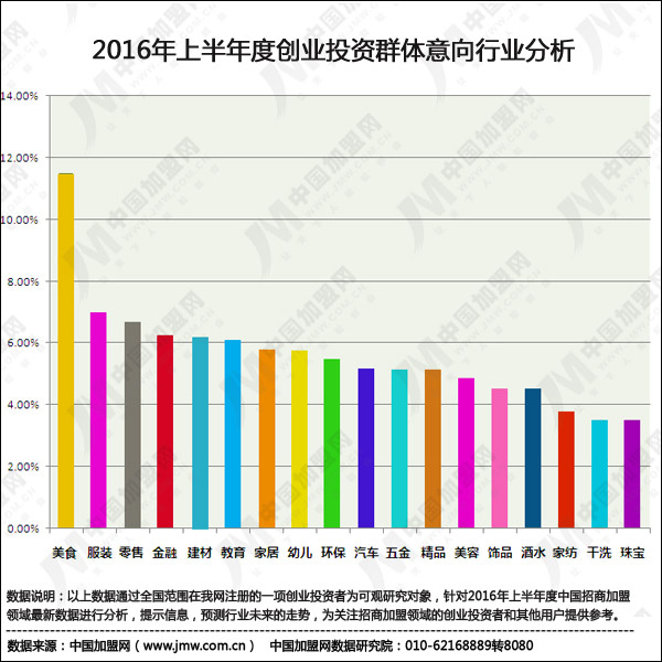 从2016年上半年度行业调研数据显示,餐饮、服装、教育、幼儿行业受关注度明显高于其他行业,中国加盟网数据研究院首席分析师王女士认为,人们在挑选投资项目的时候,大多数创业者往往会选择自己熟悉的行业,餐饮和服装作为生活中不可或缺的一部分,当之无愧成为创业首选行业。