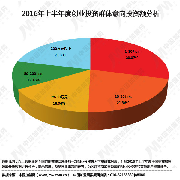 根据中国加盟网数据研究院数据显示,2016年上半年创业投资群体意向投资额所占比例最大的为1-10万元占总比例的29.07%,第二、第三位的是10-20万元和100万元以上,所占比例分别为21.36%和21.33%。值得一提的是,大额投资项目受关注度有显著的提升,与去年同期的数据进行对比,涨幅较大,从这一数据我们可以看出,投资额度较大的项目受青睐度有很大的上升空间。而中小型创业依然是主流。