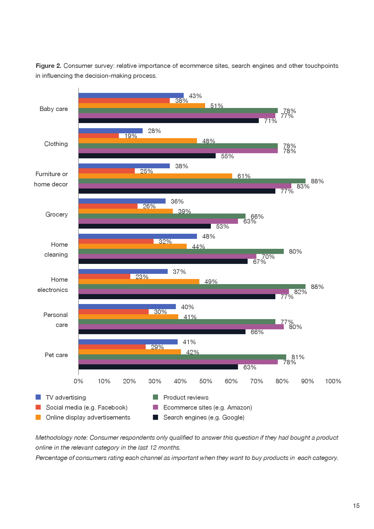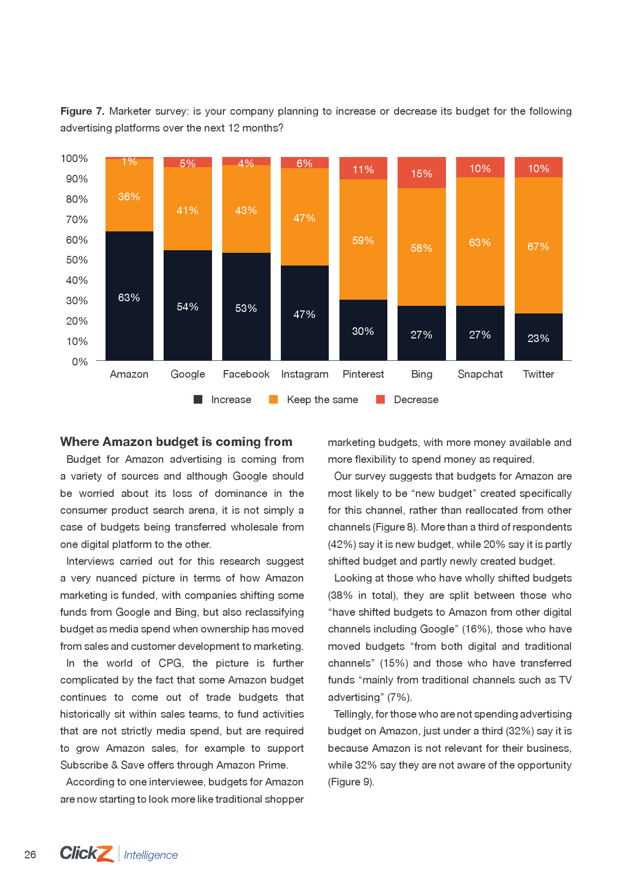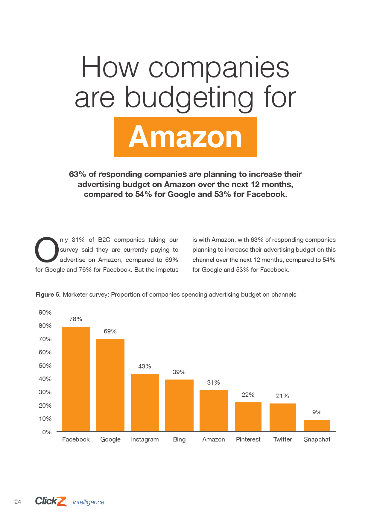 根据这份白皮书显示,亚马逊现有的美国品牌主当中有 63% 计划将在2018年增加投放预算。在这群人中,有 54% 表示将会增加谷歌的投放预算,53%表示将会增加 Facebook 预算。另外分别有 27% 和 23% 表示将会增加必应和推特的预算。