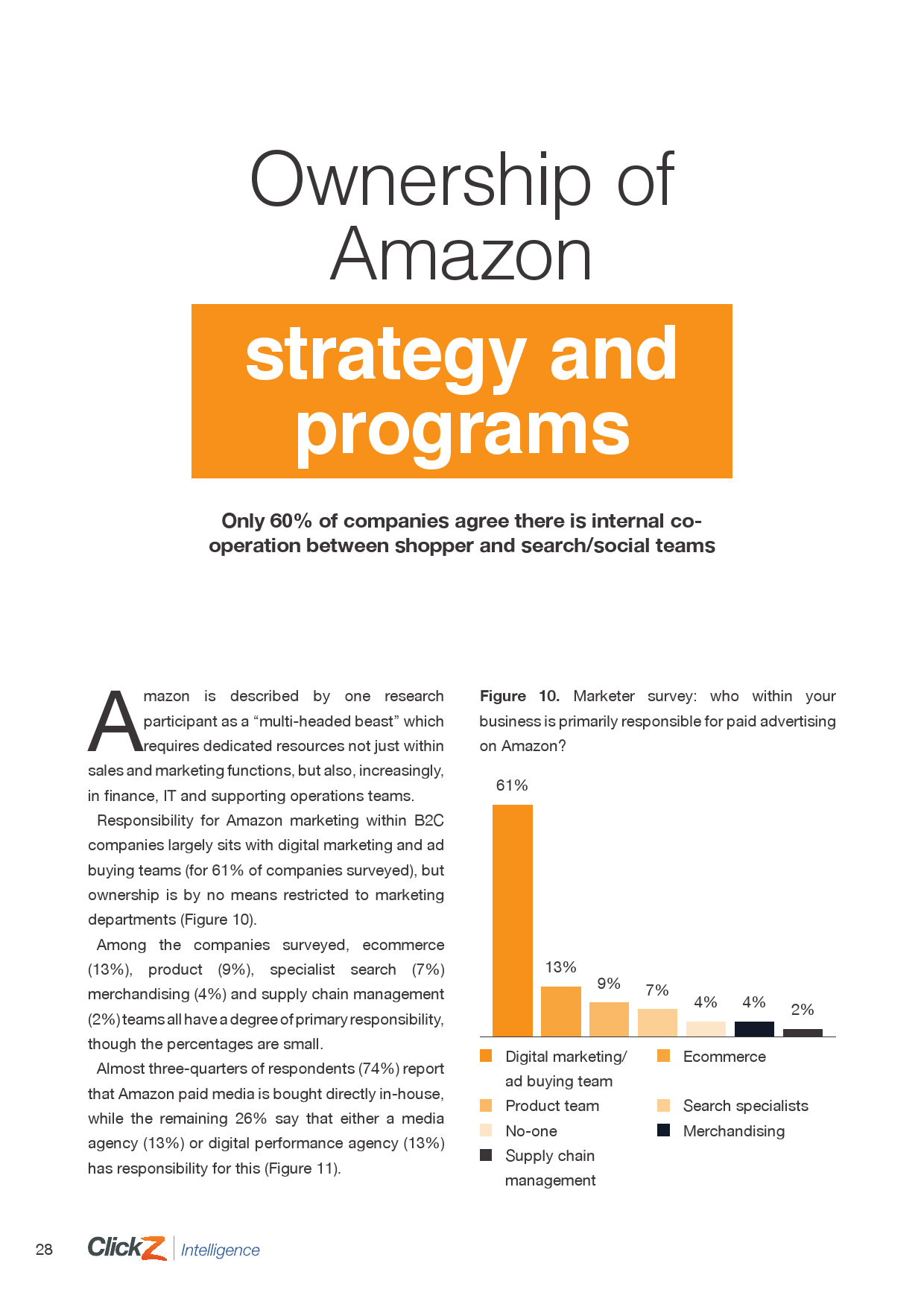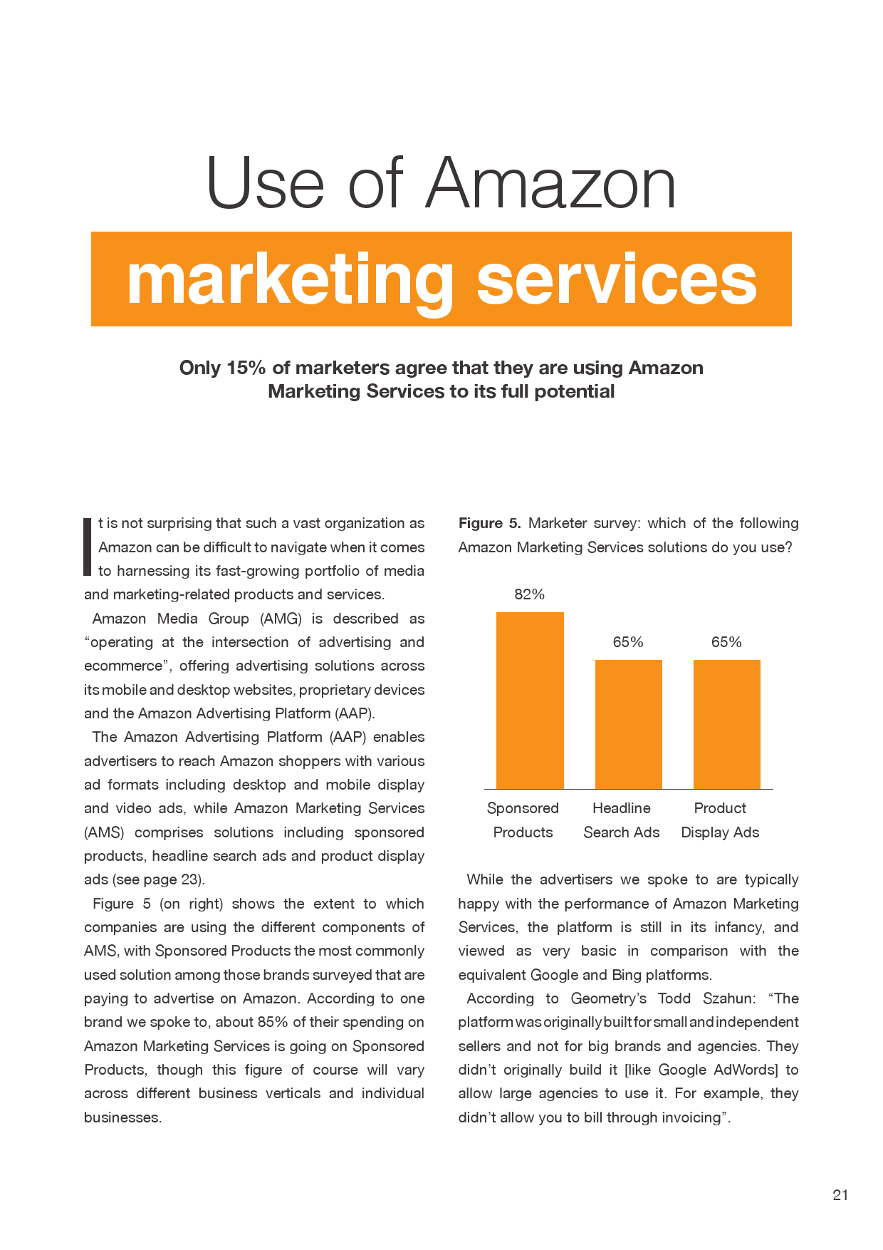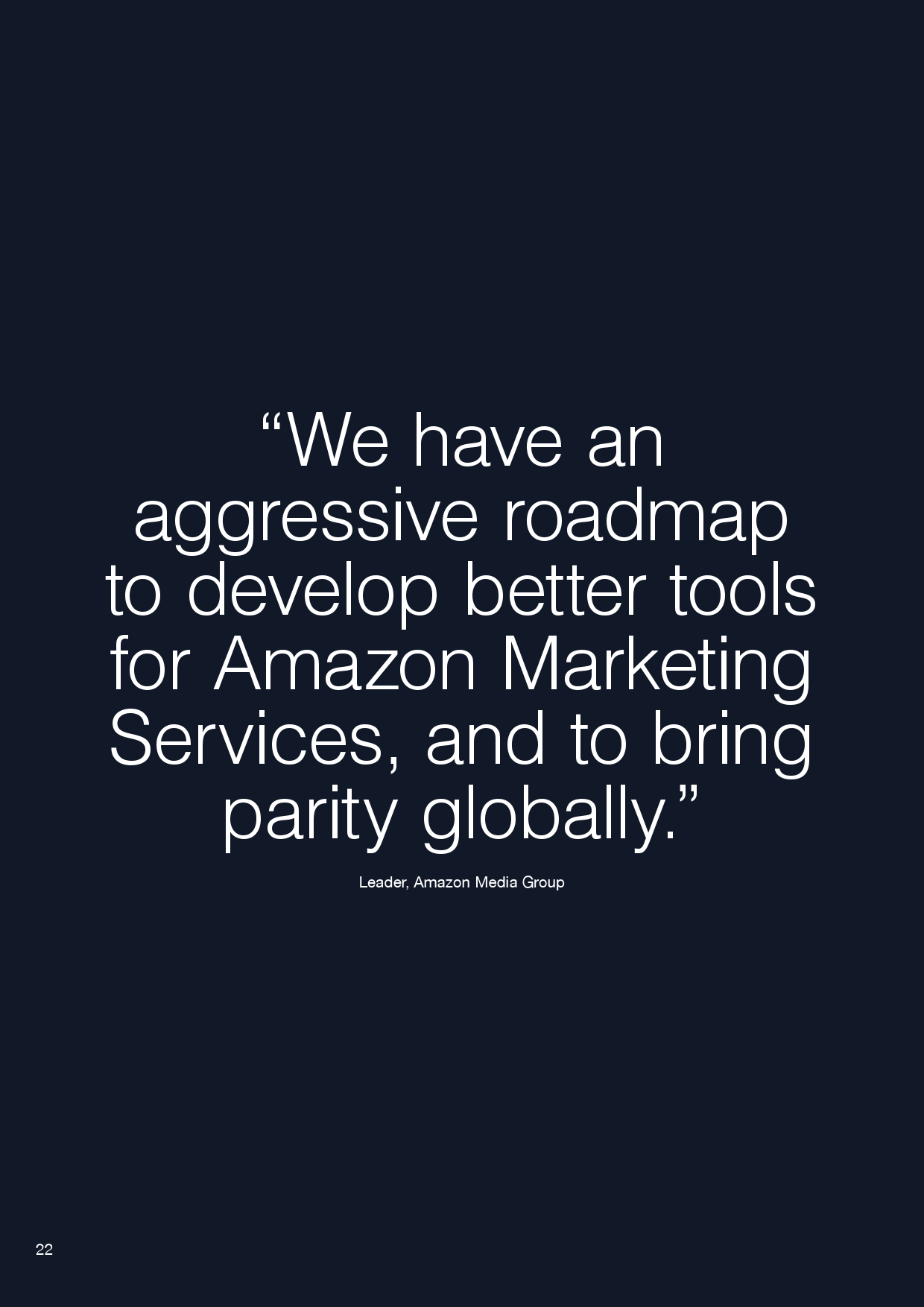有趣的是,只有 15% 的广告主表示他们使用亚马逊的所有广告产品,即 Amazon Marketing Services (AMS), 另有17% 的广告主表示他们在亚马逊的投放有完整详尽的战略。