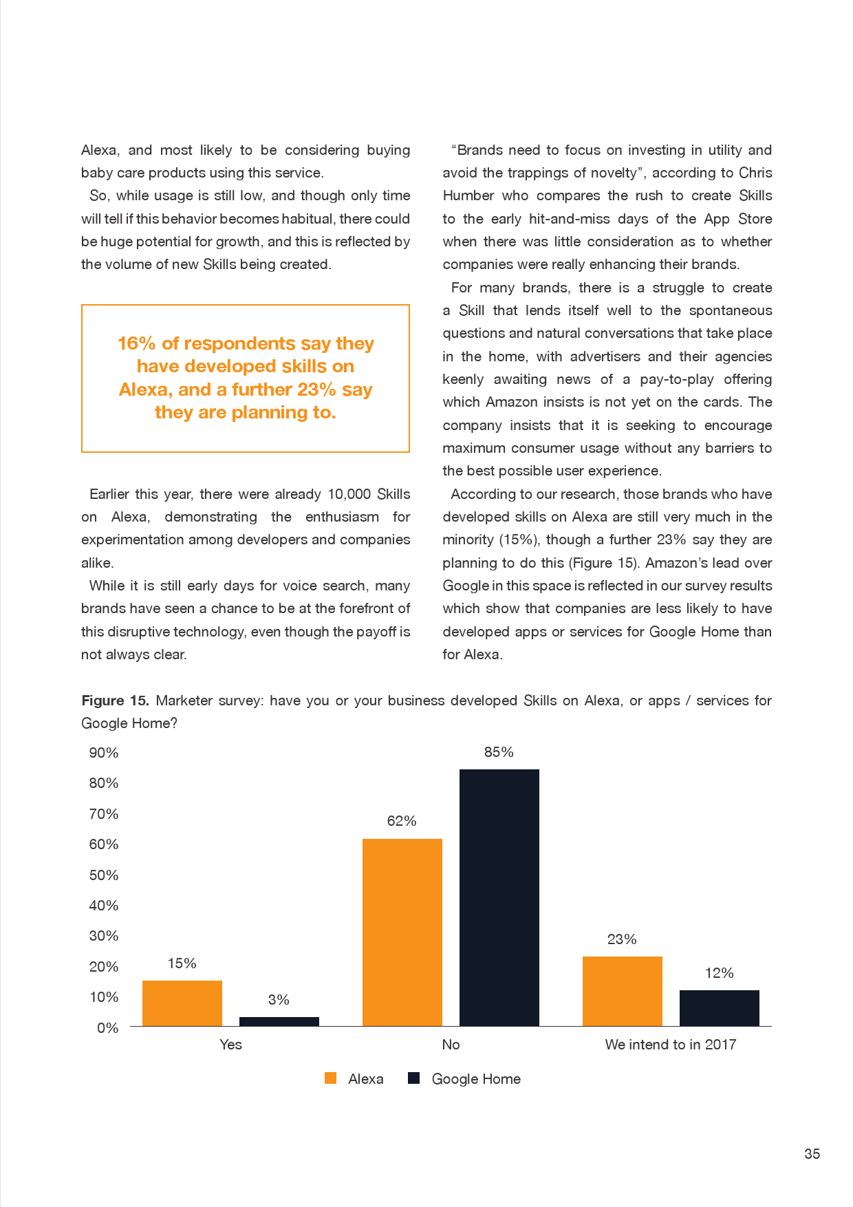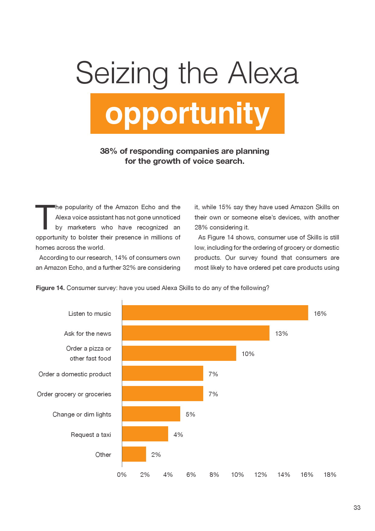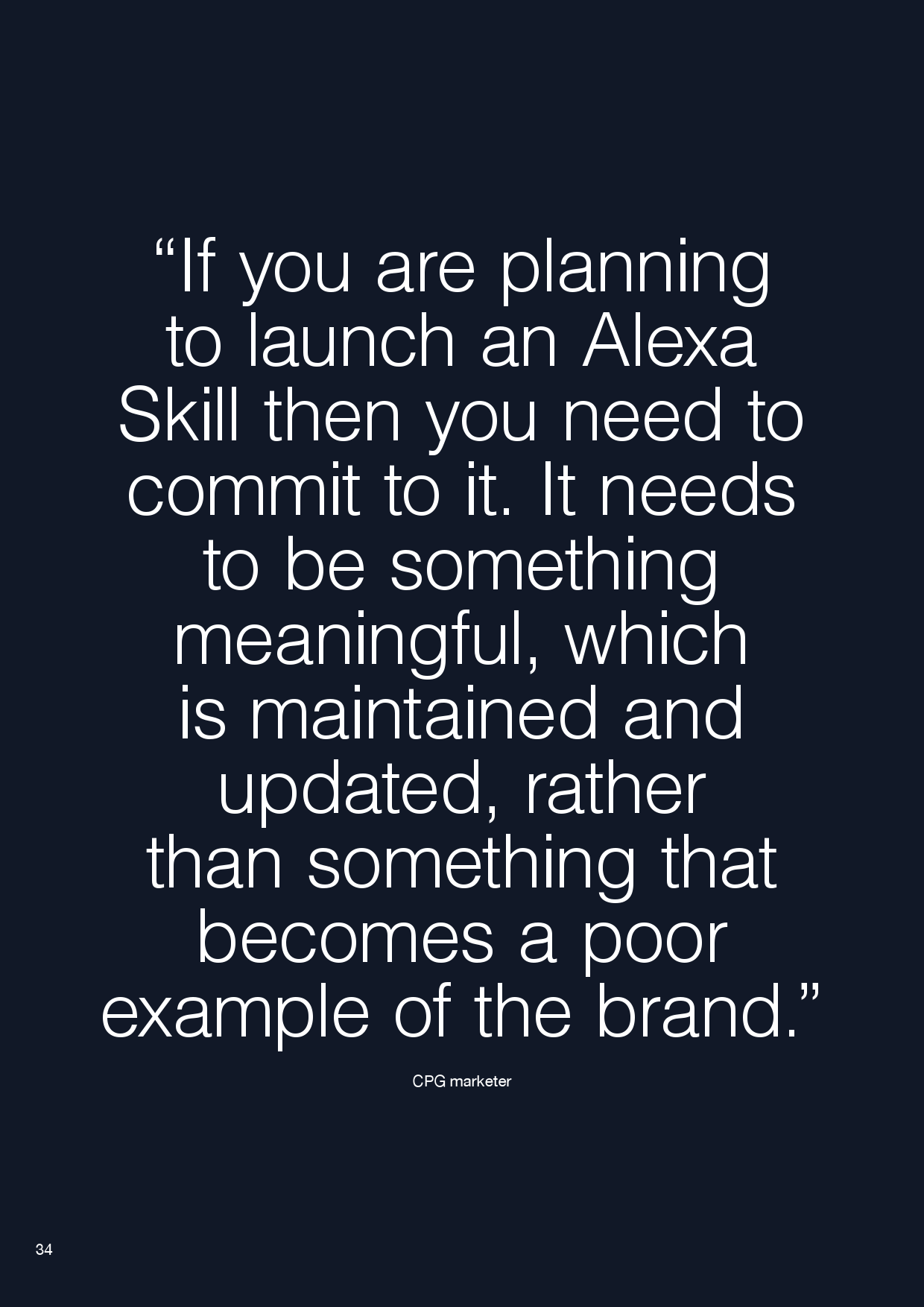 16% 的广告主表示他们已经使用亚马逊语音助手 Alexa 赋能营销战役,另有 23% 表示有计划将在今年年底之前推出在 Alexa 投放的营销战役。尽管语音营销在业界广受热议,但是在执行层面规模还不算太大。