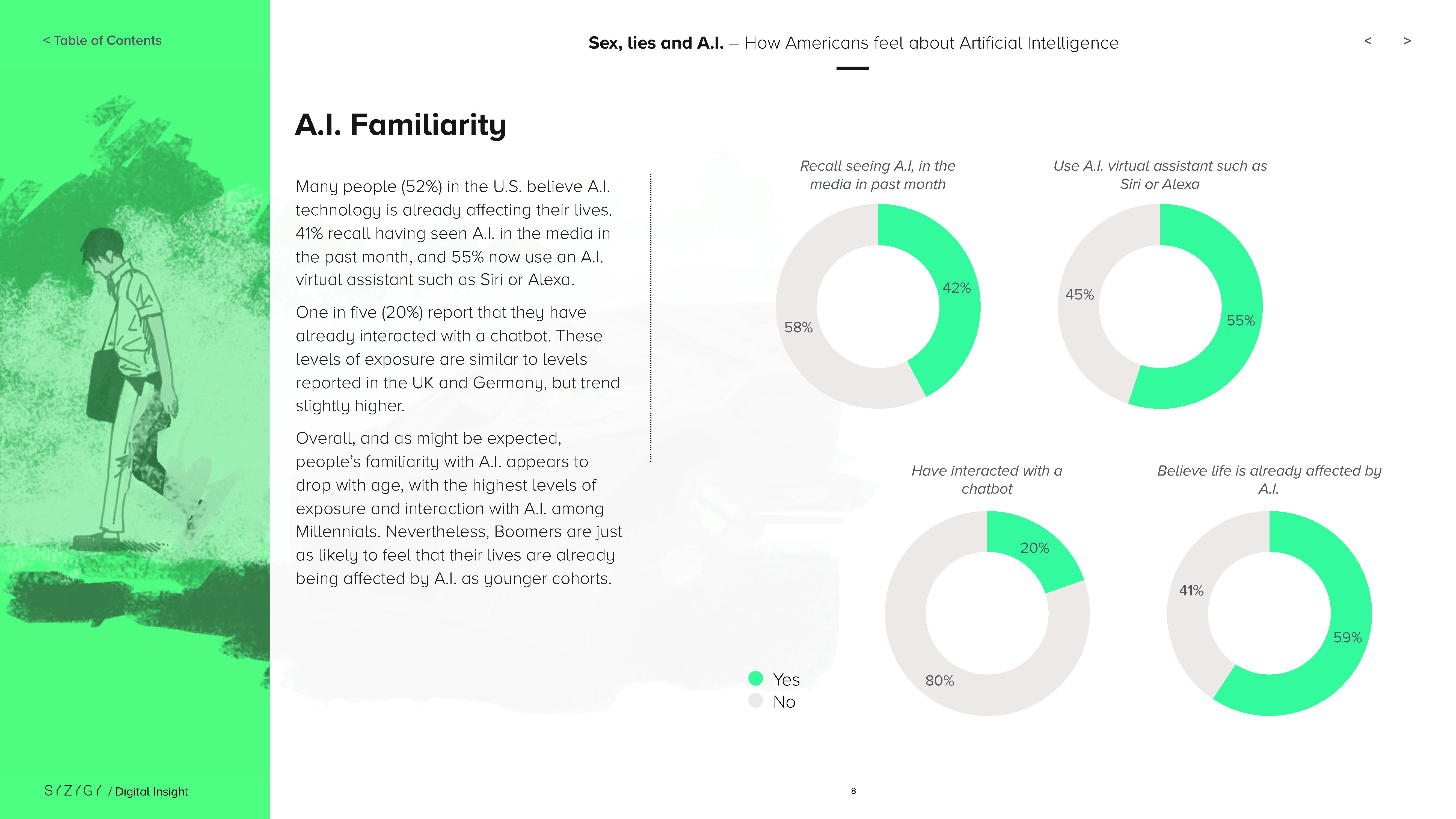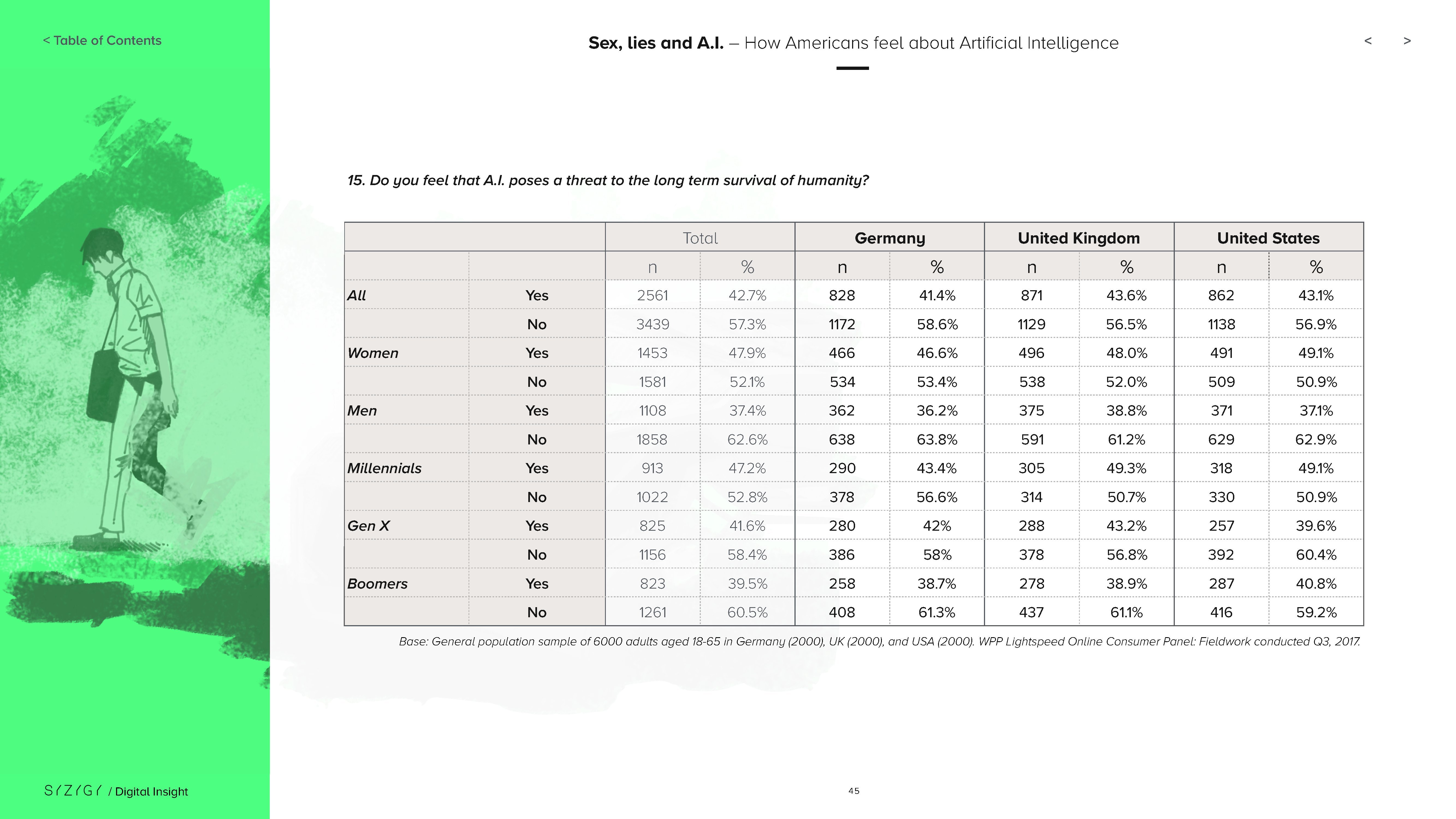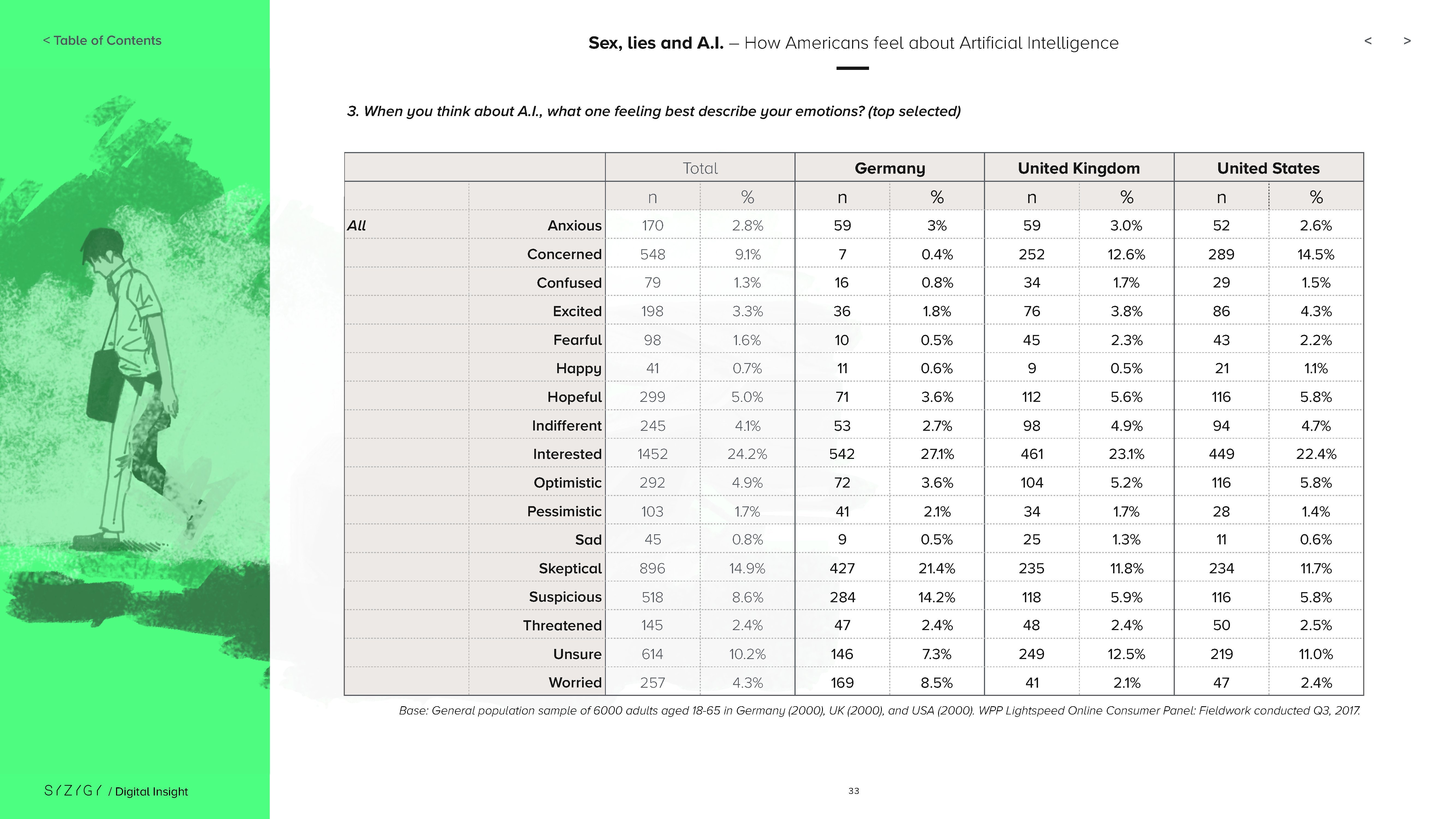 这些差异可能是因为对AI的普遍了解仍然有限:只有11%的美国人表示他们对AI技术很了解。当SYZYGY调查人们对人工智能的看法时,45%的受访者选择“感兴趣”,其次是“关心”(41%)、“怀疑”(40%)、“不确定”(39%)和“怀疑”(30%)。