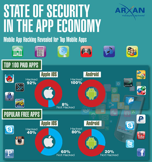 今天数据调查分析公司arxan发布了一个让人吃惊的数据,该数据显示iOS平台排名前100的付费应用超过90%被破解,而Android平台的排在前100名的付费应用更是100%被破解。于此同时,比较流行的免费应用也没有被幸免,也有很多遭到破解,iOS平台超过40%,android平台超过80%。