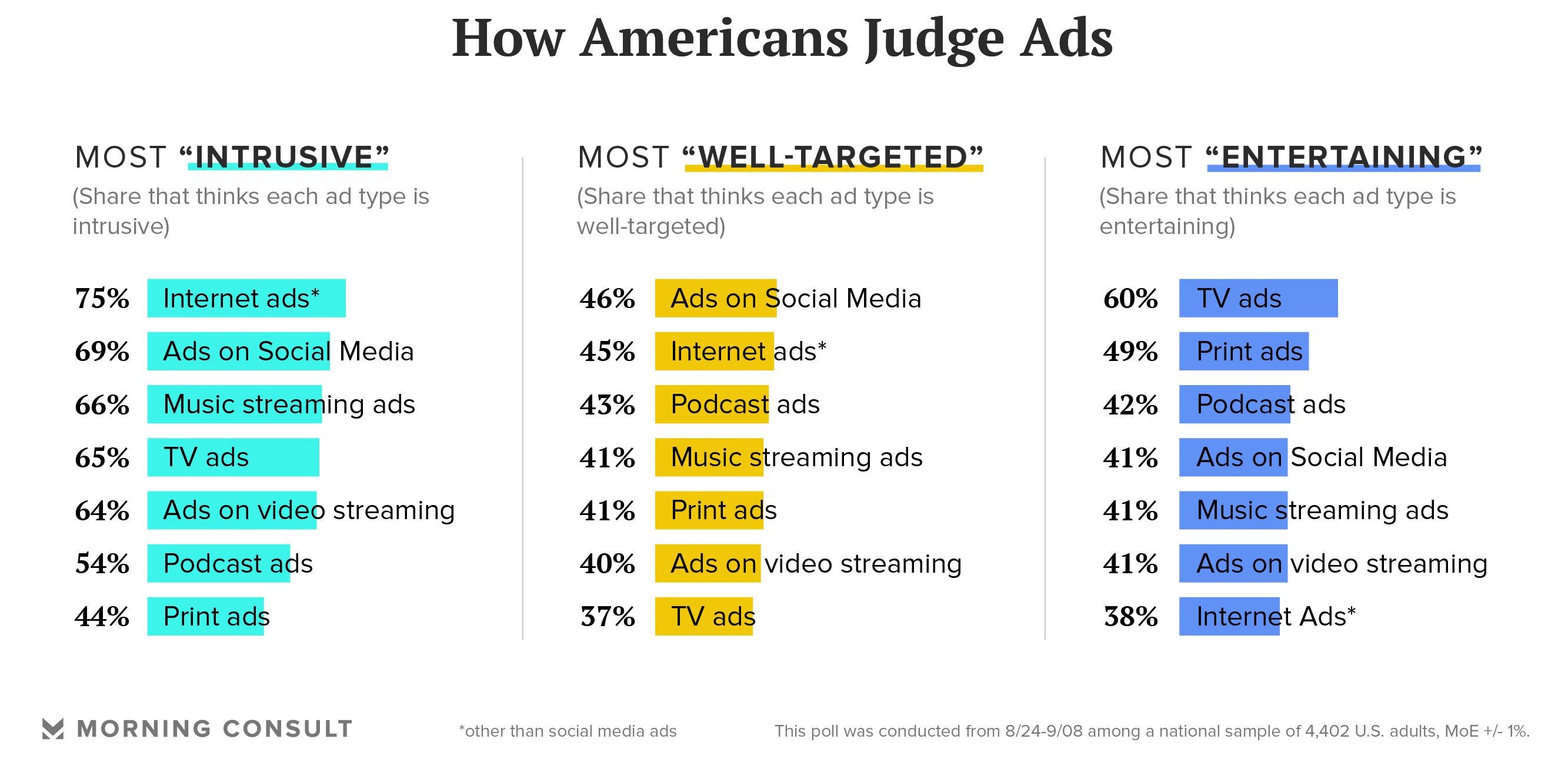 过度就会招来反感,3/4的受访者认为网络广告过多,69%的受访者认为社交媒体广告过多,还有65%的成年人认为电视广告过多。