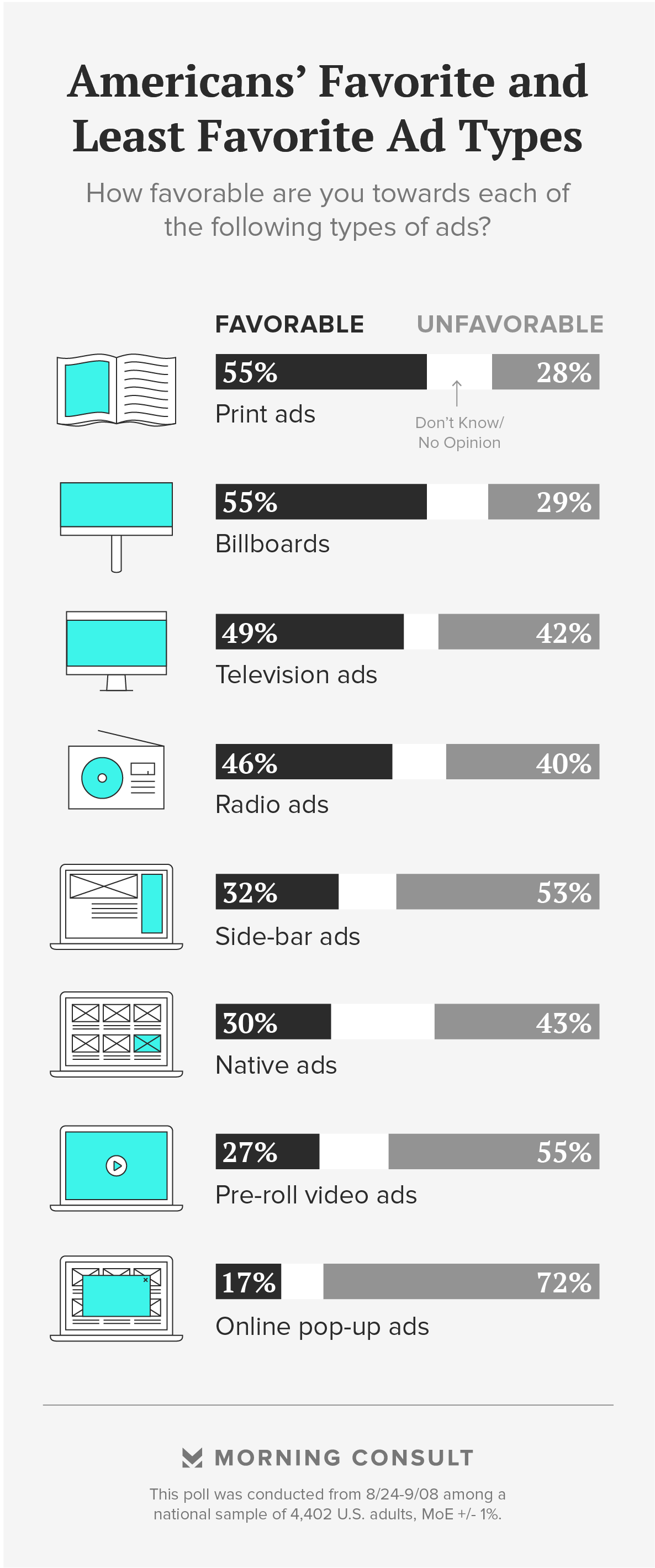 调查显示,60%的美国人享受电视广告,社交广告方面则下降至41%,互联网广告则降至38%。