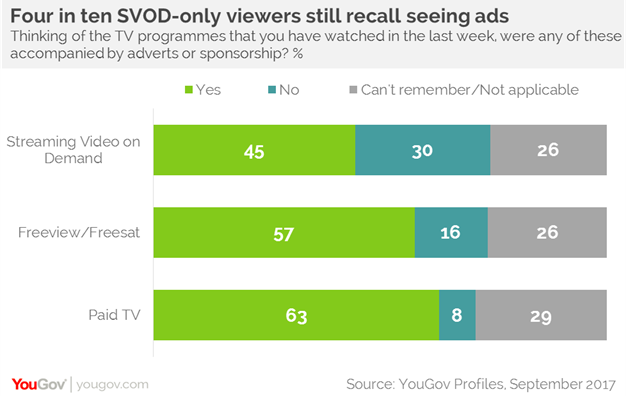 这些数字与Freeview / Freesat(57%)或付费电视(63%)观众相比差距并不是很大。这意味着,虽然无广告内容平台的订阅者看到的广告数量更少,但仍有很多观众记得看过的品牌广告。