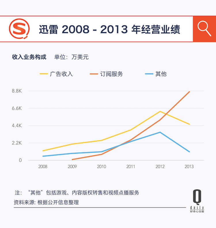 2008 年,迅雷取得 1186 万美元广告收入、占比 70%。一年后迅雷推出了自己的会员系统,正式开始了迅雷系统的付费计划 —— 付费用户享受更快的下载加速并可以去除广告。会员系统上线以后,迅雷有了最为直接的商业模式,来自会员的订阅收入也逐渐取代广告成为迅雷最重要的收入来源。