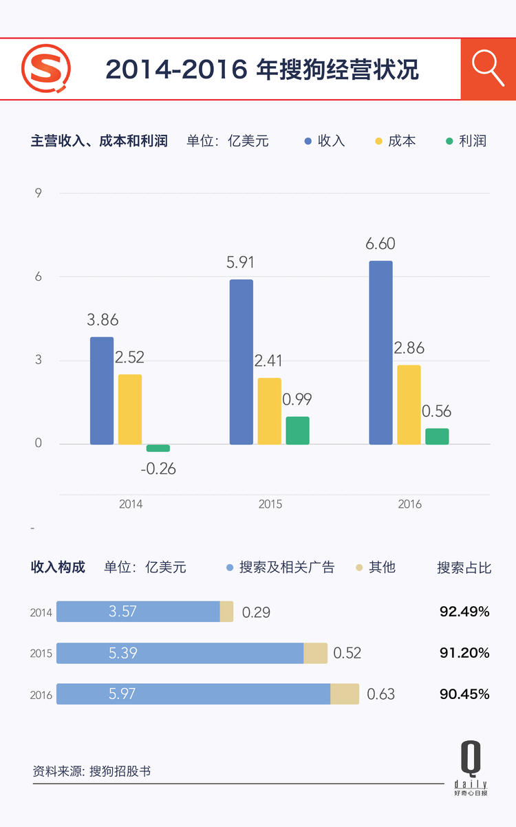 到 2016 年,流量成本上升,搜狗利润下滑超过 40%。这还是在 38% 搜索流量由投资方腾讯提供的前提下。