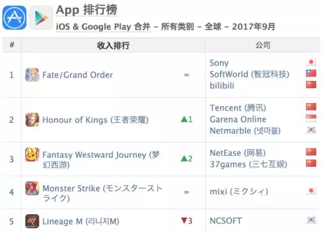 前不久App Annie发布了9月份的《全球应用下载量和收入榜单》和《中国应用下载量和收入榜单》,榜单显示:9月份全球收入最高的产品是《Fate/Grand Order》(下简称FGO),《FGO》的全球收入排名继8月份连升5位登顶后继续蝉联,超过位列二、三位的《王者荣耀》和《梦幻西游》,展现出二次元游戏强大的创收能力。