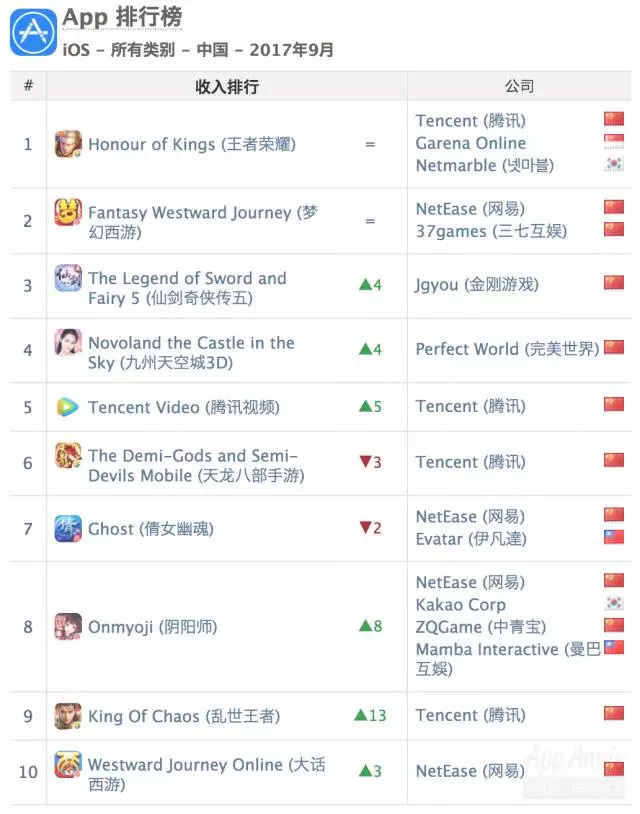 值得一提的是,结合去年同期App Annie发布的榜单,我们能看到去年9月《阴阳师》作为新游首次进入下载榜和收入榜的Top 10,这期间《阴阳师》虽然并未全程处于App Annie统计的收入Top 10,但也多次上榜,并长期处于iOS畅销榜前列,是国内二次元头部产品的另一代表。