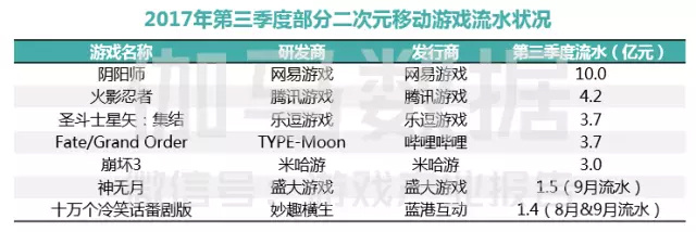 根据2017年第三季度伽马数据收入测算,进入移动游戏Top 10的二次元游戏有《阴阳师》,进入Top 50的有《阴阳师》《火影忍者》《圣斗士星矢:集结》《FGO》《崩坏3》《神无月》《十万个冷笑话:番剧版》,二次元头部产品的营收能力可见一斑。