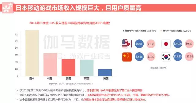 游戏出海本没有太多的特殊之处,不过日本作为单用户价值极大的区域性市场,对各国的游戏厂商都有着不小的吸引力,也有国内厂商将产品带去当地并取得不错的成绩——专精二次元品类的米哈游、偏重军事题材的华清飞扬等都是典型的案例。去年的话题性产品《阴阳师》发往日本后也在一段时间内保持在畅销榜Top 30内。