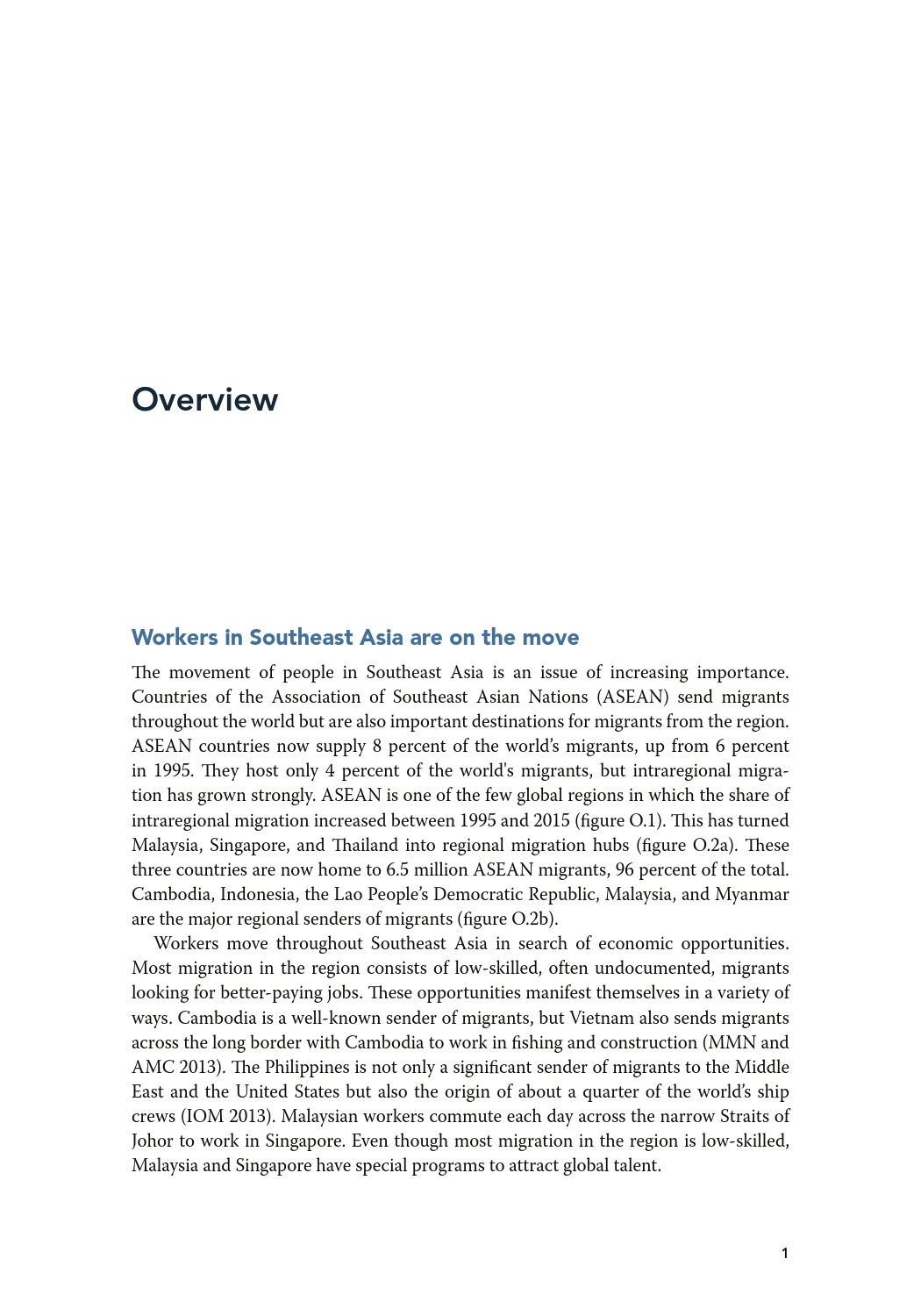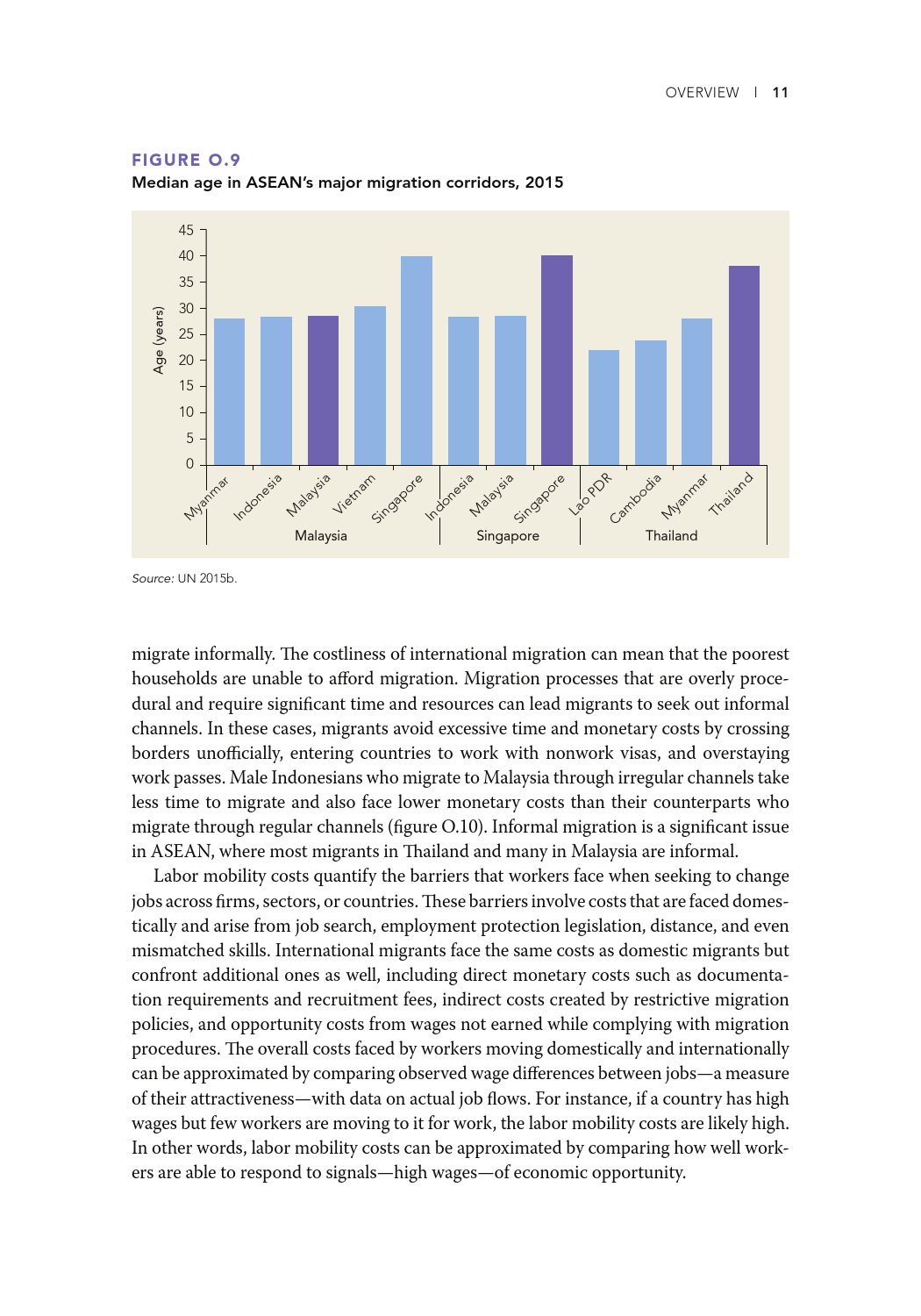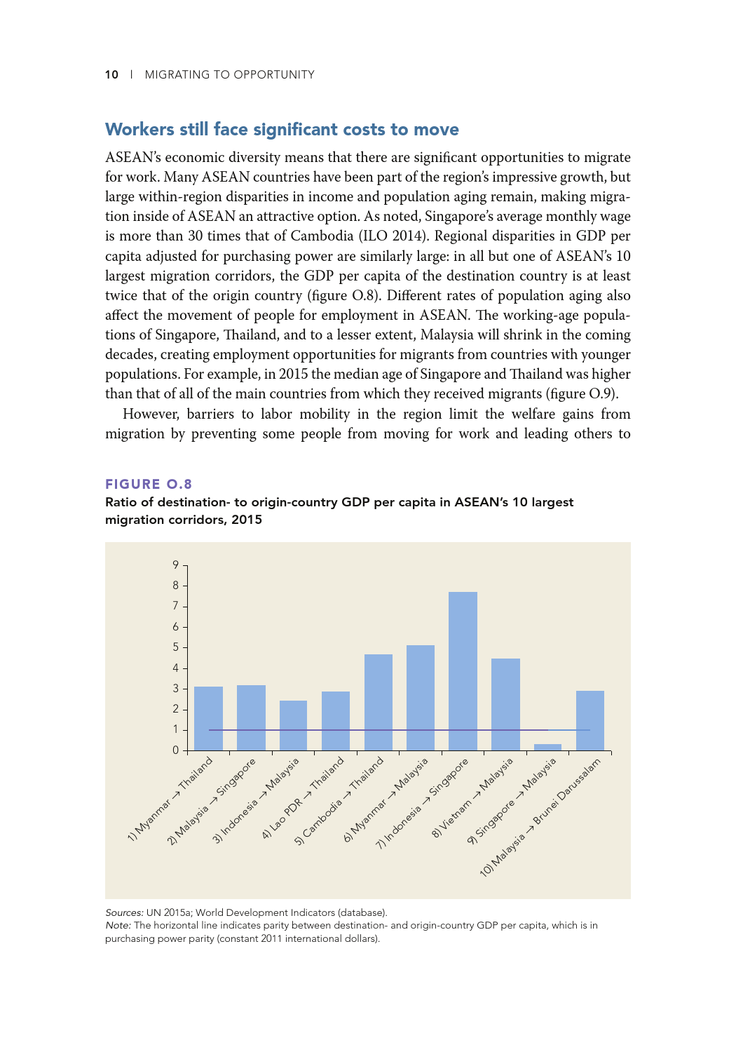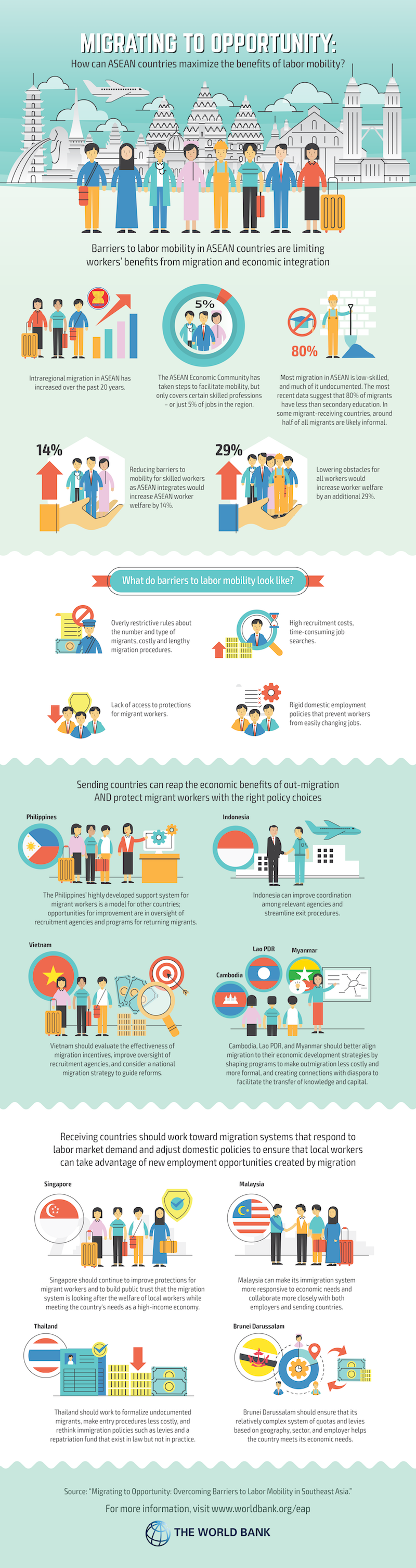低技能且往往无证件的东盟移民迁移的目的是寻找经济机会,主要集中在建筑、种植和家政服务行业。薪酬较高的工作是有的,但工人并不一定有能力利用这些机会。东盟经济共同体已采取措施促进流动,但这些规定只涉及某些技术职业,如医生、牙医、护士、工程师、建筑师、会计和旅游专业人士,仅占该地区就业总数的5%。