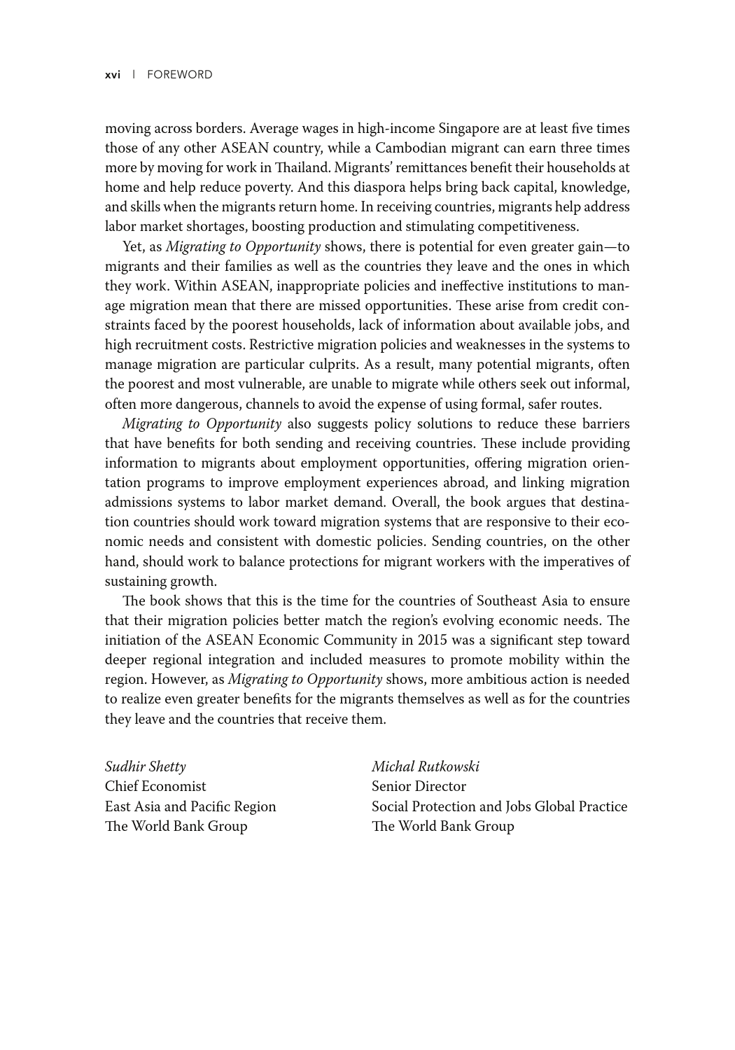 世界银行东亚太平洋地区首席经济学家苏迪尔·谢蒂说:“做出正确的政策抉择,输出国就能收获移民输出带来的经济效益,同时保护那些选择为工作而迁移的国民。在接收国,外籍工人可以弥补劳动力短缺,促进持续的经济增长,条件是移民政策须配合经济需要。不当的政策和无效的制度会使地区丧失从人口流动中充分受益的机会。”