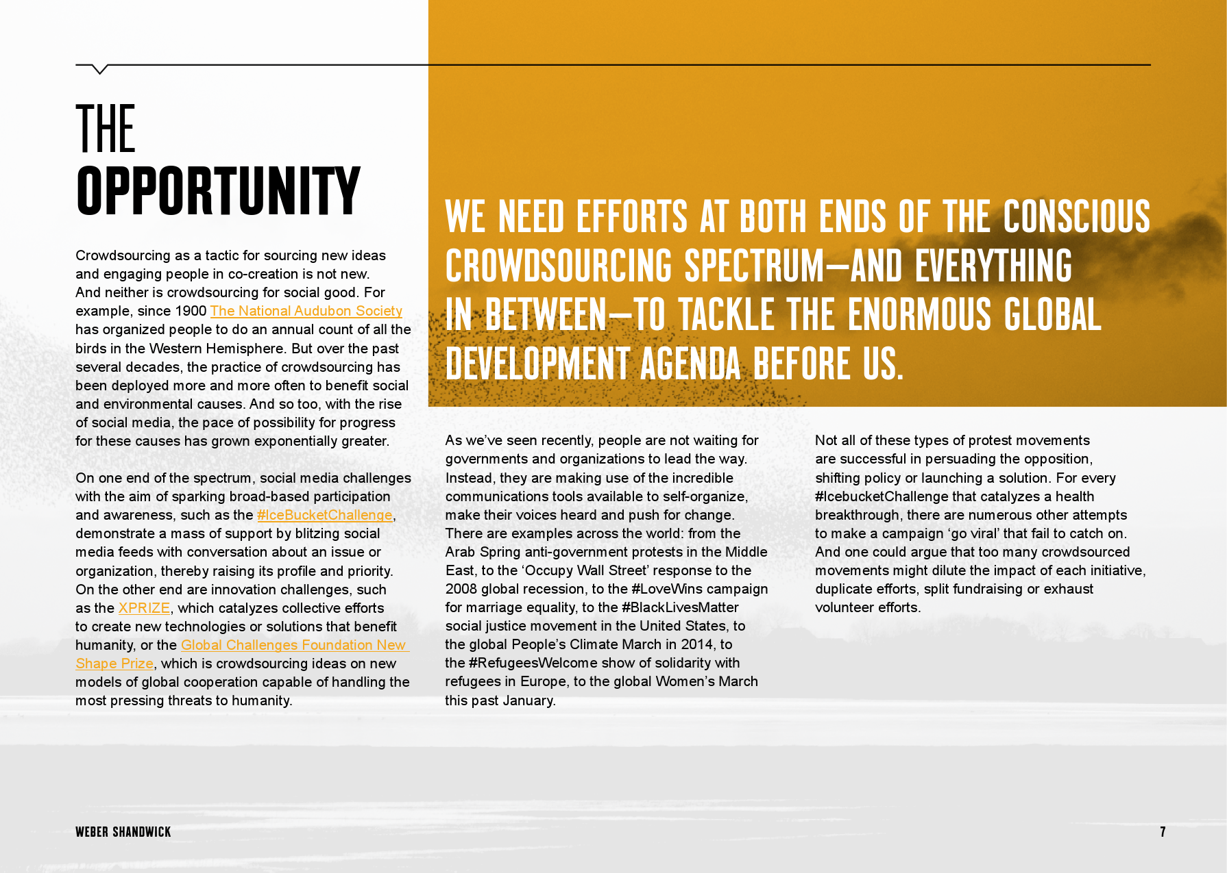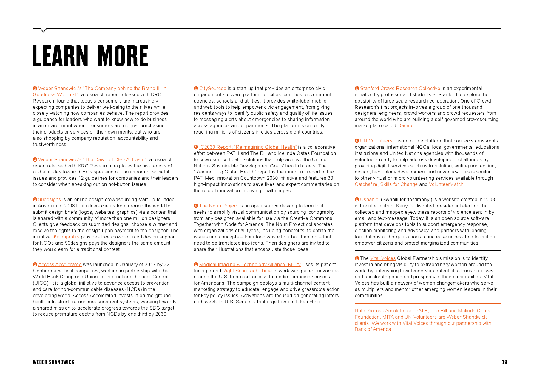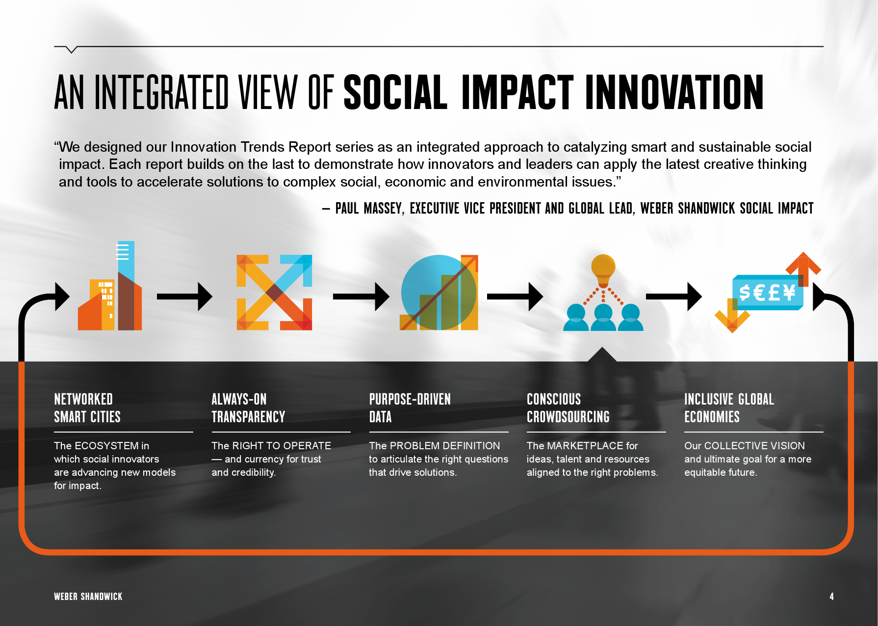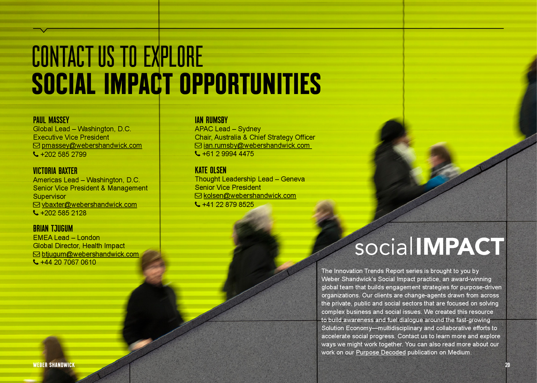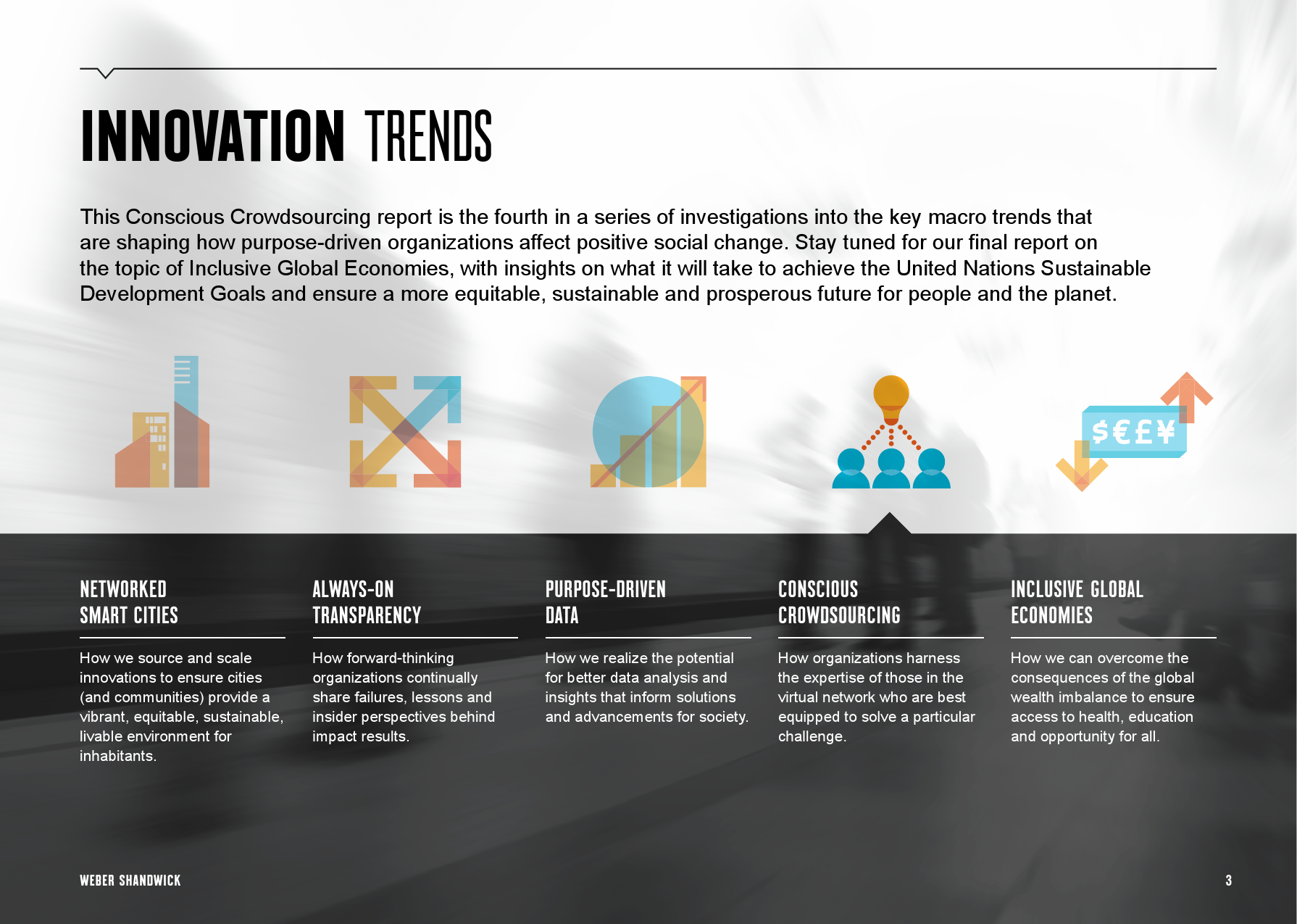 该团队创建了《创新趋势报告》资源,旨在促进对快速增长的解决方案经济的了解和对话——由企业、基金会、非营利组织、政府和个人多学科共同努力,解决复杂的社会问题。《创新趋势系列报告》旨在回答有关持续改善贫困、不平等、疾病和气候变化等问题。这些问题的解答将有赖于政策制定者、商界领袖、社会部门组织和普通公民在一个新的框架-即包容性全球经济中开展前所未有的合作。