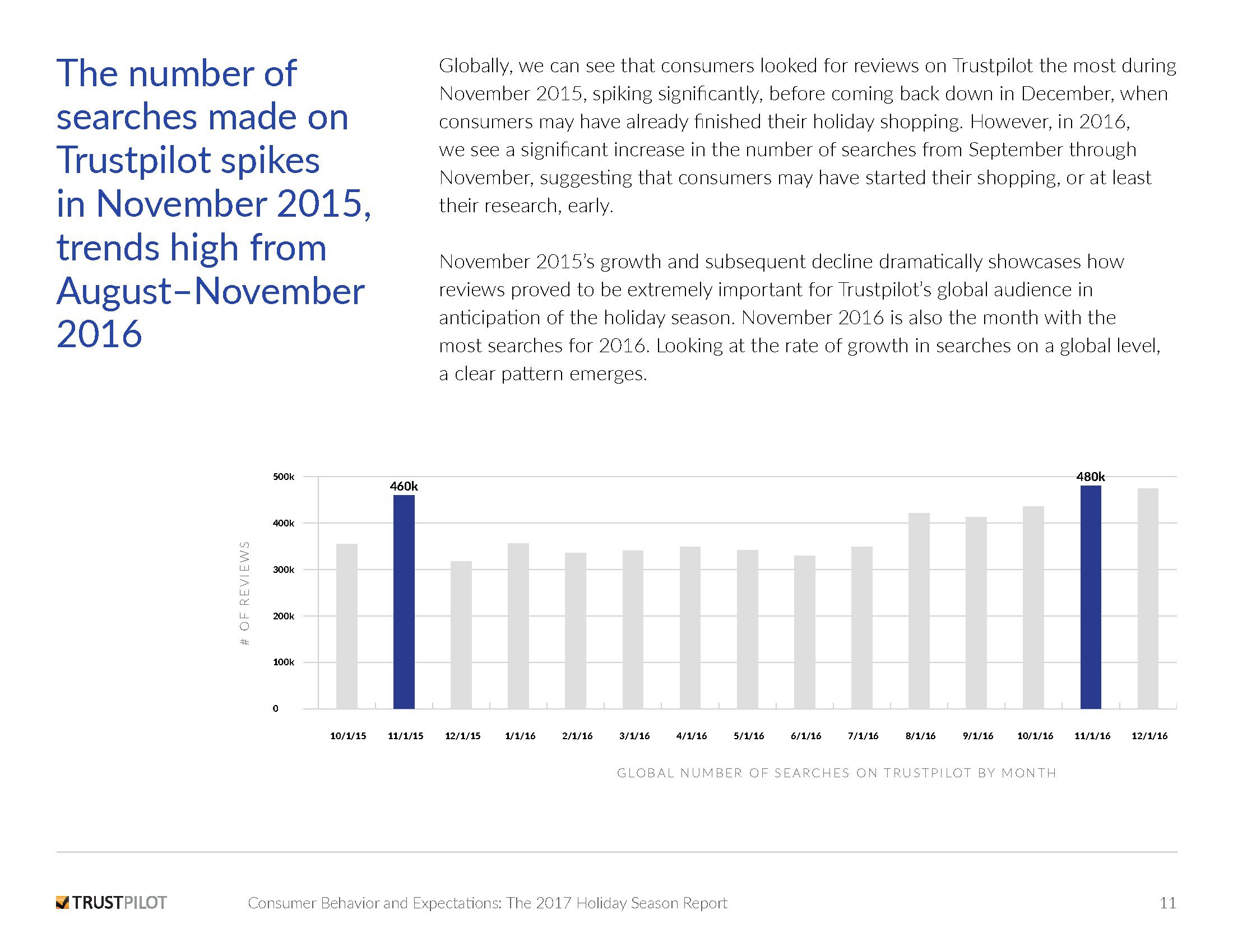 2015年11月,Trustpilot网站的搜索数量达到高峰,从35万增长至46万,增长31%。2016年11月,这个数字则增长至48万。