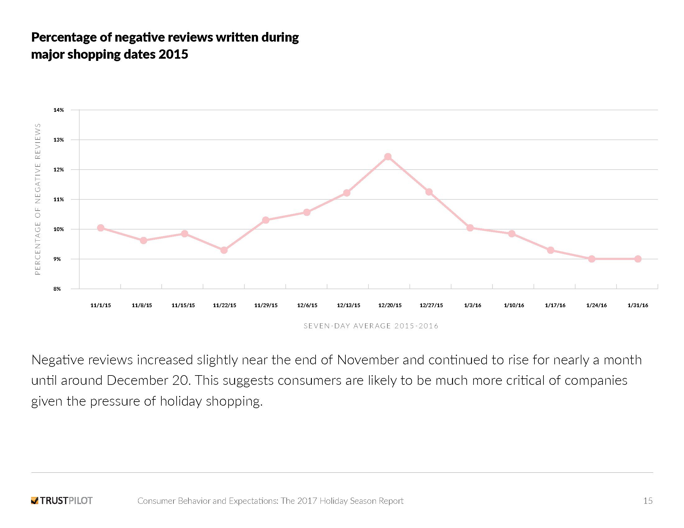 2015年12月,全球消费者共发布69万条评价,到2016年,这个数字增长至90万条,增长30%。伴随着评价数量的增长,负面评价数量也在上升。2015年12月,假日购物季负面评价占比增长至12%,比11月初增长20%。相似的情形也发生在2016年。12月,负面评价占比从11月初的10%增长至12.4%。