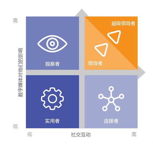 本次调查中,凯度TNS也询问了消费者们与品牌在网上互动的意愿,通过将人们对这个问题的回答,并且结合他们的上网时长,我们可以将消费者分成四类:实用者(低时长低互动)、连接者(低时长高互动)、观察者(高时长低互动)、以及领导者(高时长高互动)。对于品牌来说,“领导者”是最值得吸引的细分消费者人群,因为他们能最熟练地使用数字技术和设备,最愿意与品牌互动,尝试最新的产品,并且对于身边的消费者有非常大的影响力,能够引导消费的潮流。