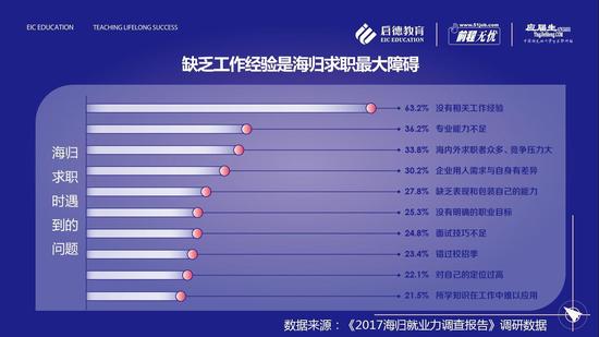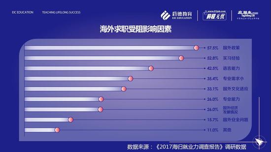 提到海归,难免会对海归们在海外的职场竞争力产生好奇,《2017海归就业力调查报告》调研数据显示,31.4%的海归拥有海外工作经验,30.0%的海归曾考虑海外就业却未能找到合适的工作,还有38.7%的海归表示从未想过在海外求职。海归认为阻碍海外求职的五大原因在于:受制于国外政策(57.5%),缺乏实习经验(52.8%),自身语言能力不足(42.5%),专业需求小(35.4%)、国外文化适应问题(33.1%)。