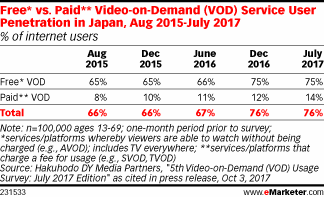 2017年7月,Hakuhodo DY Media Partners的调查发现,免费和付费视频点播服务之间的差距没有太大变化。7月,免费视频点播服务在日本的普及率是75%,而SVOD的普及率只有14%。