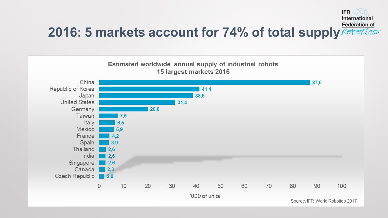 2017年,五大主要市场占机器人总销量的74%,分别是中国、韩国、日本、美国和德国。中国作为最大的市场,2016年市场份额达到30%。中国的工业机器人销量约8.7万台,接近欧洲和美洲的总销量(9.73万台)。