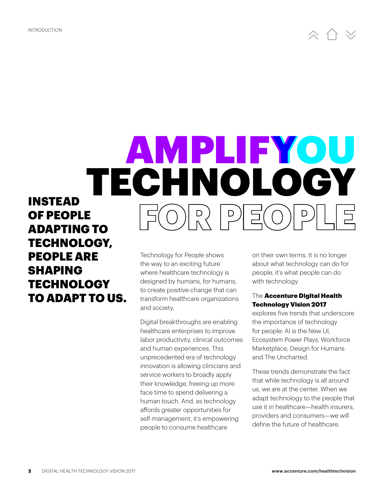 《埃森哲数字健康展望2017》披露,数字信息化领域的重大突破正在帮助医疗机构提高劳动生产力、改善医疗质量、弥补经验不足,这一创新变革使得消费者在自我管理之余,也能够为医疗事业做出一份贡献。在这份名为“技术服务人类”(Technology for People)的报告中,描绘了一幅激动人心的未来景象:人类为自身定制医疗技术,创造积极的变化,从而给医疗机构和社会带来变革。