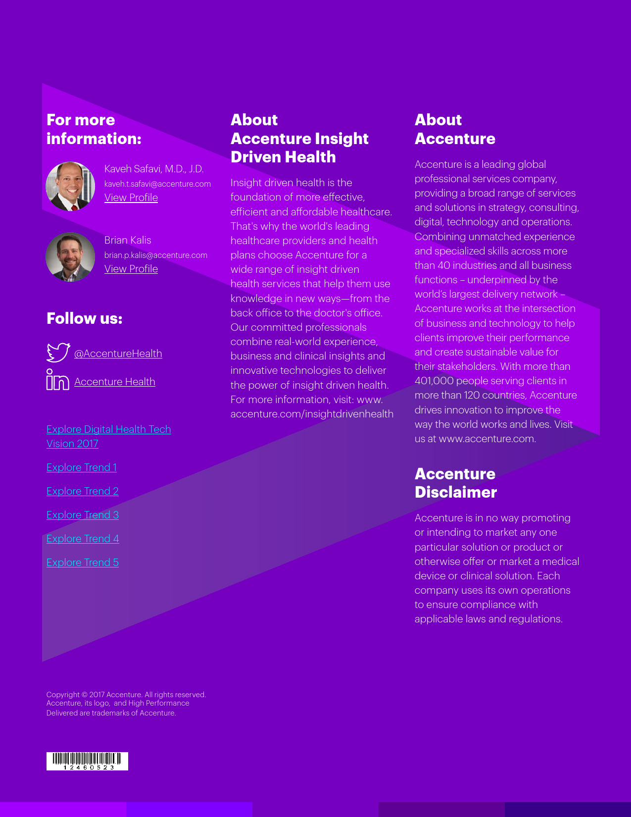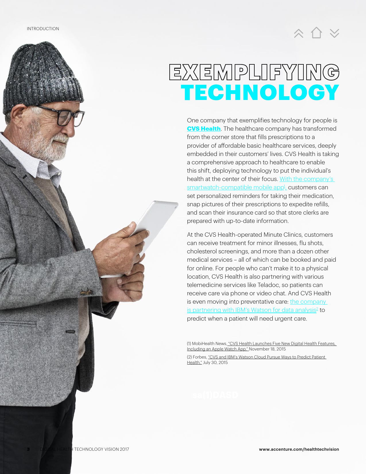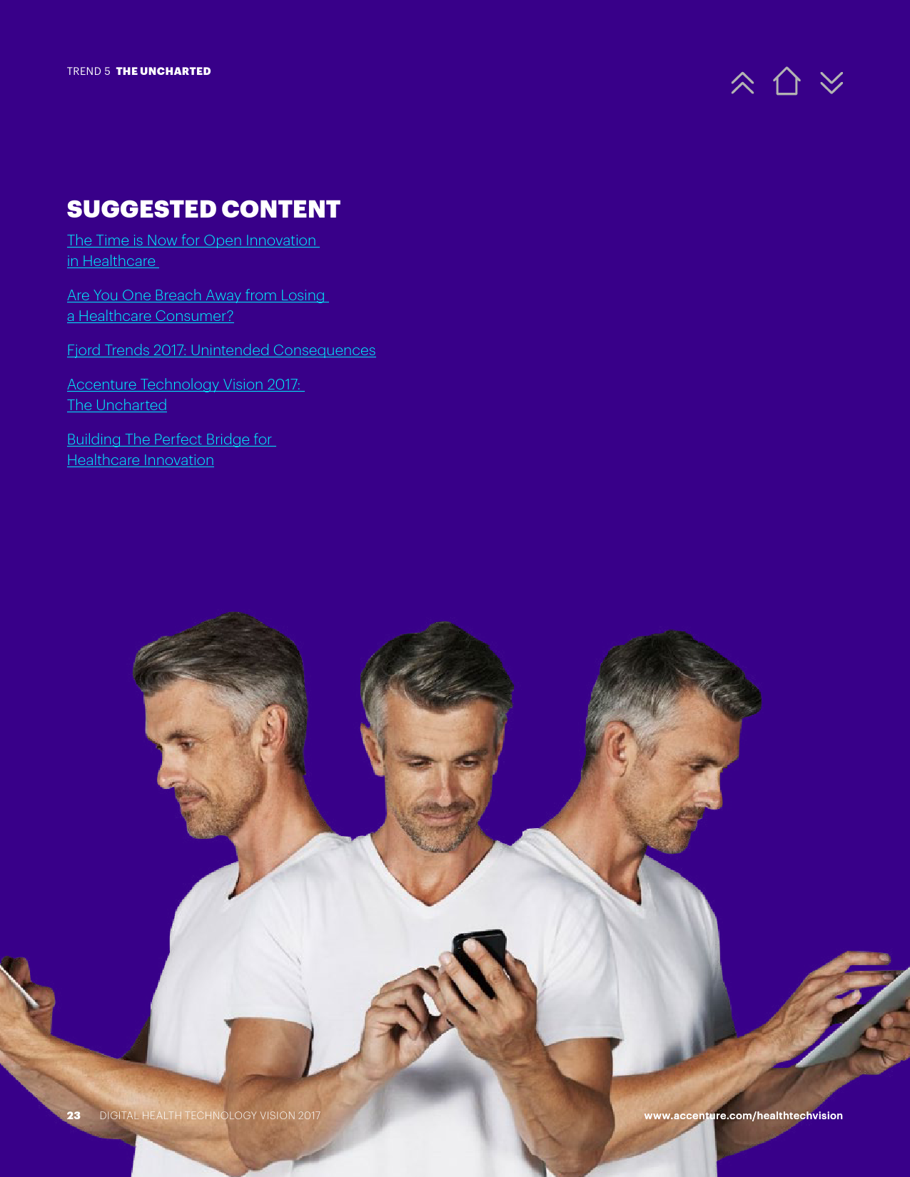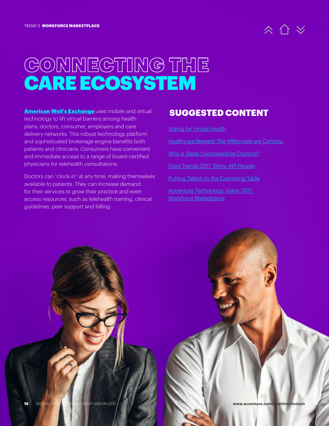 “当我们将技术根据医疗使用者而设计时,就给患者患者创造了机会,他们可以自己决定何时何地接受医疗服务。”埃森哲健康业务高级管理经理Kaveh Safavi在一次发言中说道,“随着这五大趋势的融合,健康产业将迅速利用数字技术增强劳动力、个性化医疗服务,并解放临床医生使之专注于最需要的地方。”