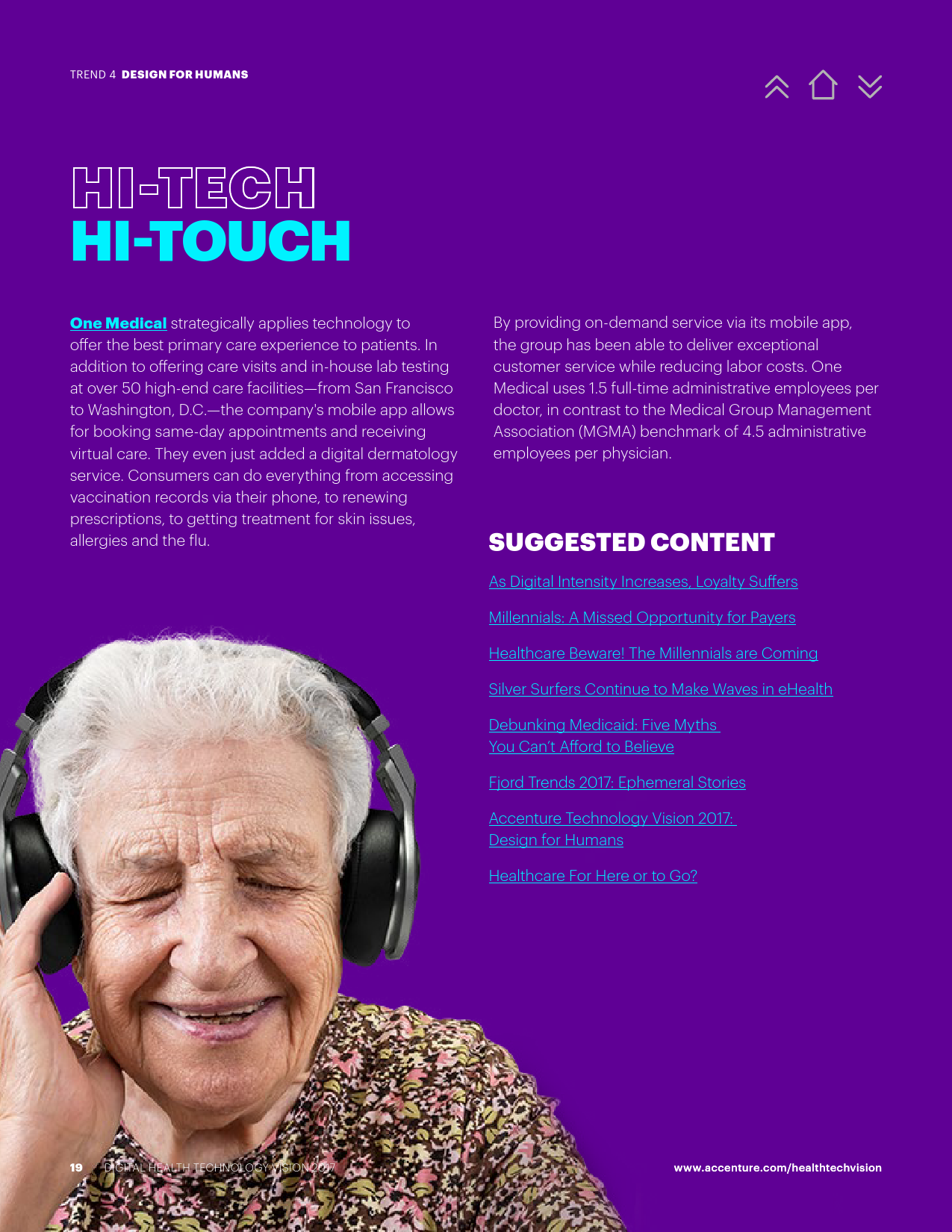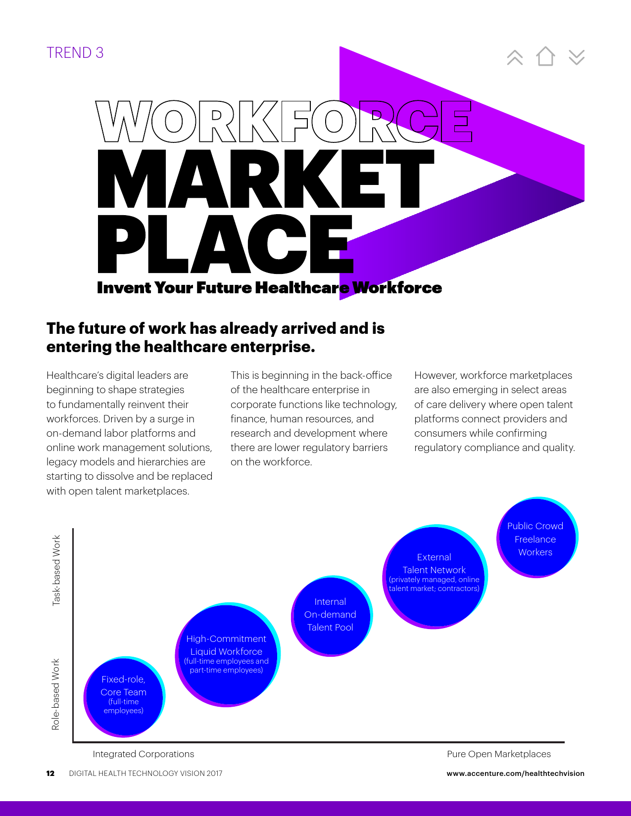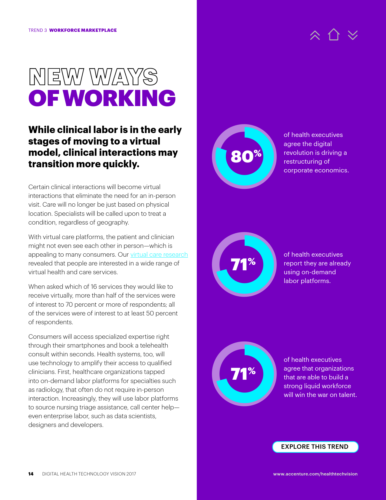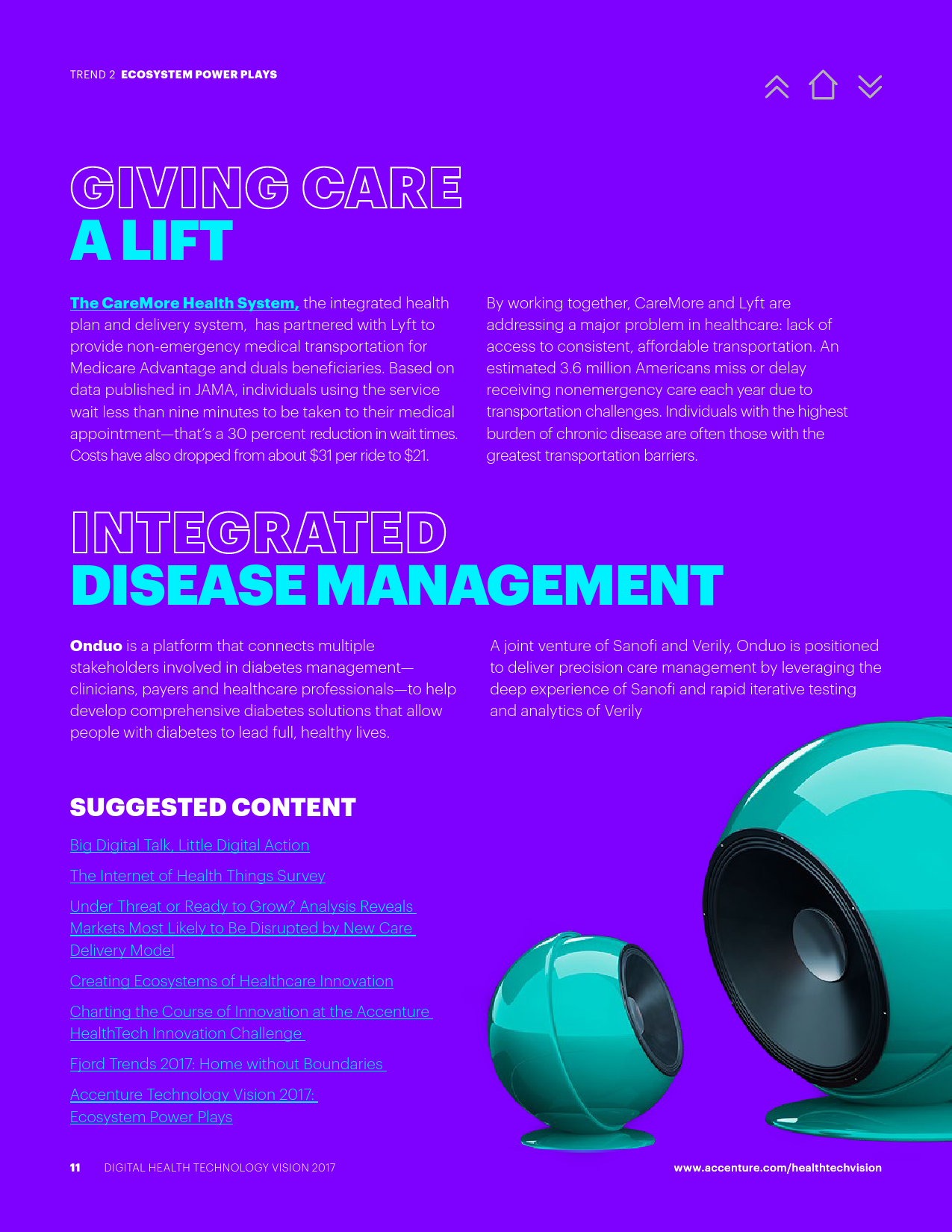“当我们将技术根据医疗使用者而设计时,就给患者患者创造了机会,他们可以自己决定何时何地接受医疗服务。”埃森哲健康业务高级管理经理Kaveh Safavi在一次发言中说道,“随着这五大趋势的融合,健康产业将迅速利用数字技术增强劳动力、个性化医疗服务,并解放临床医生使之专注于最需要的地方。”