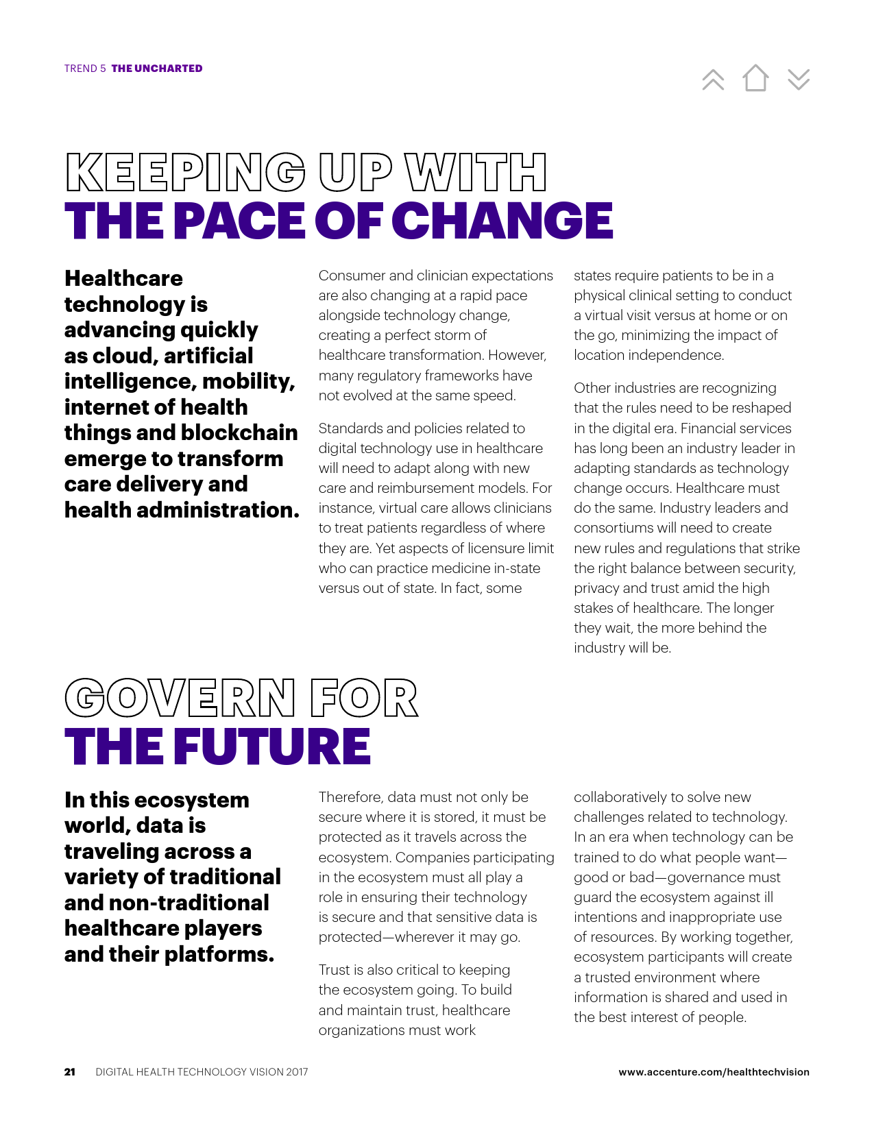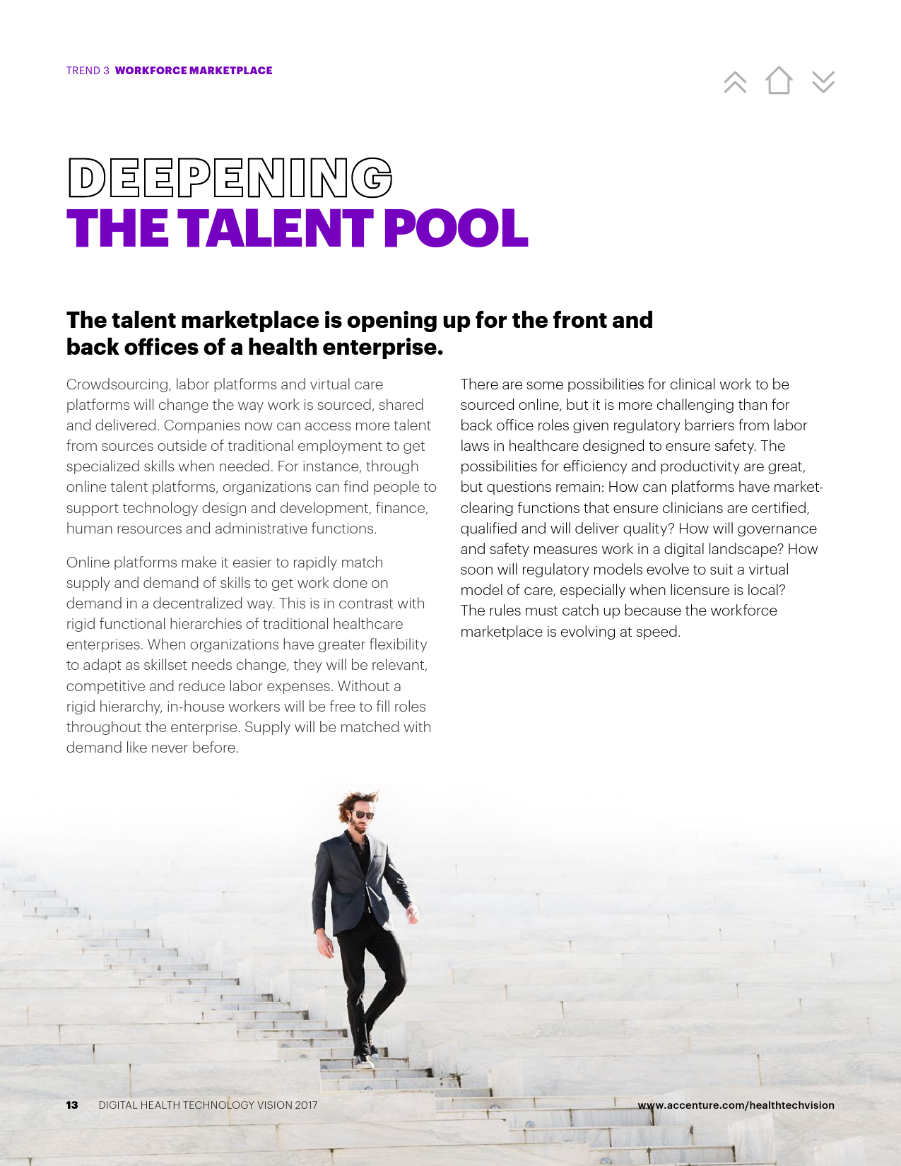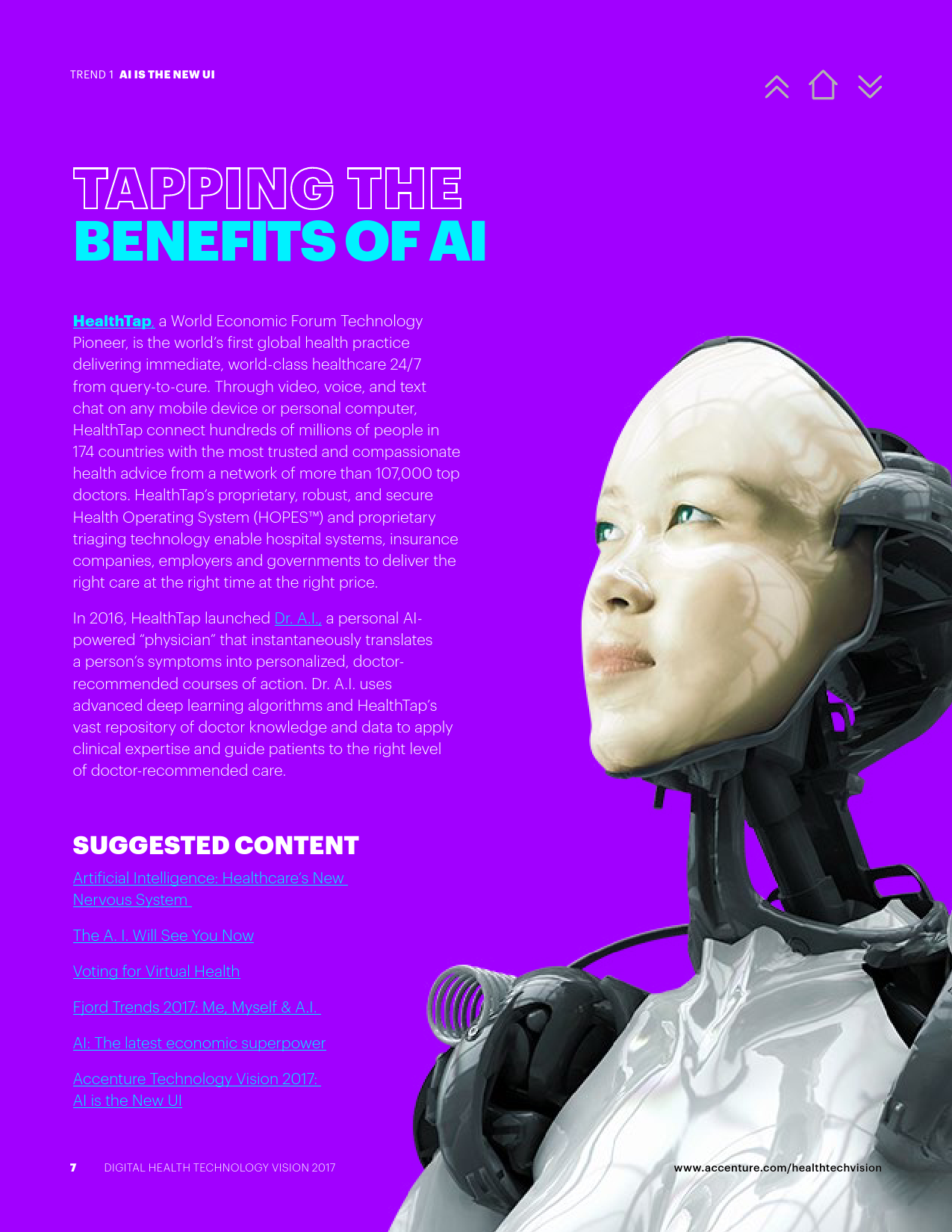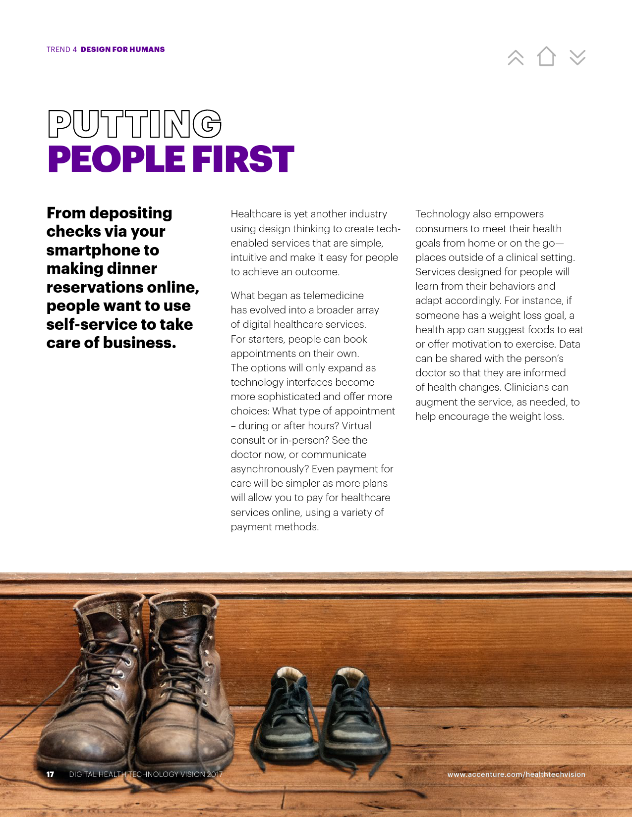 “当我们将技术根据医疗使用者而设计时,就给患者患者创造了机会,他们可以自己决定何时何地接受医疗服务。”埃森哲健康业务高级管理经理Kaveh Safavi在一次发言中说道,“随着这五大趋势的融合,健康产业将迅速利用数字技术增强劳动力、个性化医疗服务,并解放临床医生使之专注于最需要的地方。”