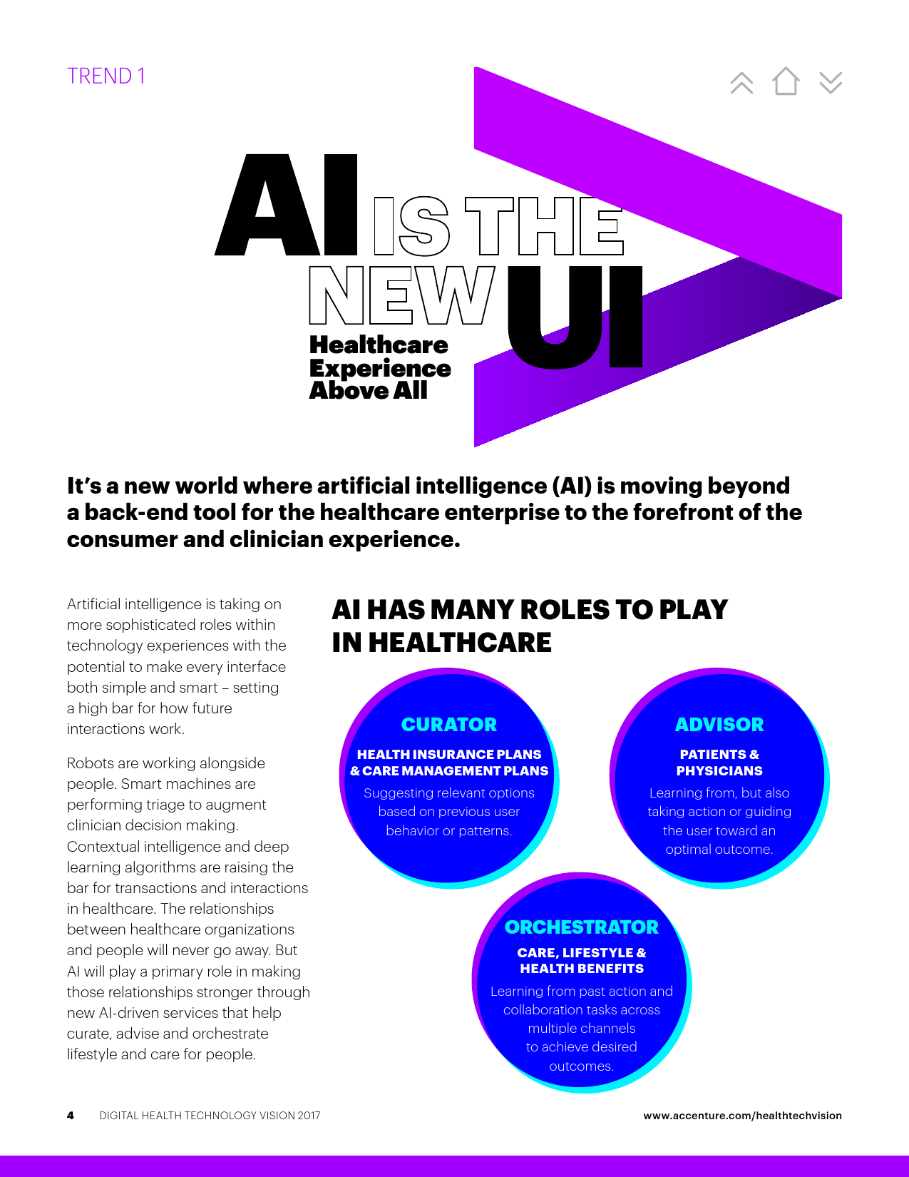 在报告中,埃森哲指出5种数字健康发展趋势,将会在未来3至5年内重塑医疗体验: