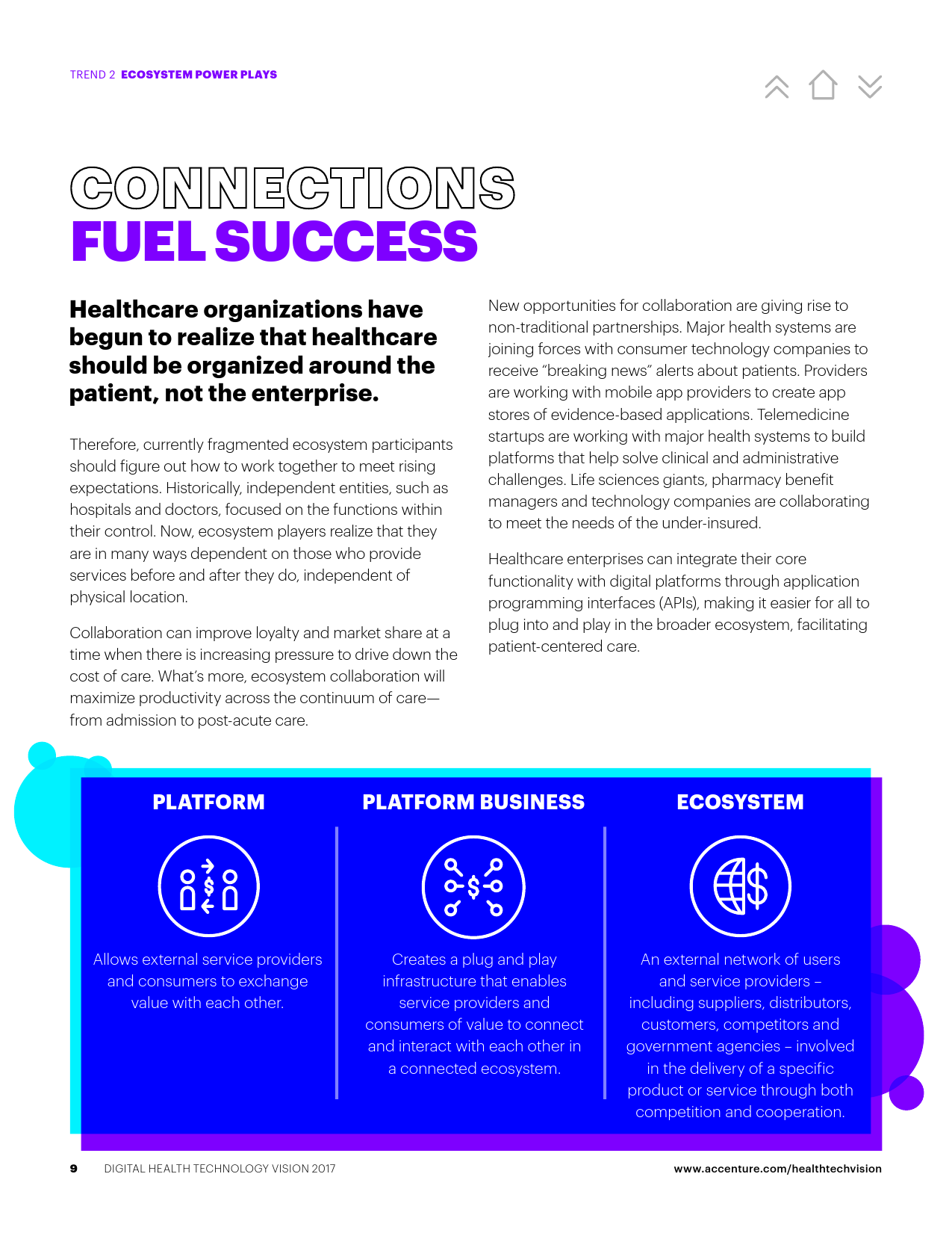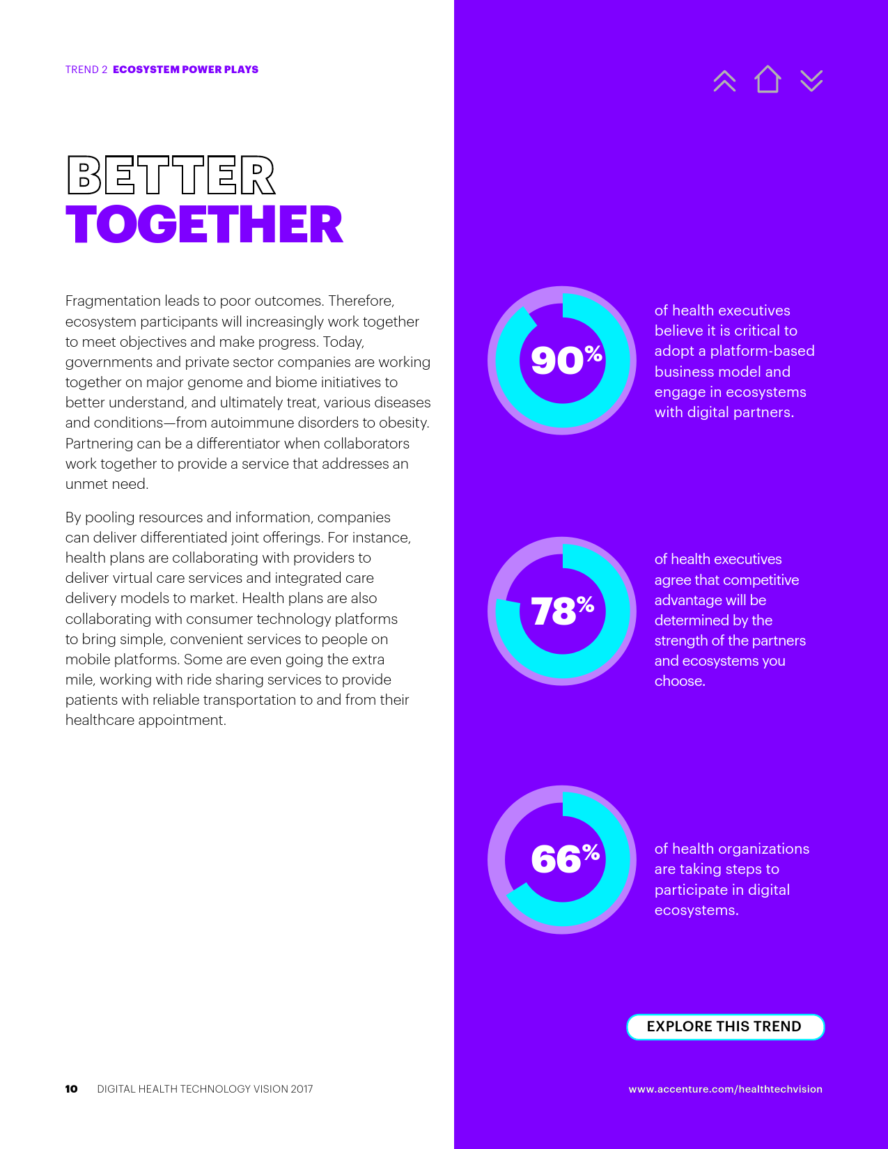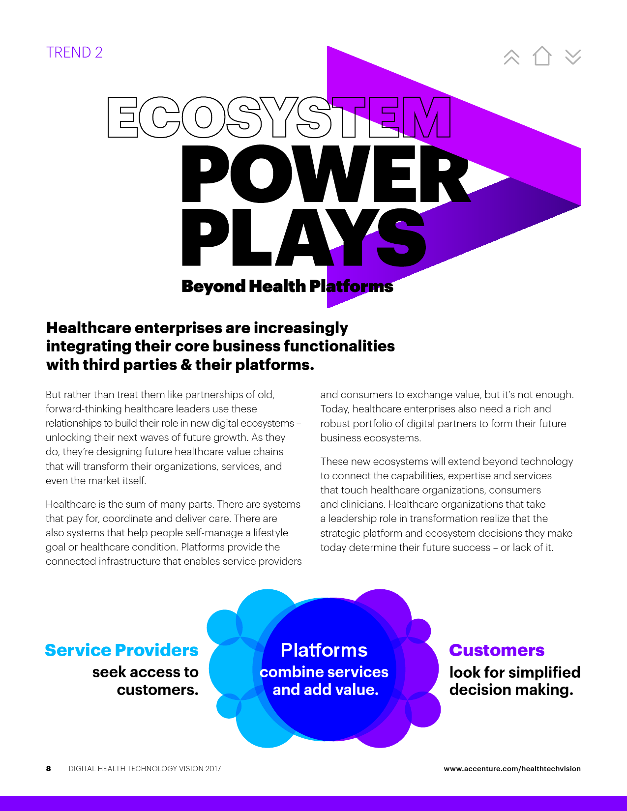 埃森哲调查发现,66%的健康组织正在采取行动加入数字生态系统,90%的医疗主管认为采用基于平台的商务模式至关重要,78%的主管认为他们所选的合作伙伴和生态系统的实力决定了未来的竞争优势。