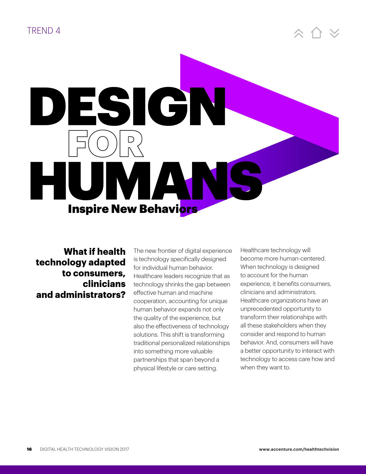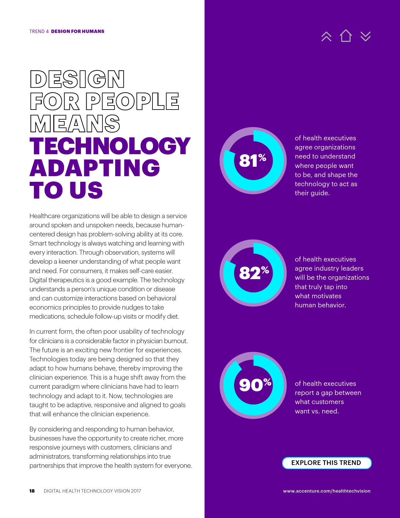 数字体验的新领域是为个体化行为设计相应技术。90%的医疗主管认为,健康消费者的想法和需求之间存在距离;81%的主管认为机构需要了解人们的想法,并通过技术来引导消费者;同样有82%的主管认为,真正挖掘出人类行为背后的秘密将成为行业的领跑者。这将使传统的人际关系发生转变,超出物质生活和疾病照护,将会更有价值。
