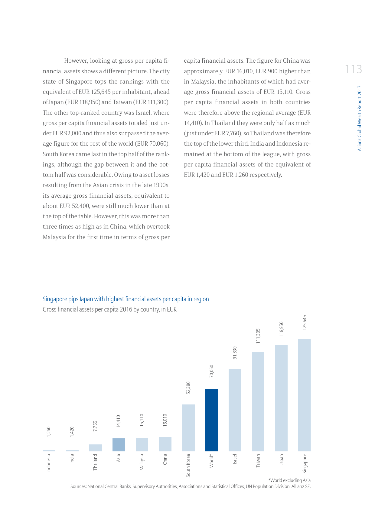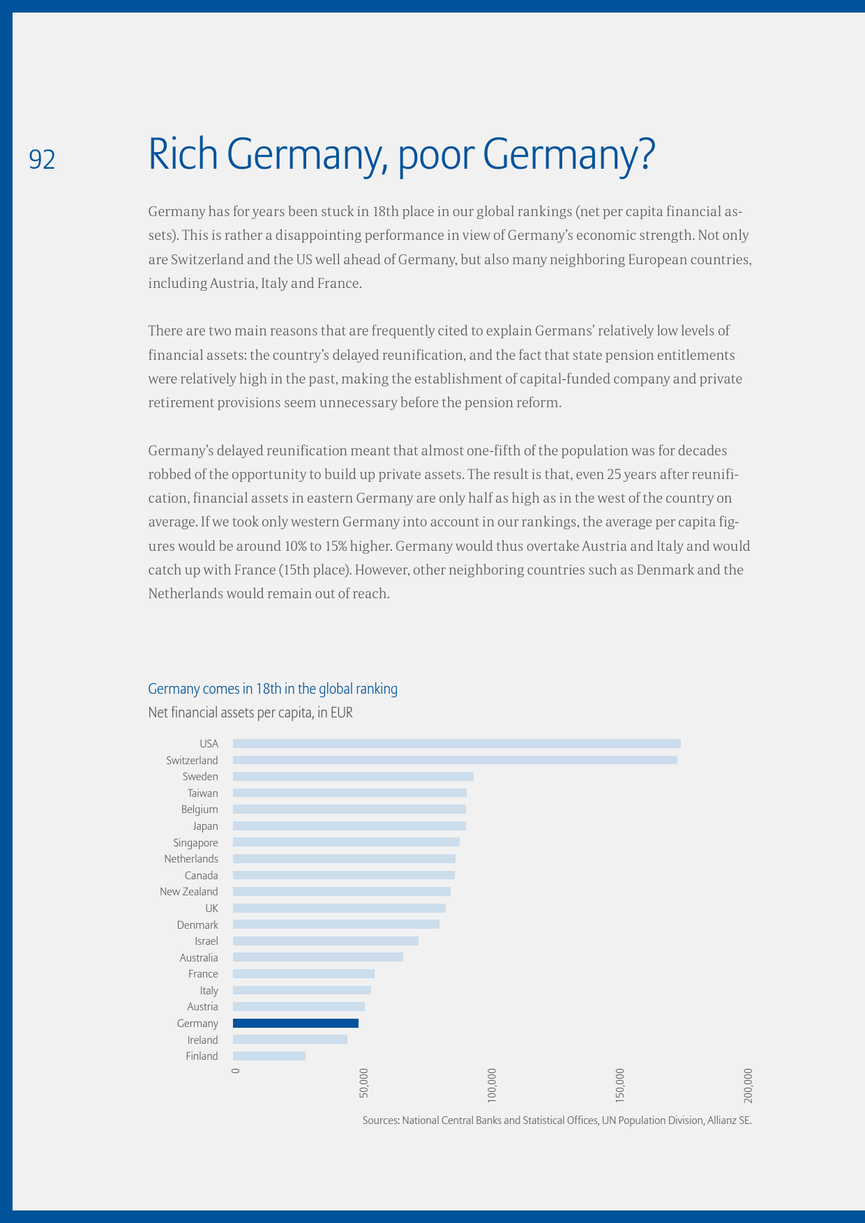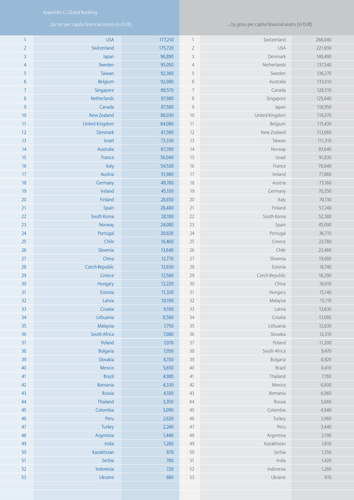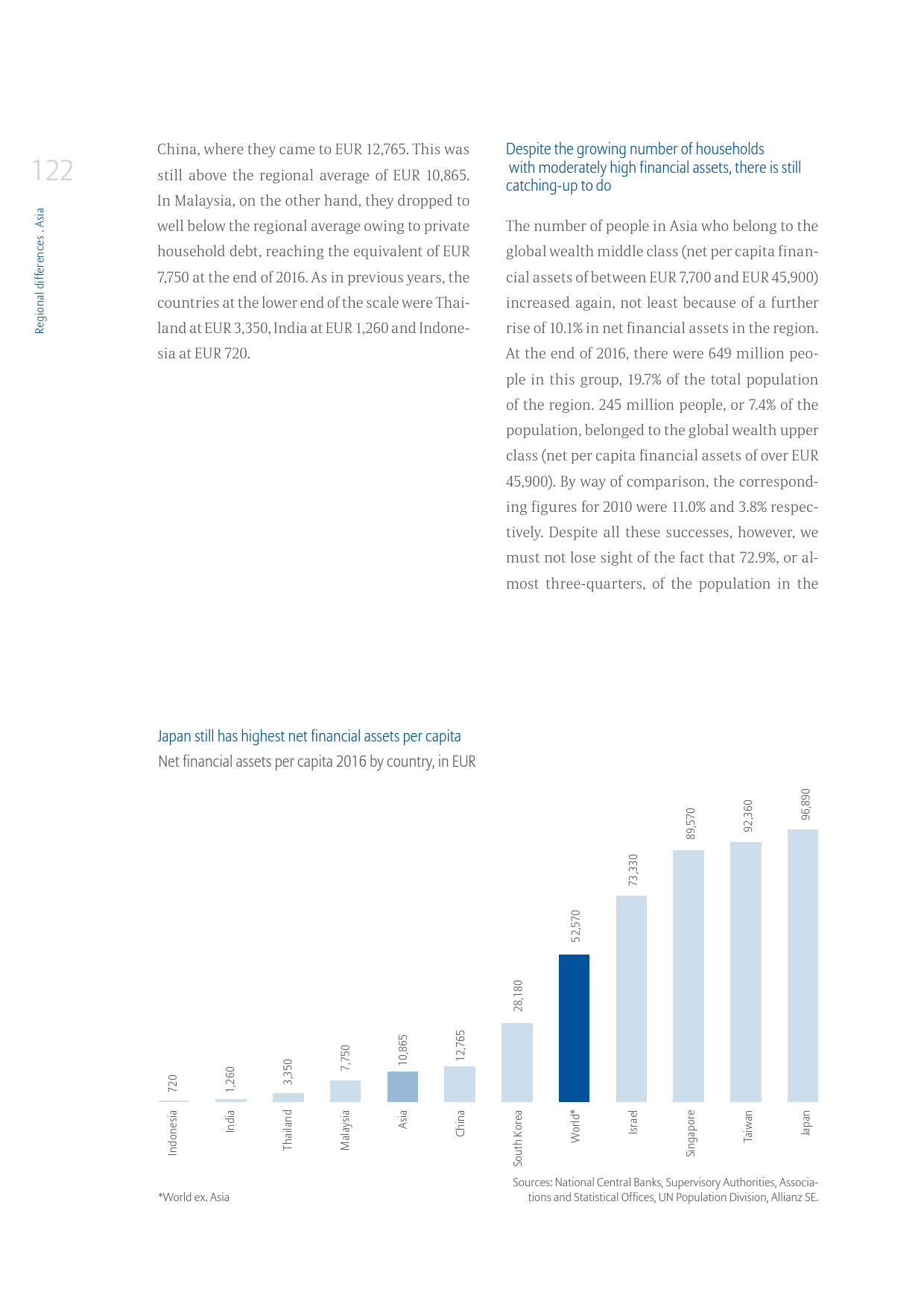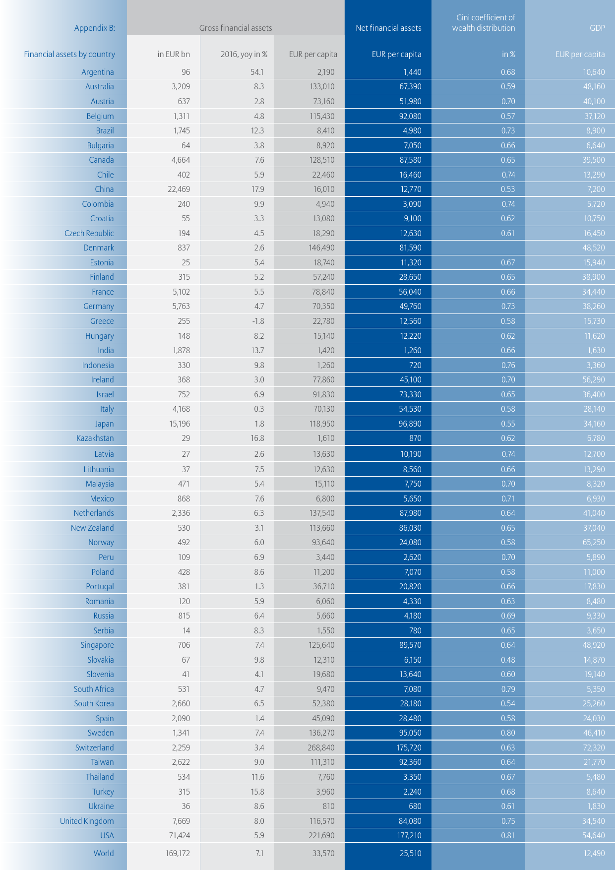 2016年,中国大陆人均金融资产净值为12765欧元,全球排名从2000年的第40位上升至第27位。日本、台湾和新加坡均跻身前20,其中台湾为92360欧元,全球排名第5位。排名第一的是美国,人均金融资产净值为177210欧元。之后为瑞士(175720欧元)、日本(96890欧元)、瑞典(95050欧元)。德国排名第18位(48760欧元)。