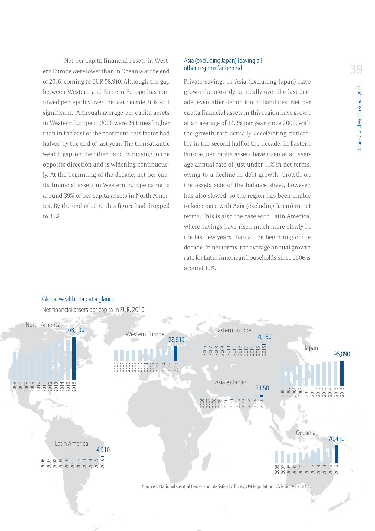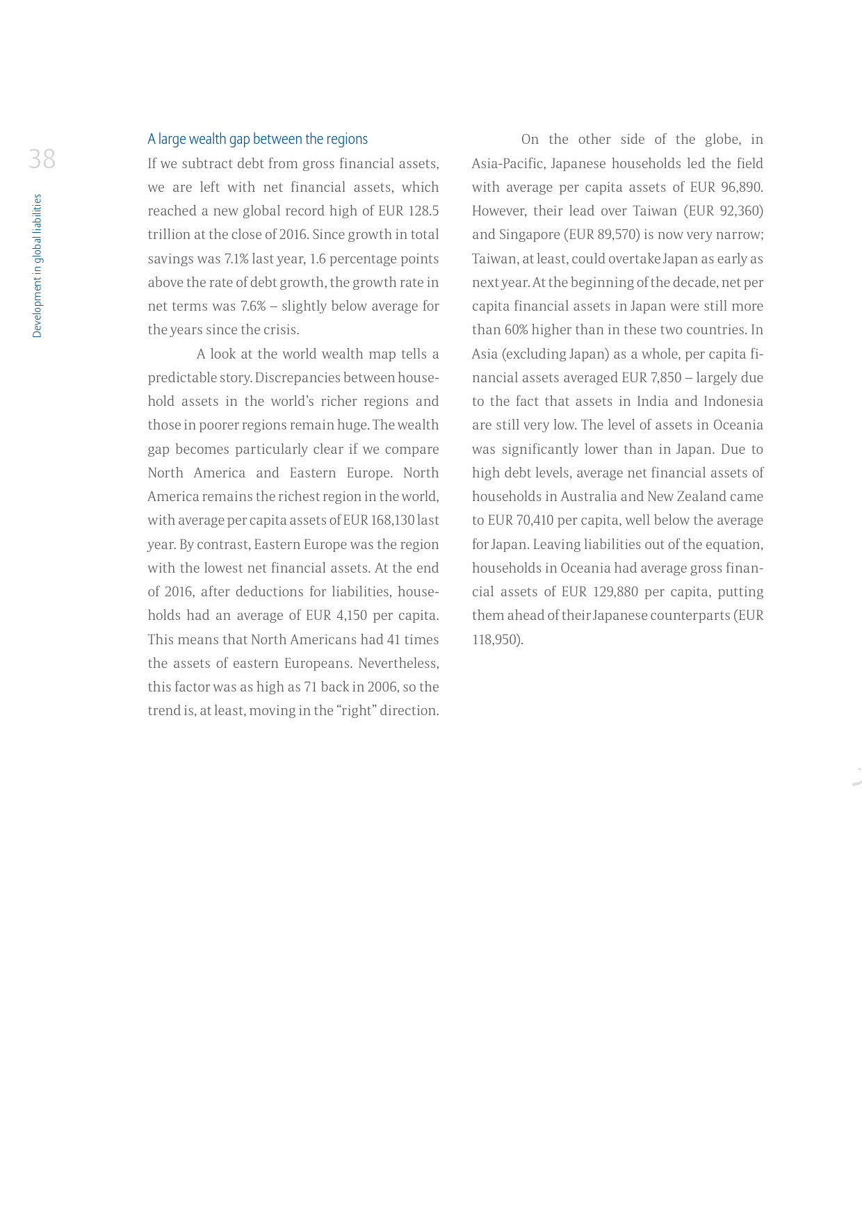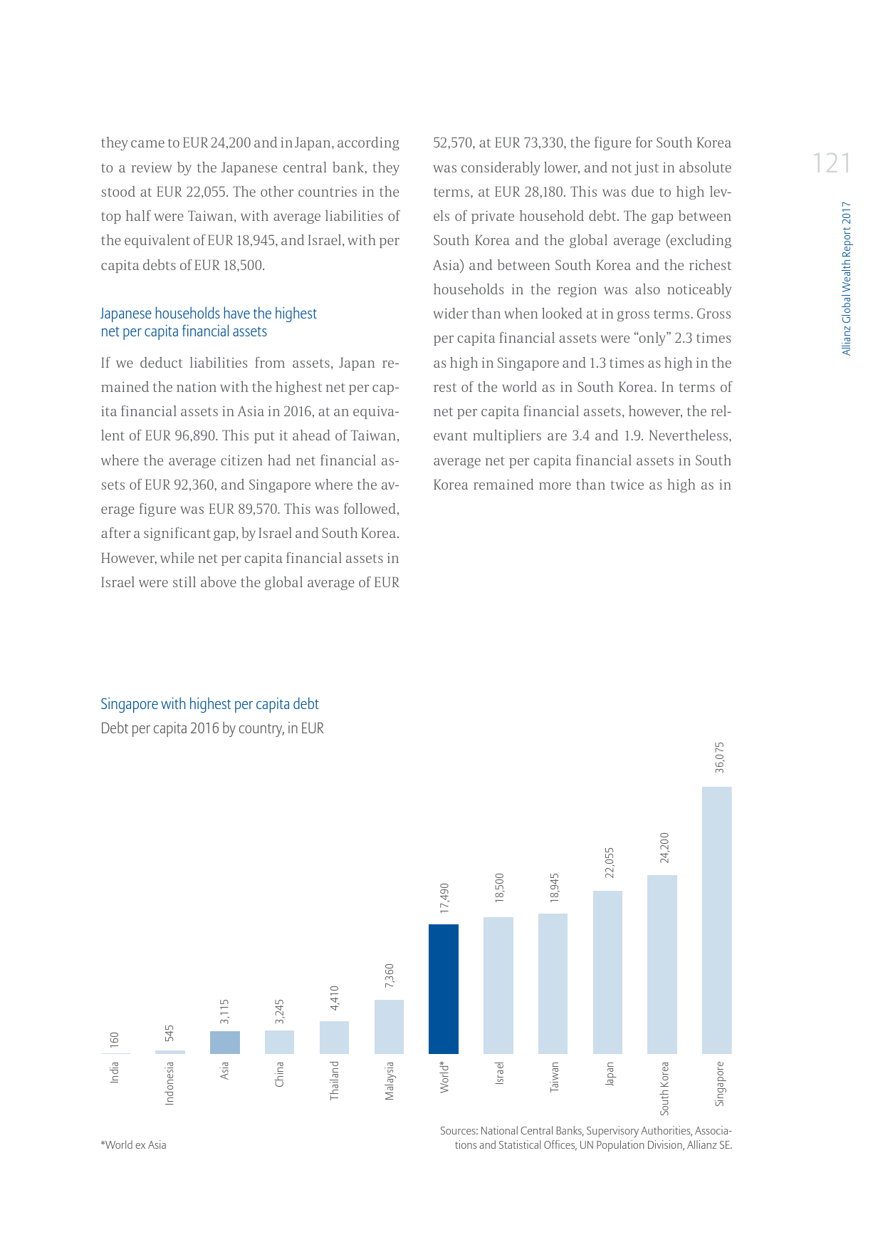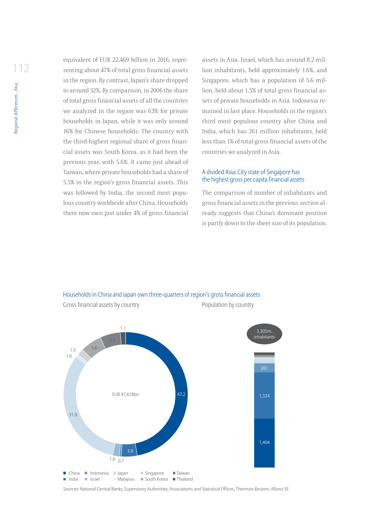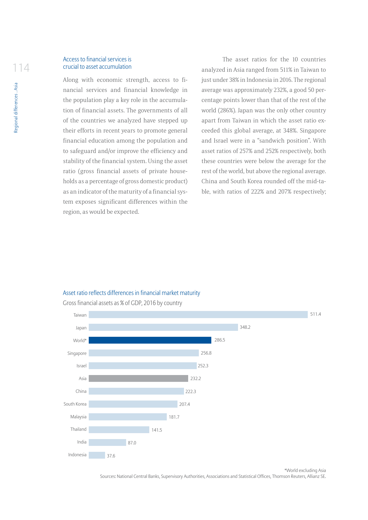 2016年,中国大陆人均金融资产净值为12765欧元,全球排名从2000年的第40位上升至第27位。日本、台湾和新加坡均跻身前20,其中台湾为92360欧元,全球排名第5位。排名第一的是美国,人均金融资产净值为177210欧元。之后为瑞士(175720欧元)、日本(96890欧元)、瑞典(95050欧元)。德国排名第18位(48760欧元)。