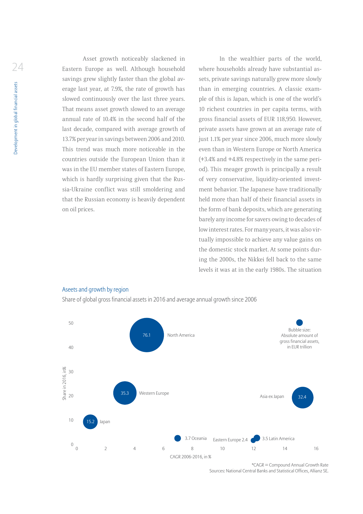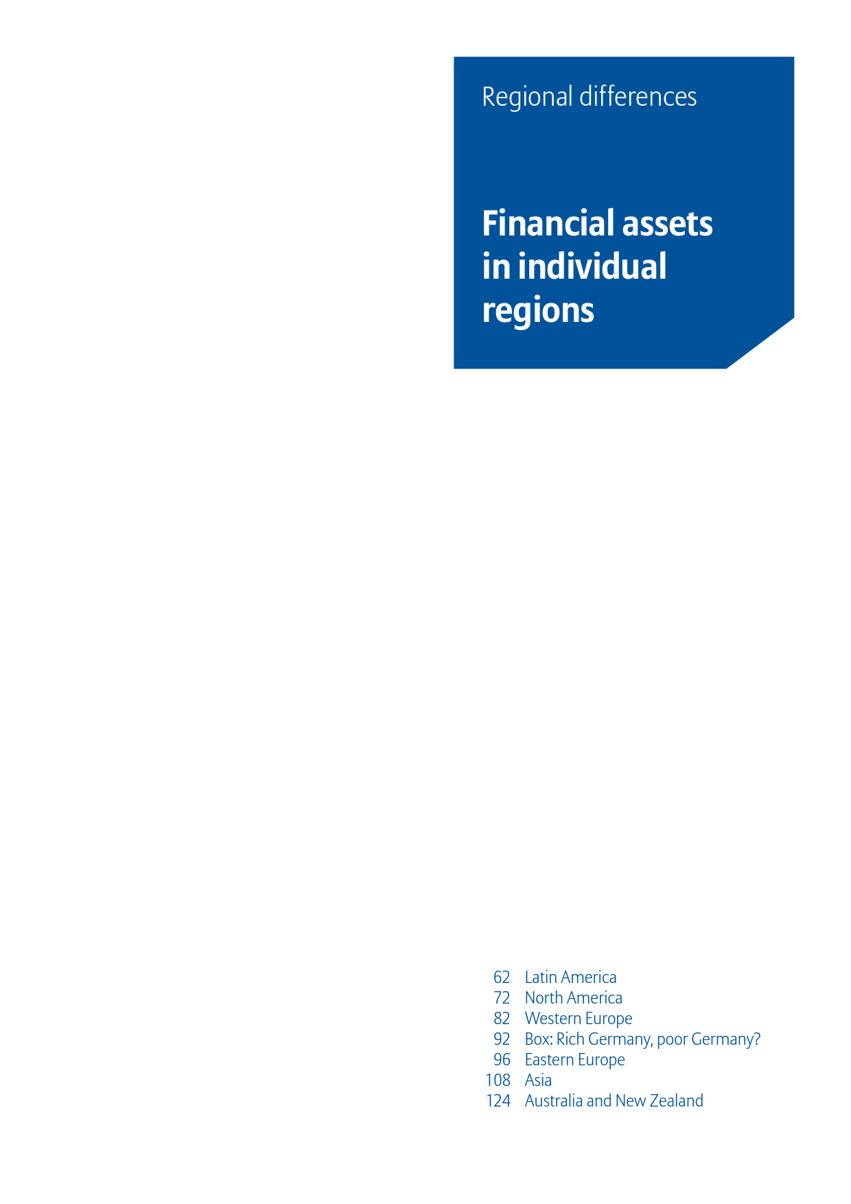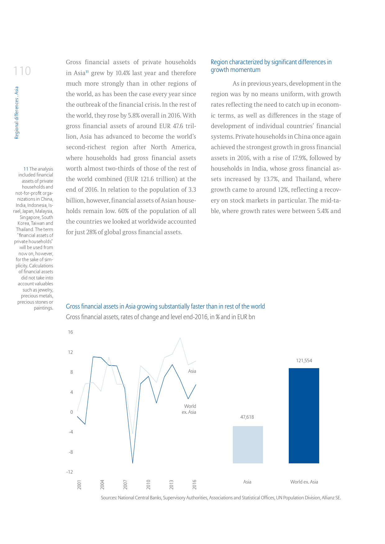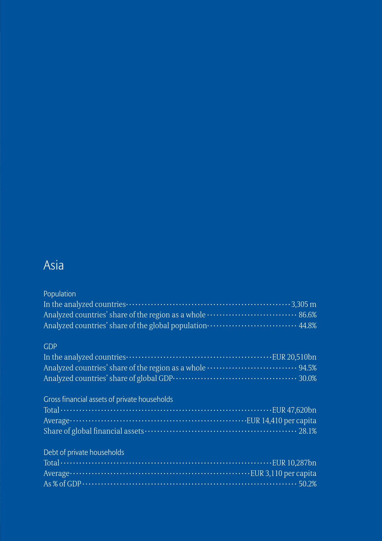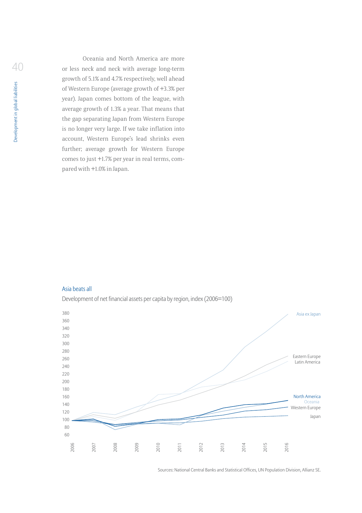2016年,中国大陆人均金融资产净值为12765欧元,全球排名从2000年的第40位上升至第27位。日本、台湾和新加坡均跻身前20,其中台湾为92360欧元,全球排名第5位。排名第一的是美国,人均金融资产净值为177210欧元。之后为瑞士(175720欧元)、日本(96890欧元)、瑞典(95050欧元)。德国排名第18位(48760欧元)。