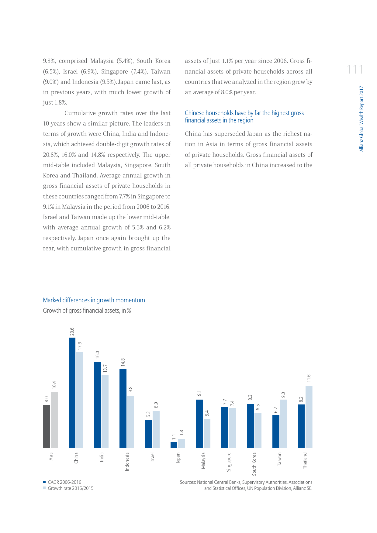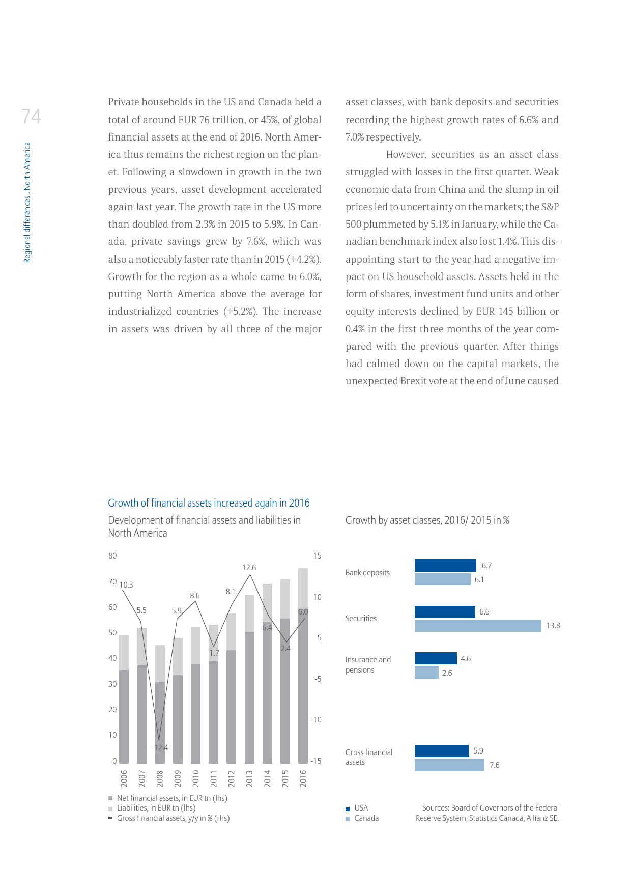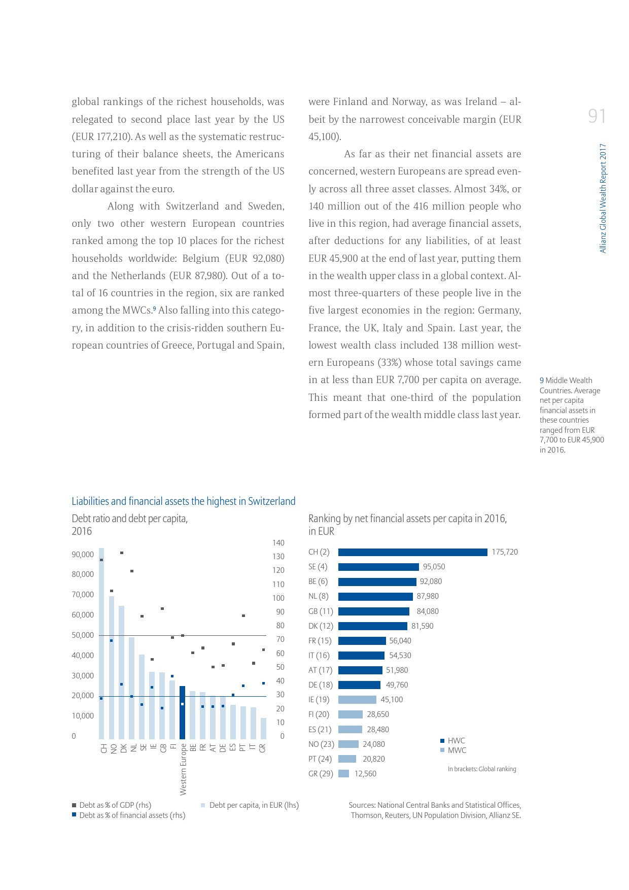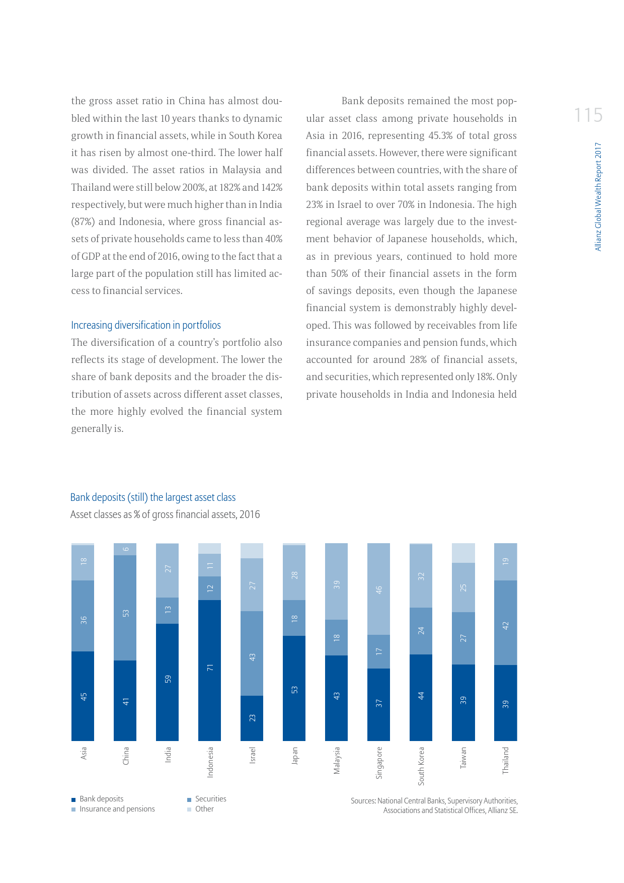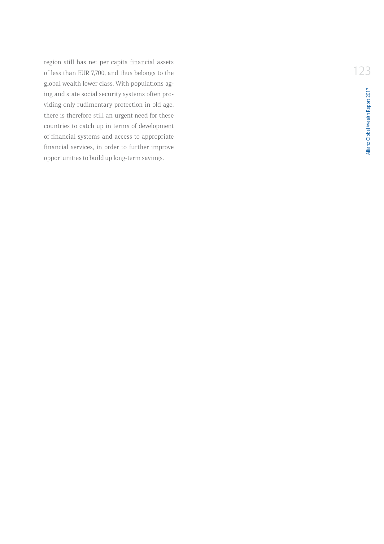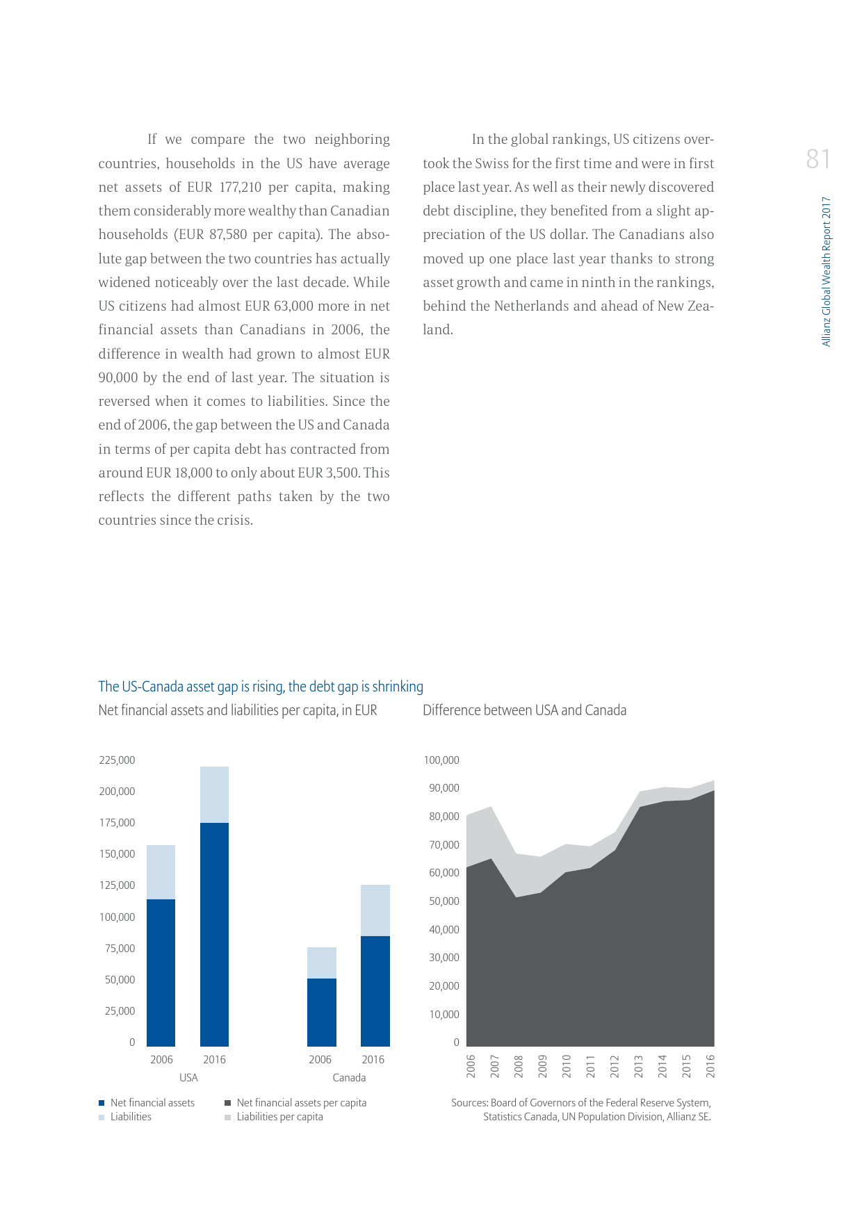 2016年,中国大陆人均金融资产净值为12765欧元,全球排名从2000年的第40位上升至第27位。日本、台湾和新加坡均跻身前20,其中台湾为92360欧元,全球排名第5位。排名第一的是美国,人均金融资产净值为177210欧元。之后为瑞士(175720欧元)、日本(96890欧元)、瑞典(95050欧元)。德国排名第18位(48760欧元)。