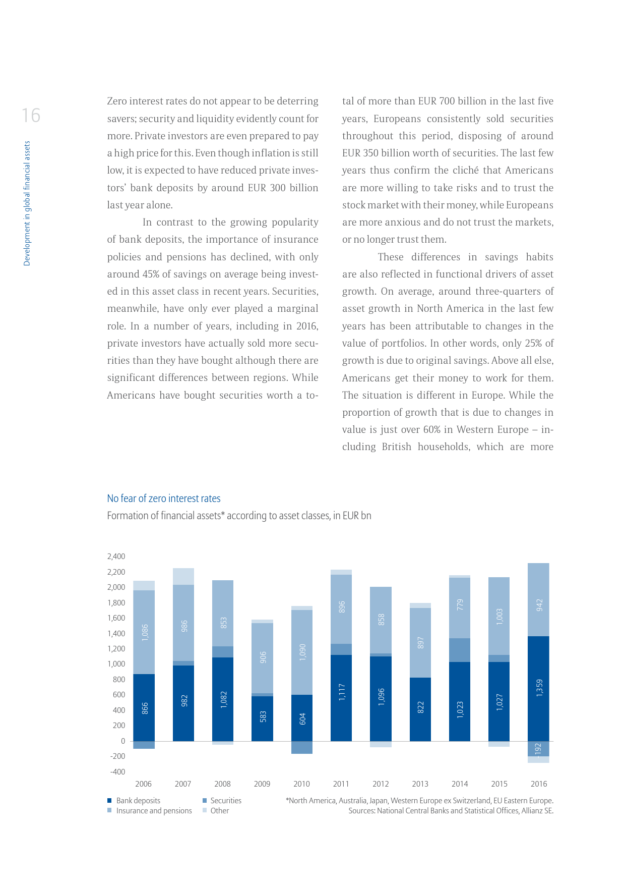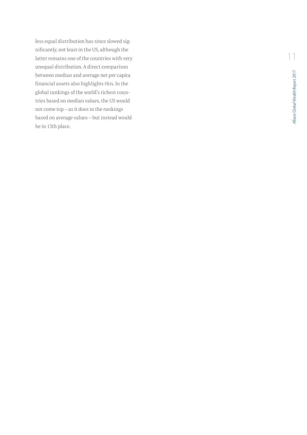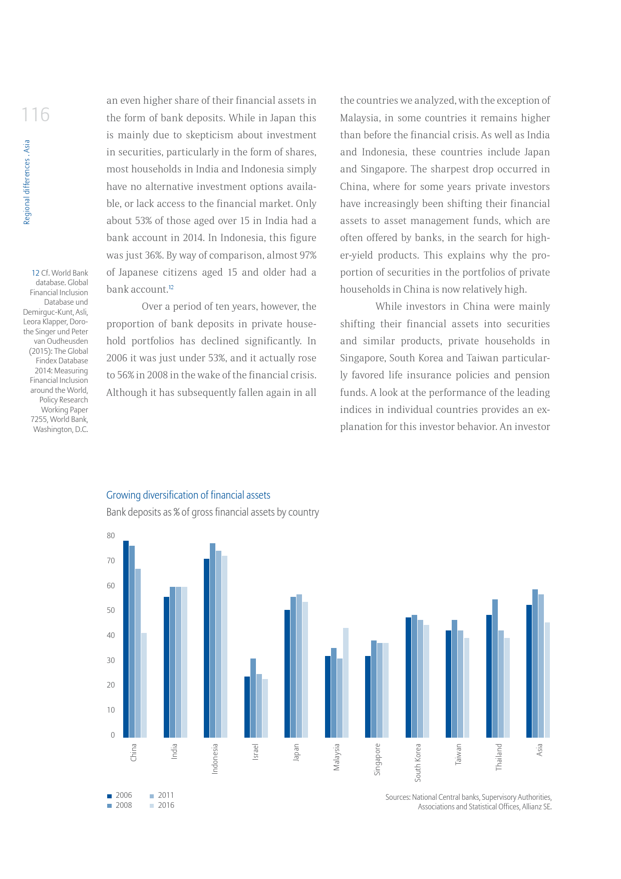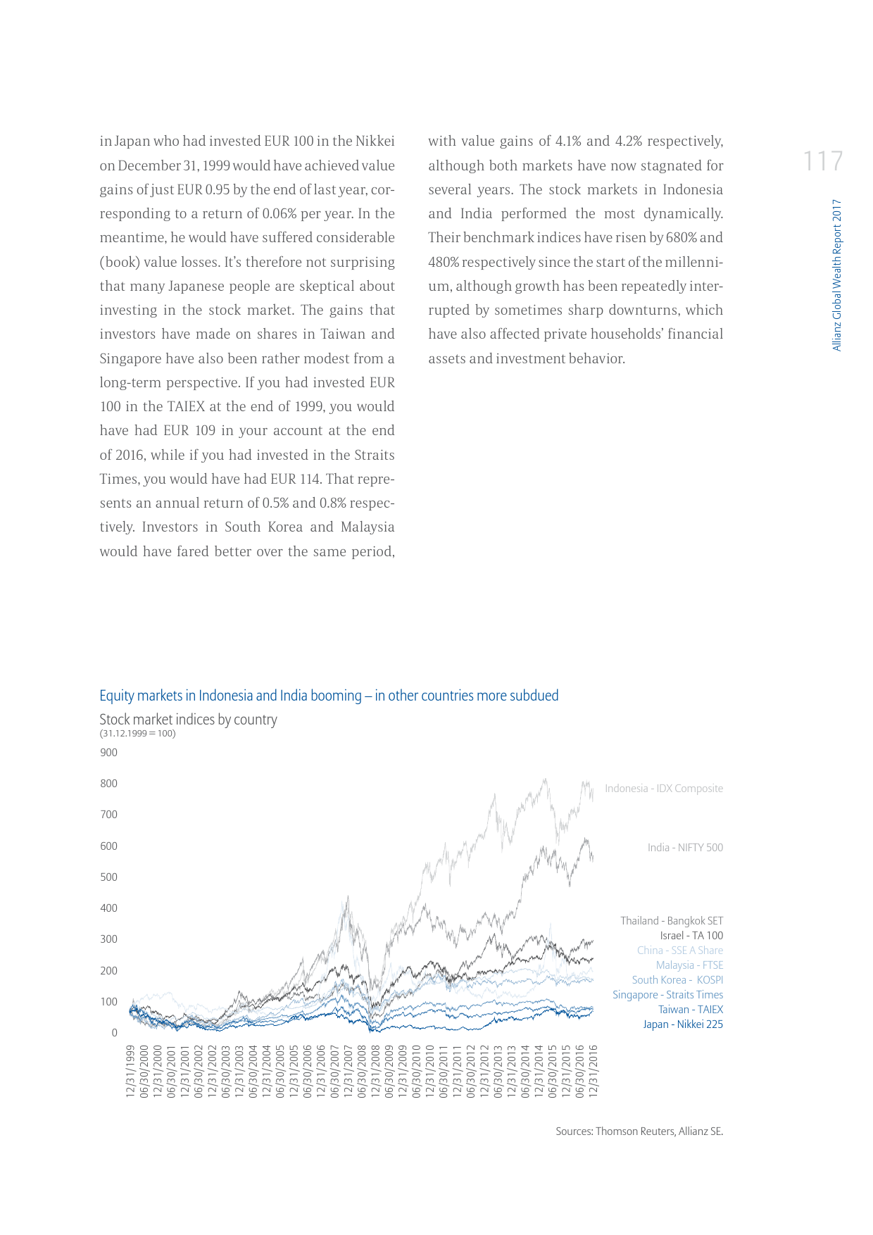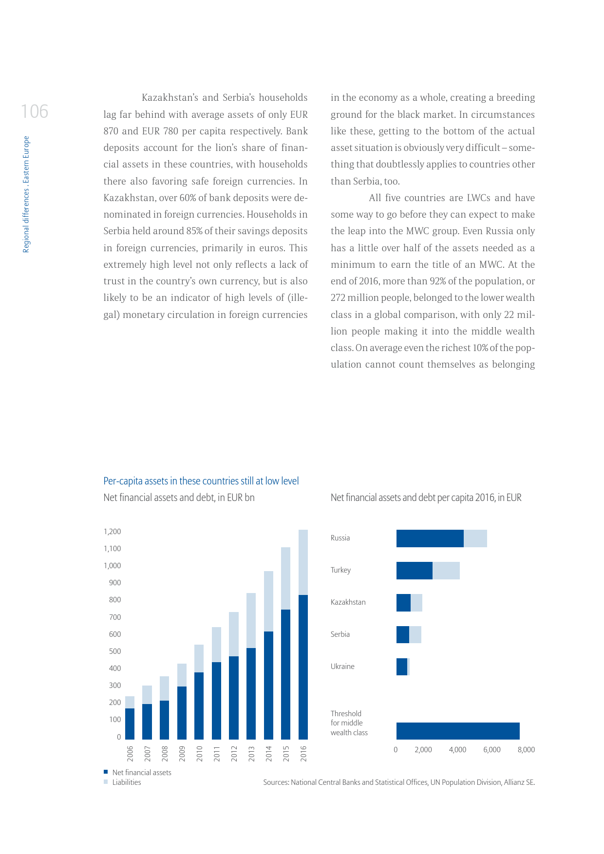 2016年,中国大陆人均金融资产净值为12765欧元,全球排名从2000年的第40位上升至第27位。日本、台湾和新加坡均跻身前20,其中台湾为92360欧元,全球排名第5位。排名第一的是美国,人均金融资产净值为177210欧元。之后为瑞士(175720欧元)、日本(96890欧元)、瑞典(95050欧元)。德国排名第18位(48760欧元)。