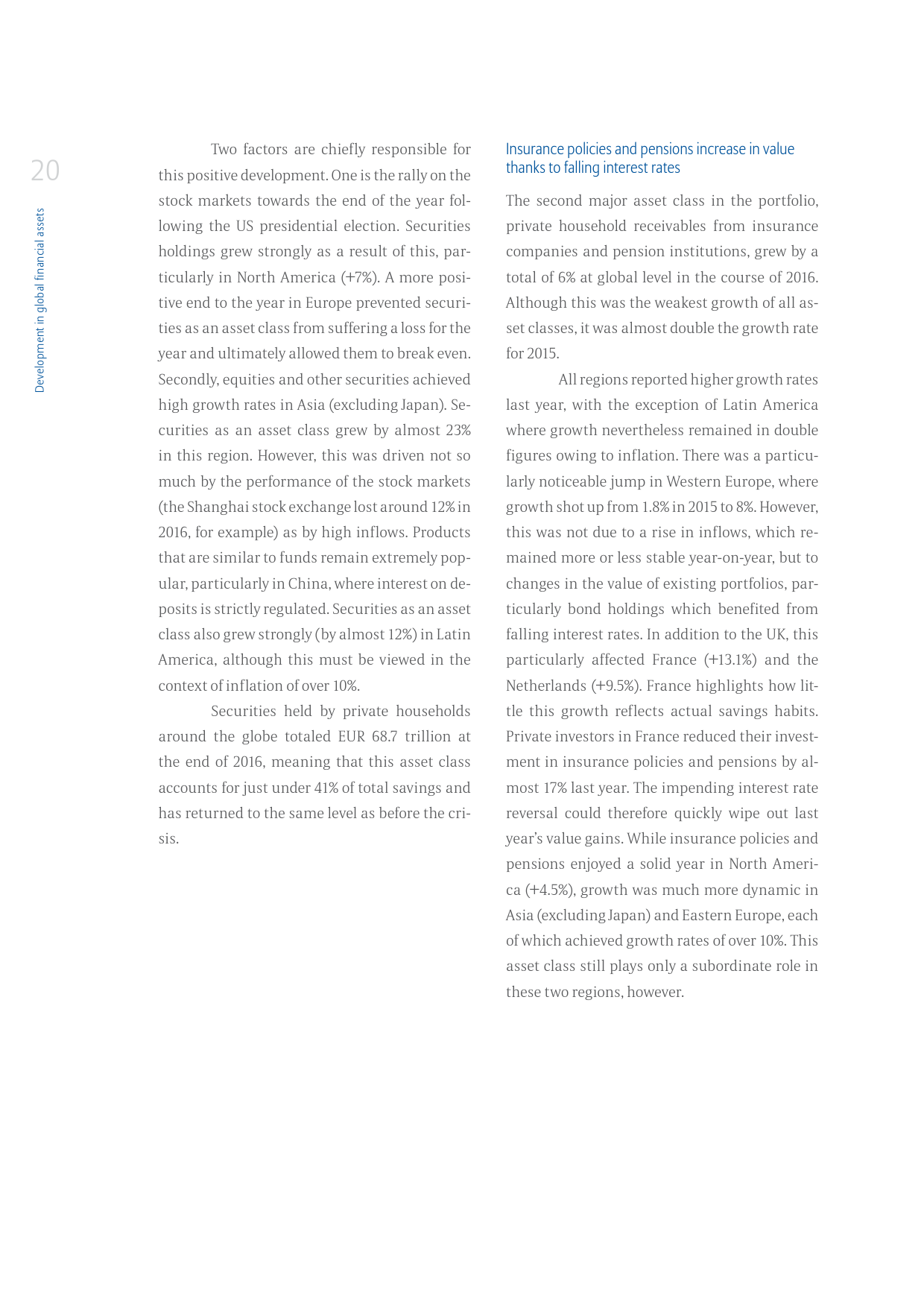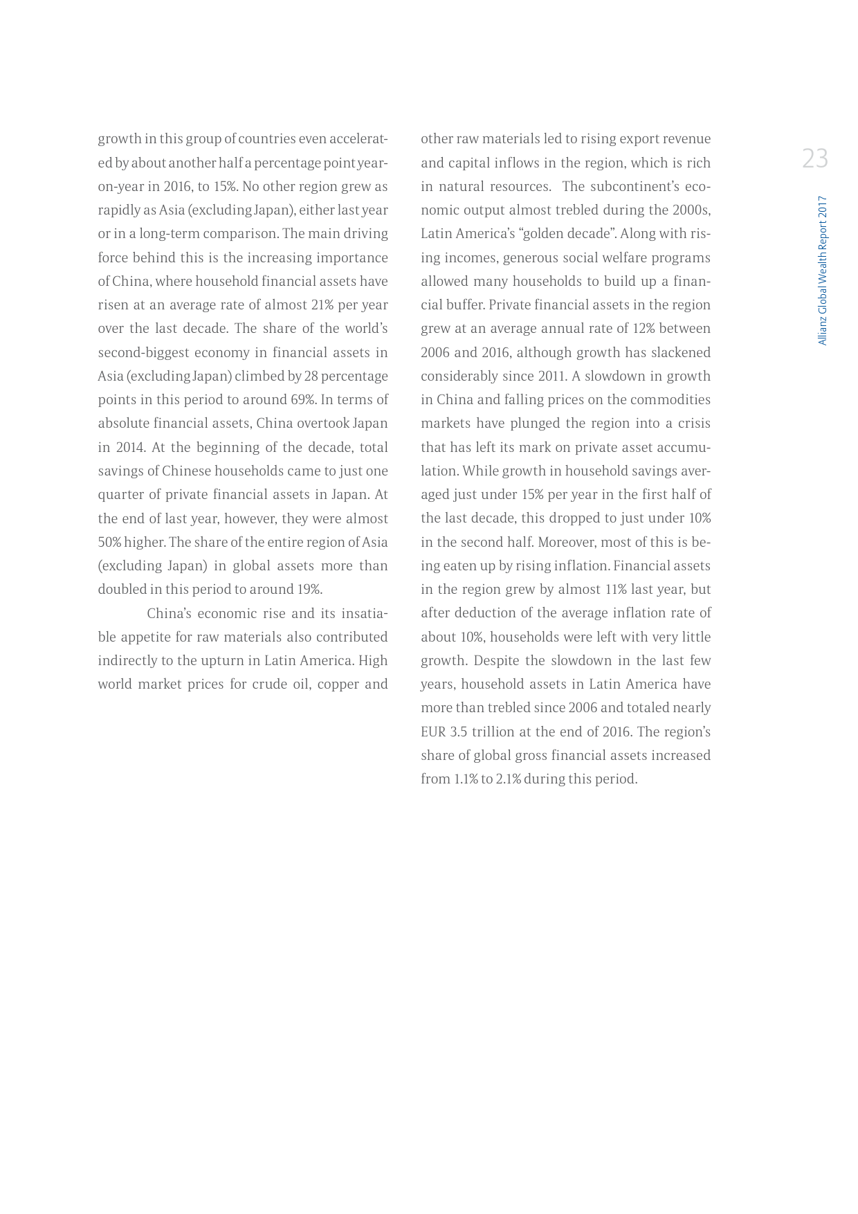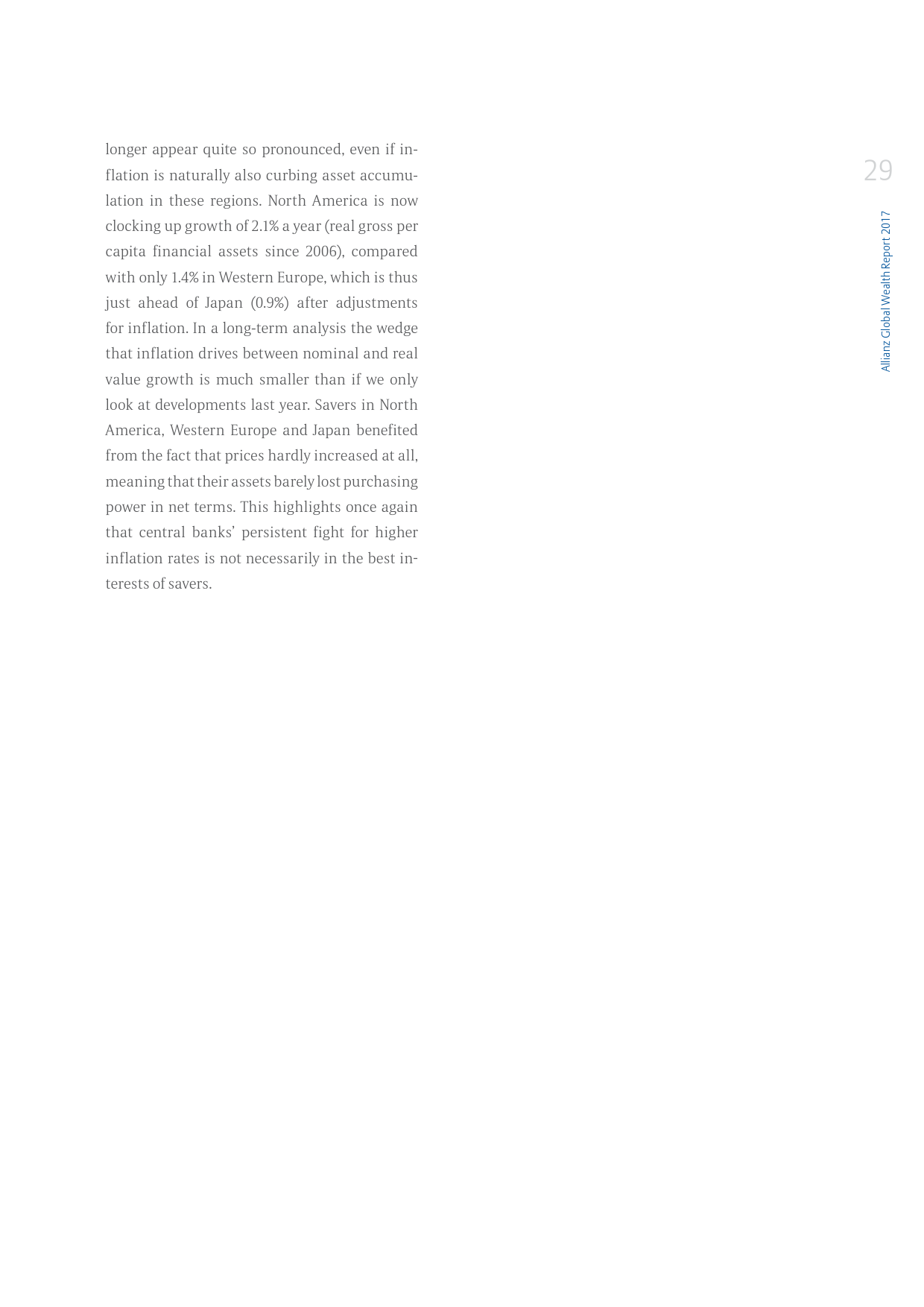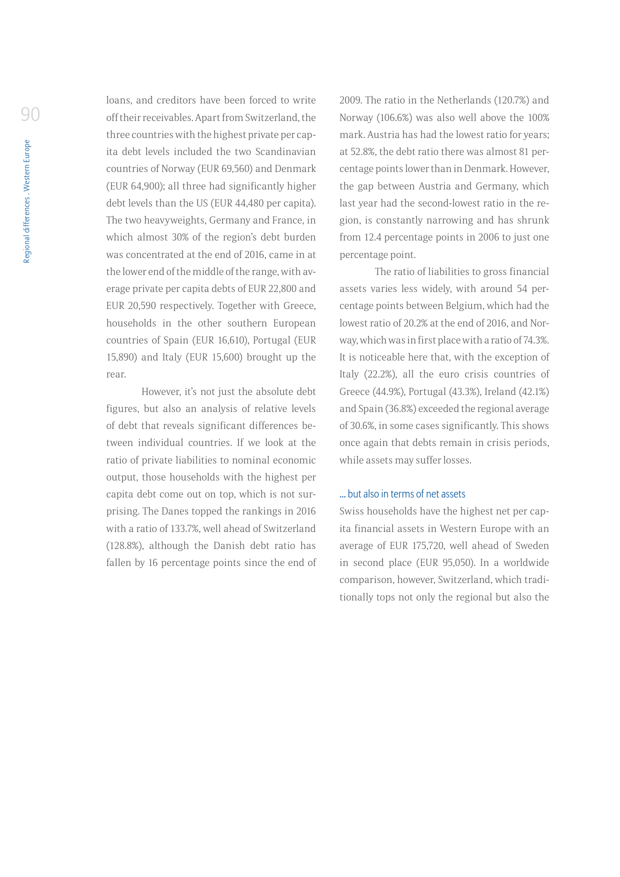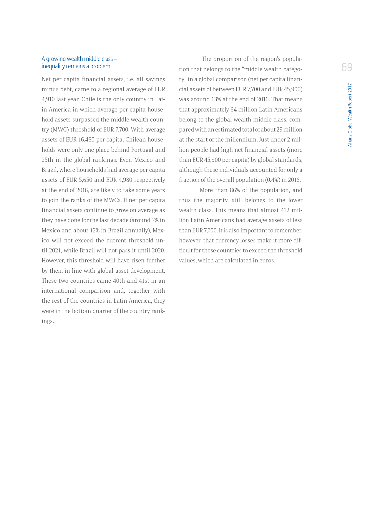 2016年,中国大陆人均金融资产净值为12765欧元,全球排名从2000年的第40位上升至第27位。日本、台湾和新加坡均跻身前20,其中台湾为92360欧元,全球排名第5位。排名第一的是美国,人均金融资产净值为177210欧元。之后为瑞士(175720欧元)、日本(96890欧元)、瑞典(95050欧元)。德国排名第18位(48760欧元)。