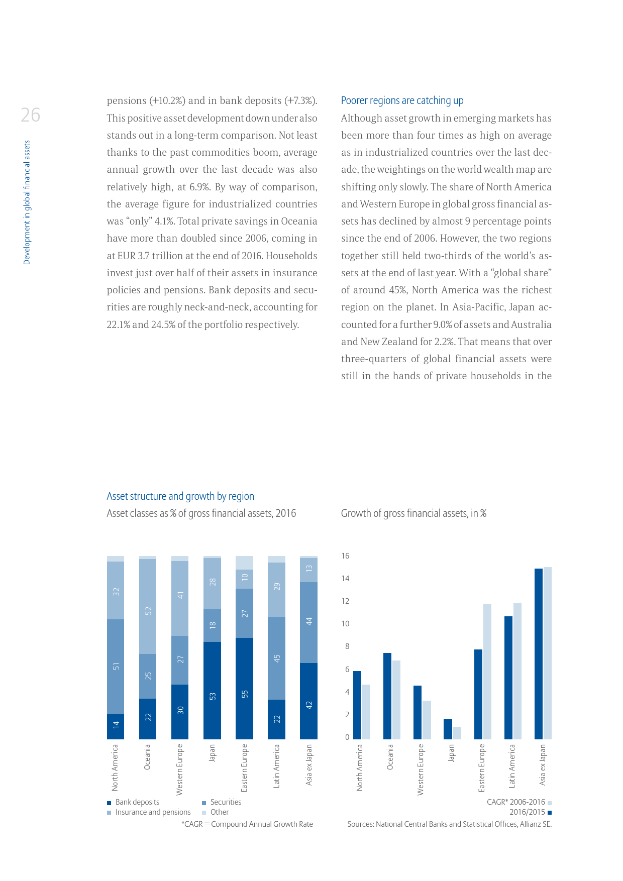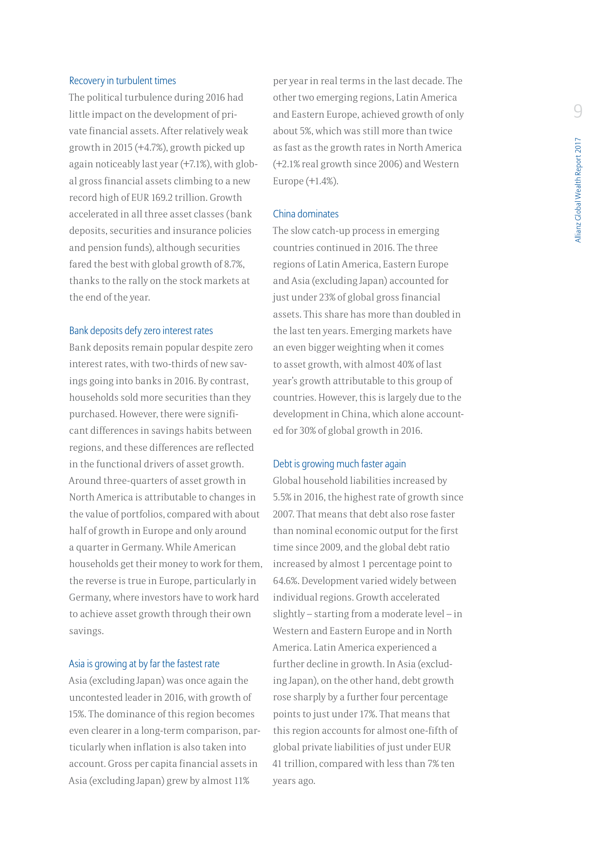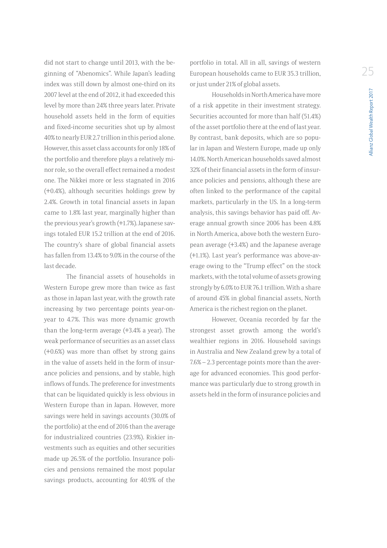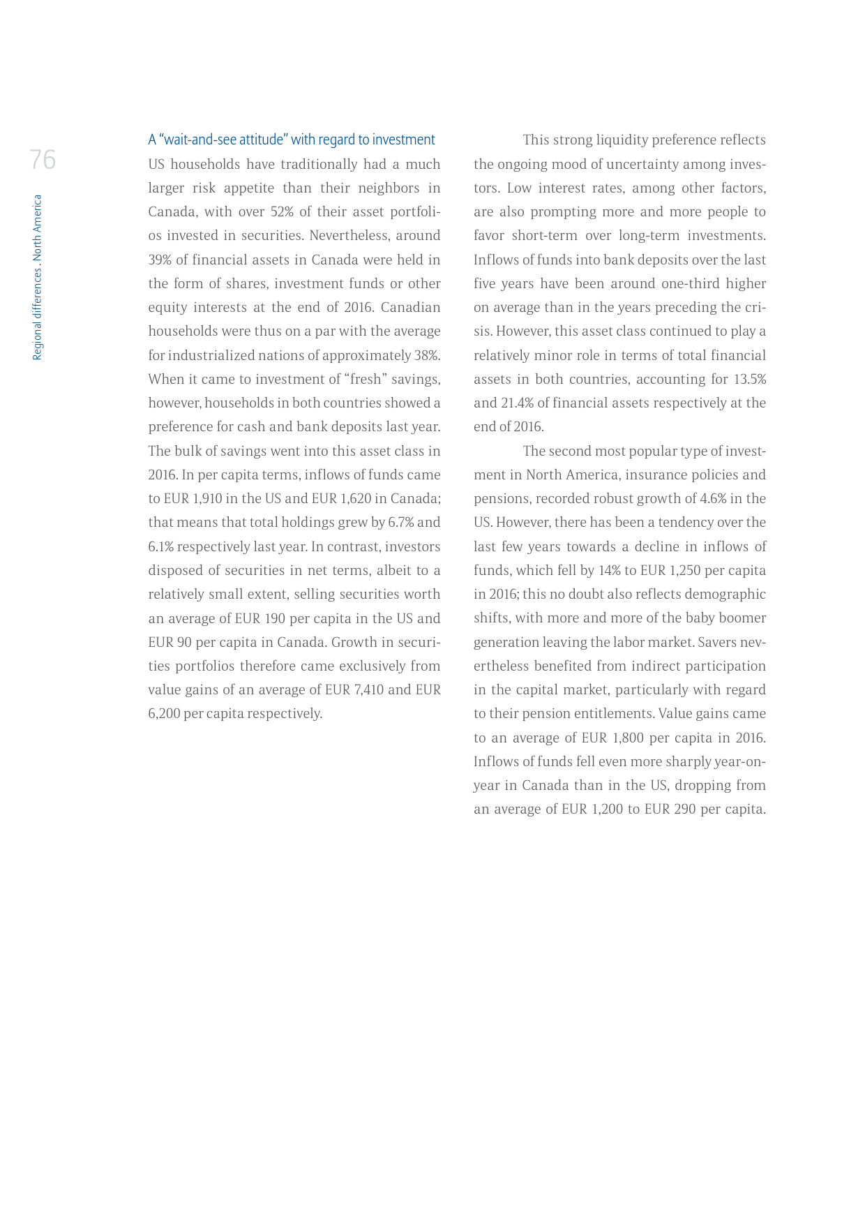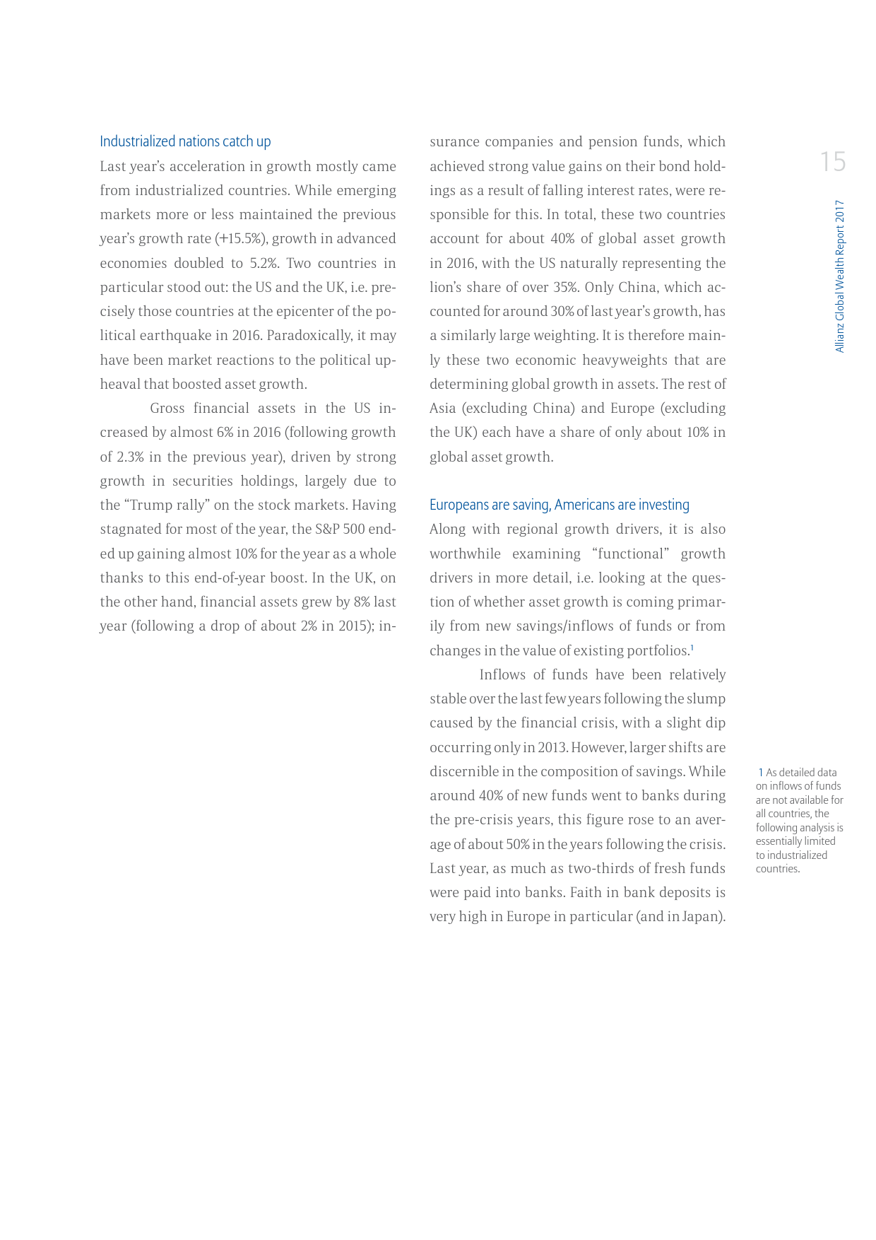 2016年,中国大陆人均金融资产净值为12765欧元,全球排名从2000年的第40位上升至第27位。日本、台湾和新加坡均跻身前20,其中台湾为92360欧元,全球排名第5位。排名第一的是美国,人均金融资产净值为177210欧元。之后为瑞士(175720欧元)、日本(96890欧元)、瑞典(95050欧元)。德国排名第18位(48760欧元)。