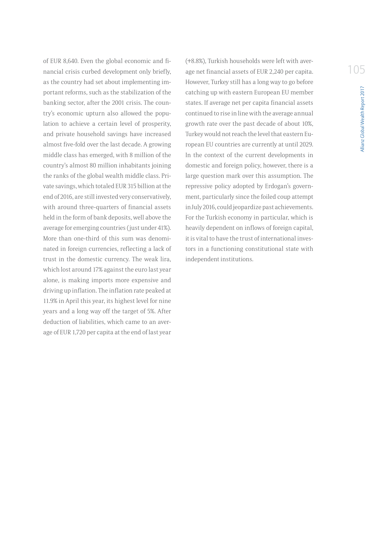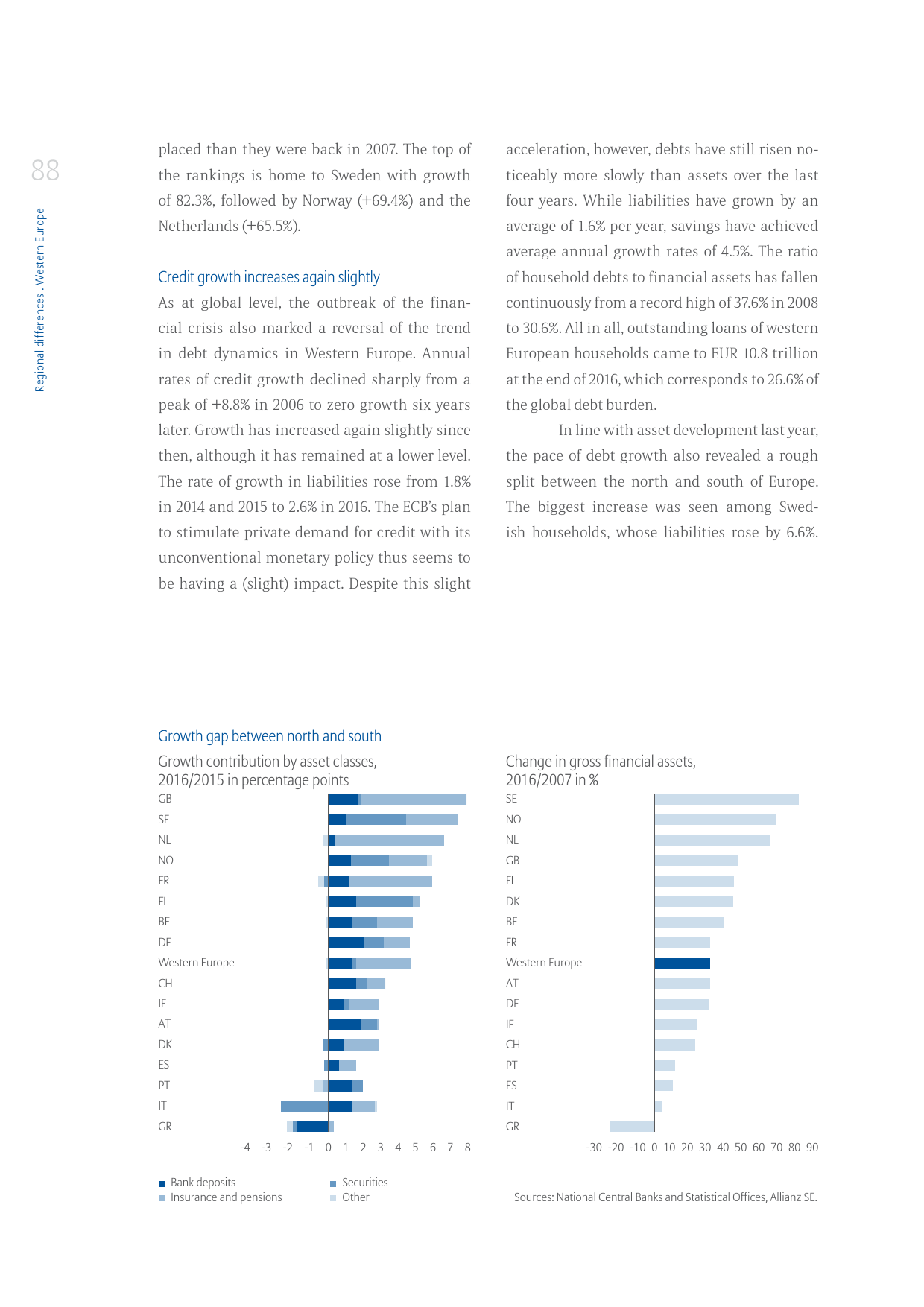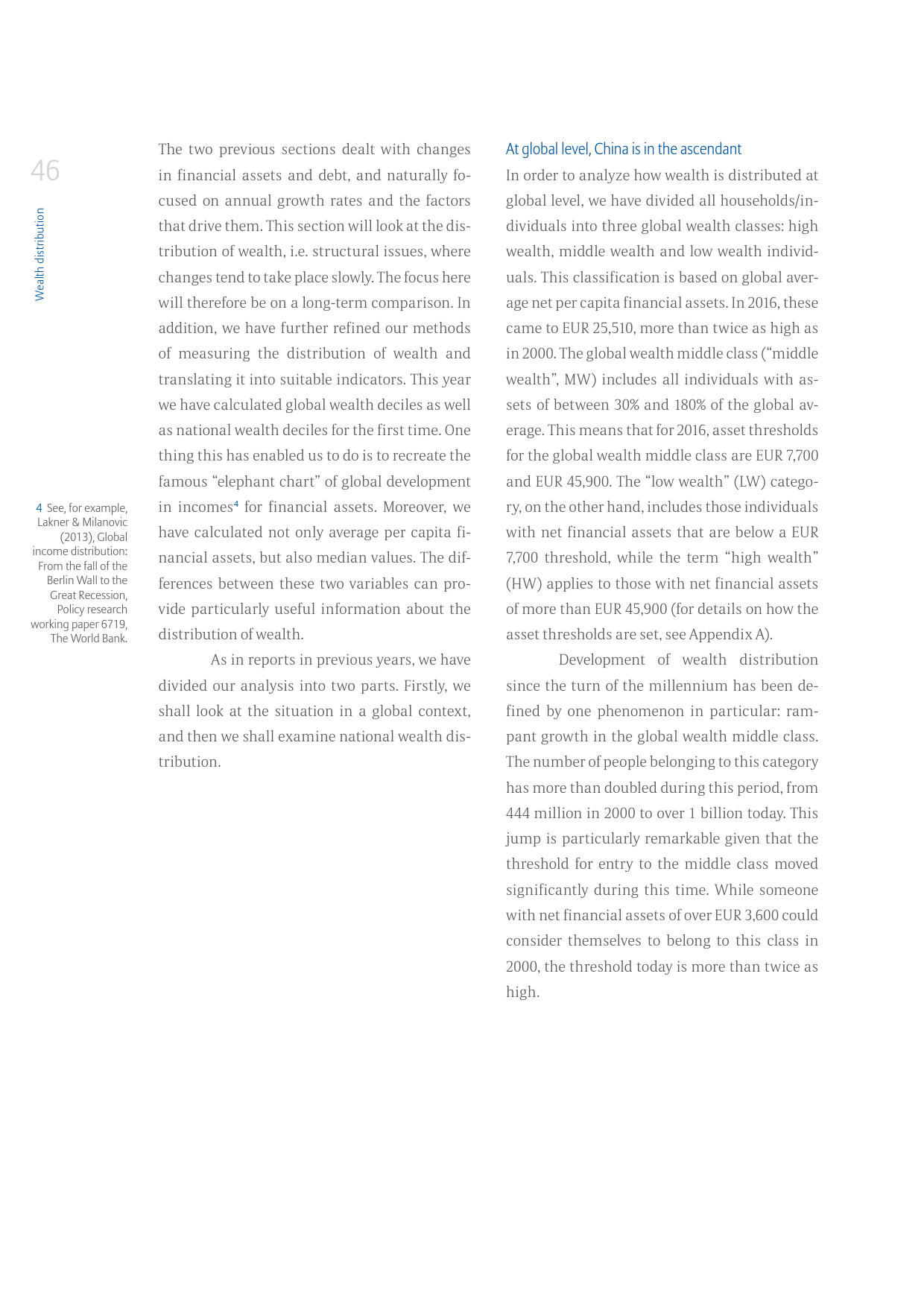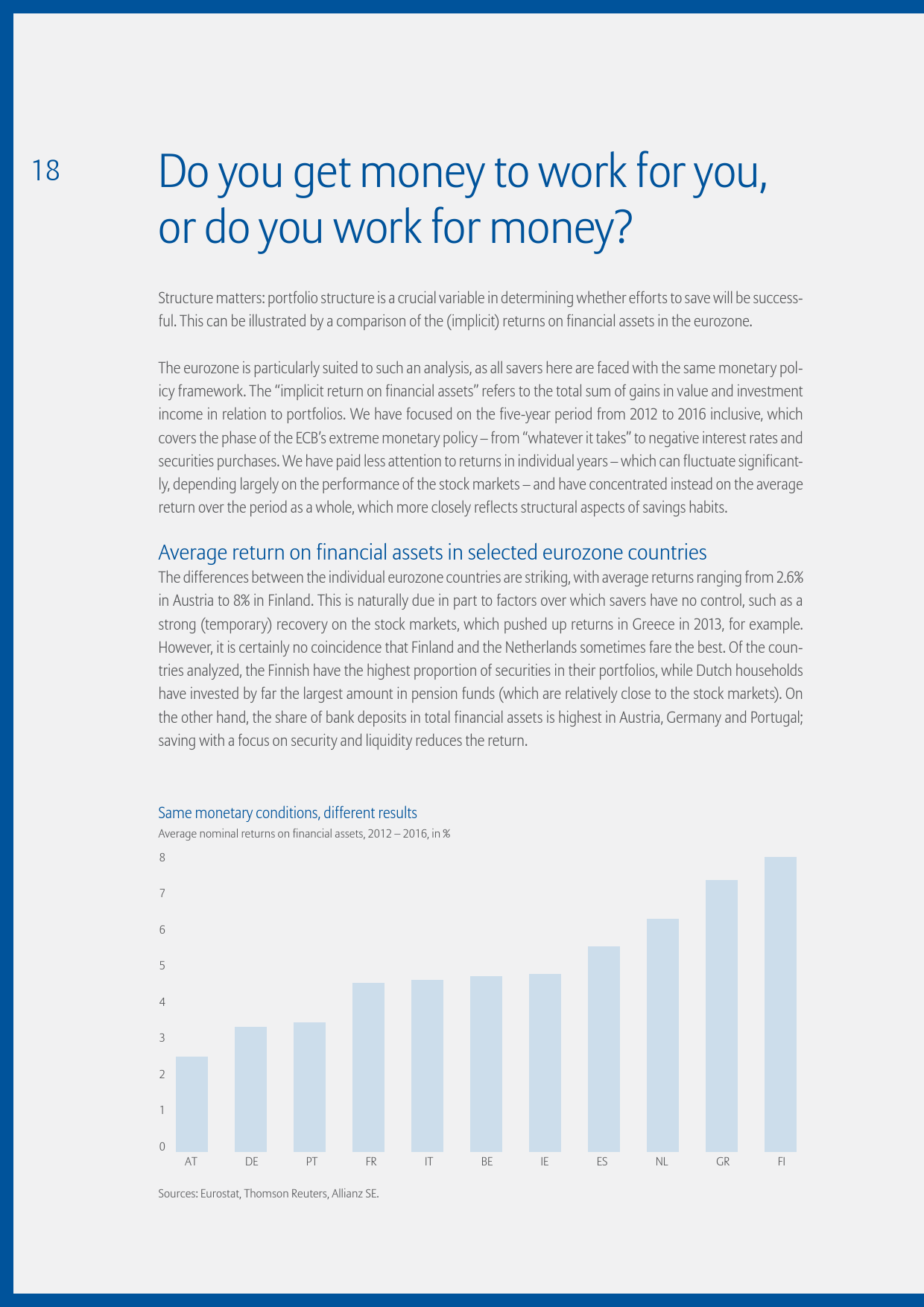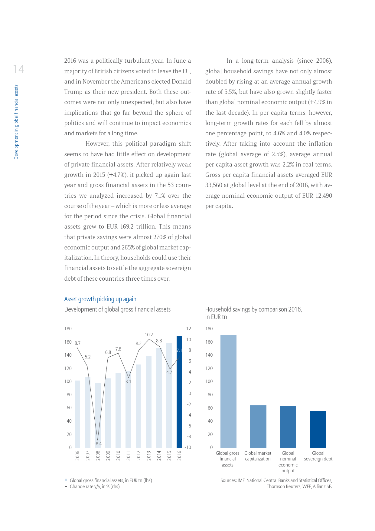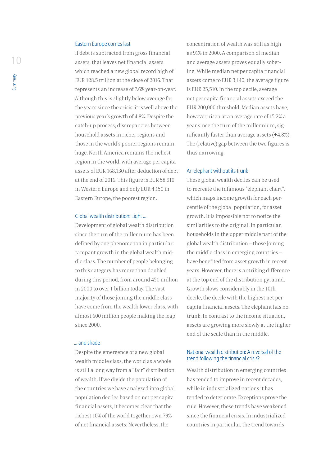 2016年,中国大陆人均金融资产净值为12765欧元,全球排名从2000年的第40位上升至第27位。日本、台湾和新加坡均跻身前20,其中台湾为92360欧元,全球排名第5位。排名第一的是美国,人均金融资产净值为177210欧元。之后为瑞士(175720欧元)、日本(96890欧元)、瑞典(95050欧元)。德国排名第18位(48760欧元)。